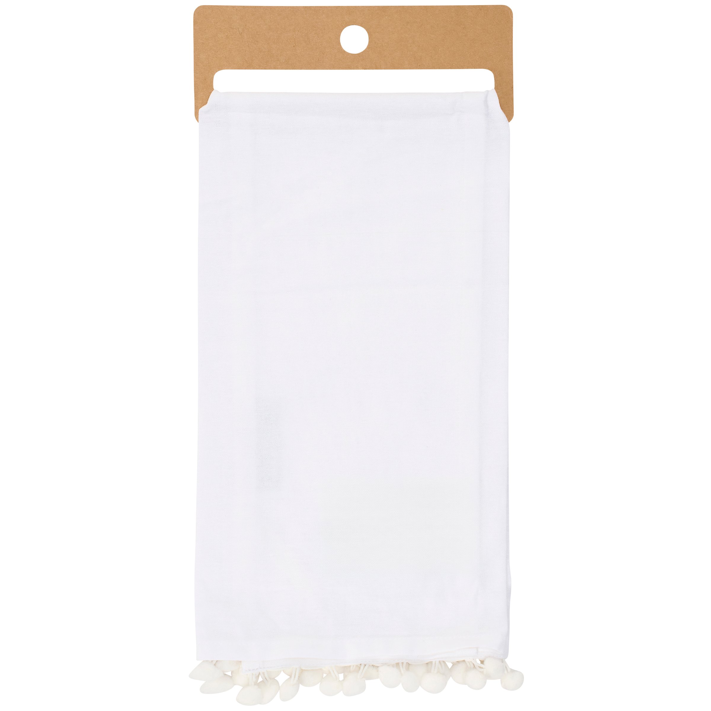 A white cotton kitchen towel from our Christmas Collection displaying a fully embroidered Christmas wreath design with "Merry Christmas" sentiment in the center and metallic gold thread accents throughout. Christmas kitchen towel features a complementing cream pom trim for added interest. Our Merry Christmas Wreath kitchen towel is conveniently machine-washable for easy cleaning. Seasonal kitchen towel is packaged on a cardboard hanger with hole to easily display on rack. A stylish Christmas kitchen accessory perfect for seasonal use.
