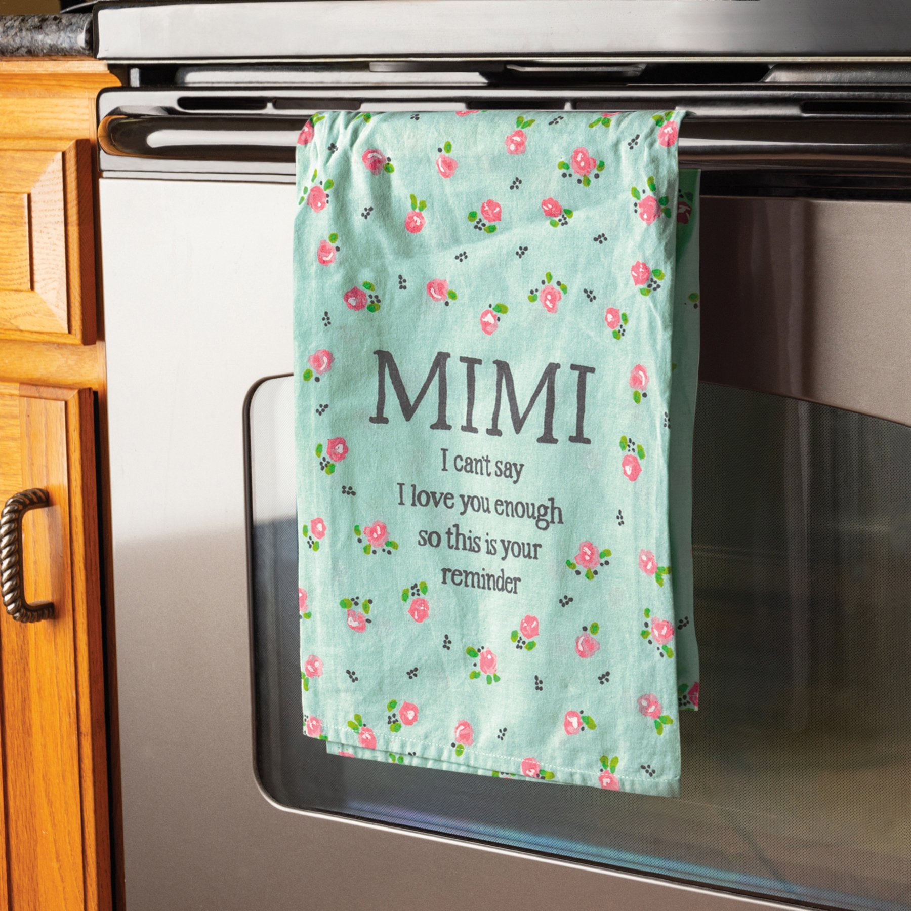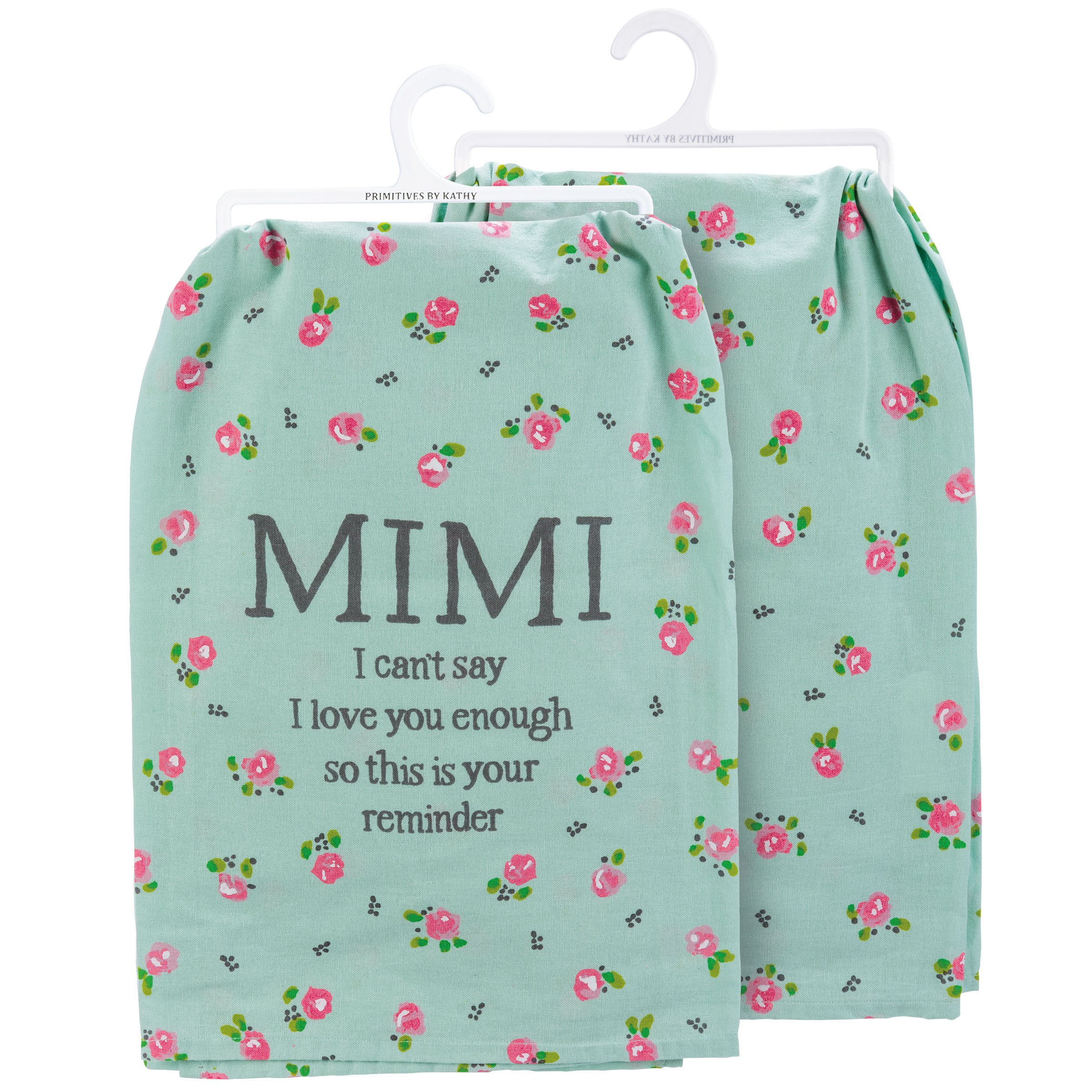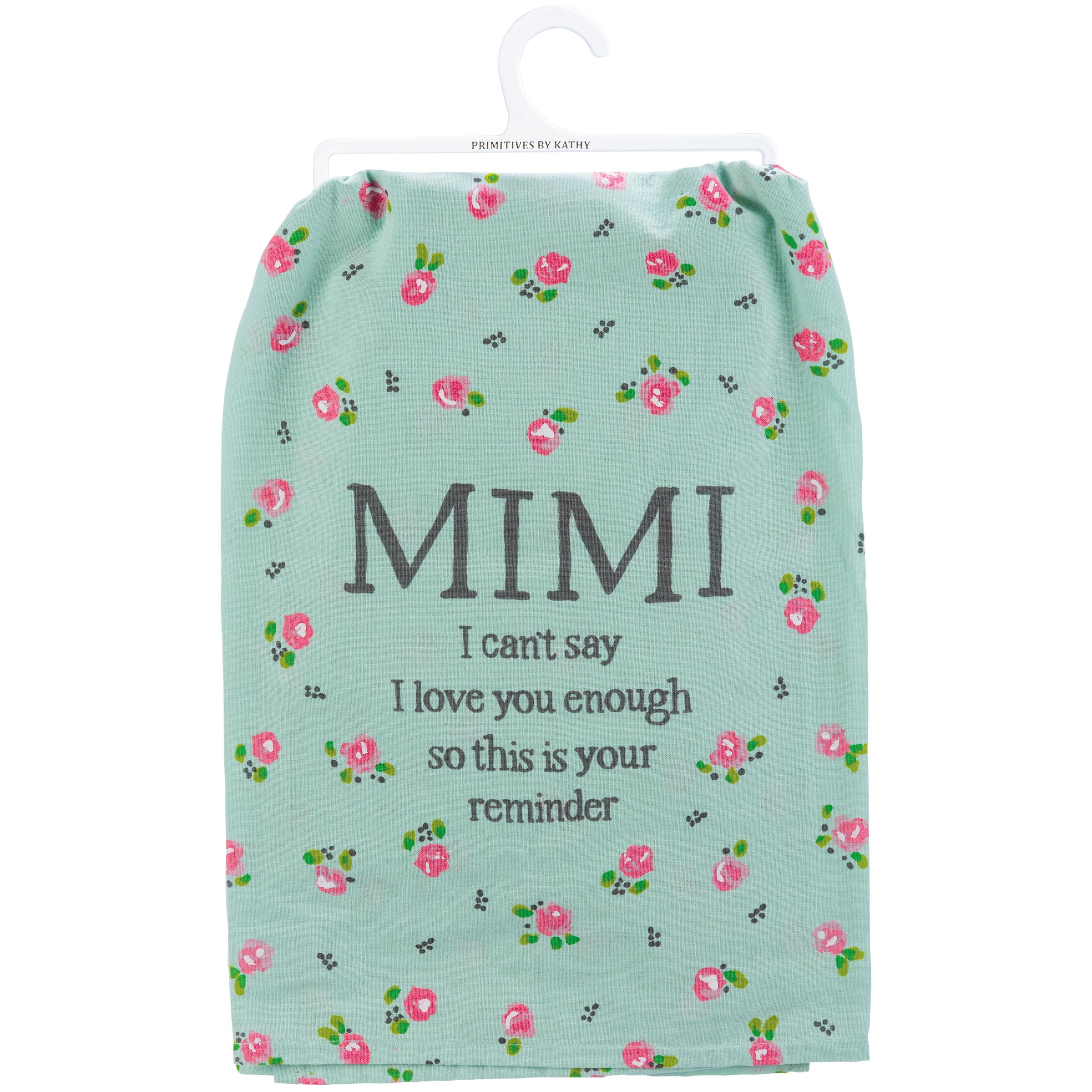 A cotton kitchen towel featuring a hand lettered "Mimi I Can't Say I Love You Enough So This Is Your Reminder" sentiment with an all-over pink floral design. Our Mimi I Can't Say I Love You Enough kitchen towel is machine-washable.