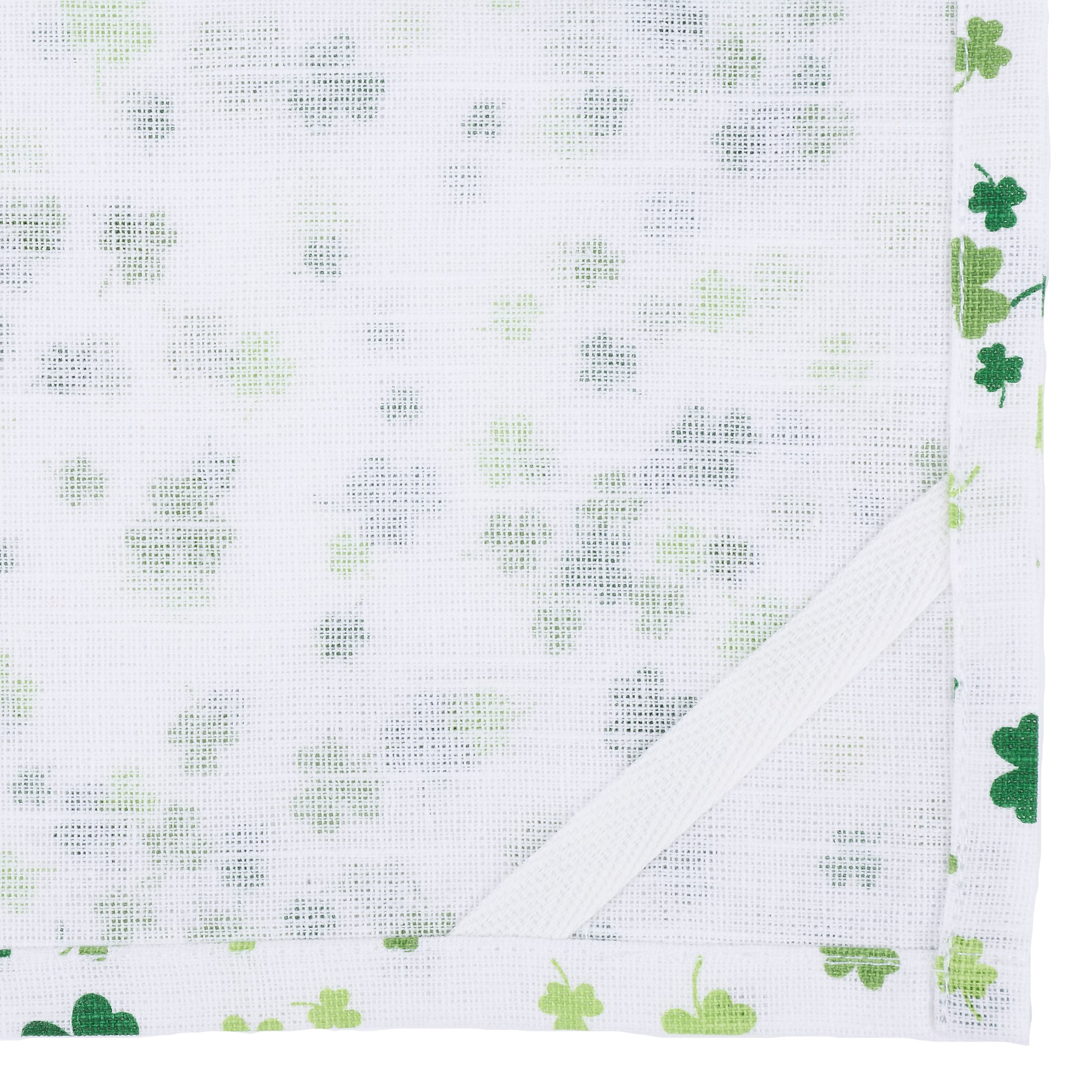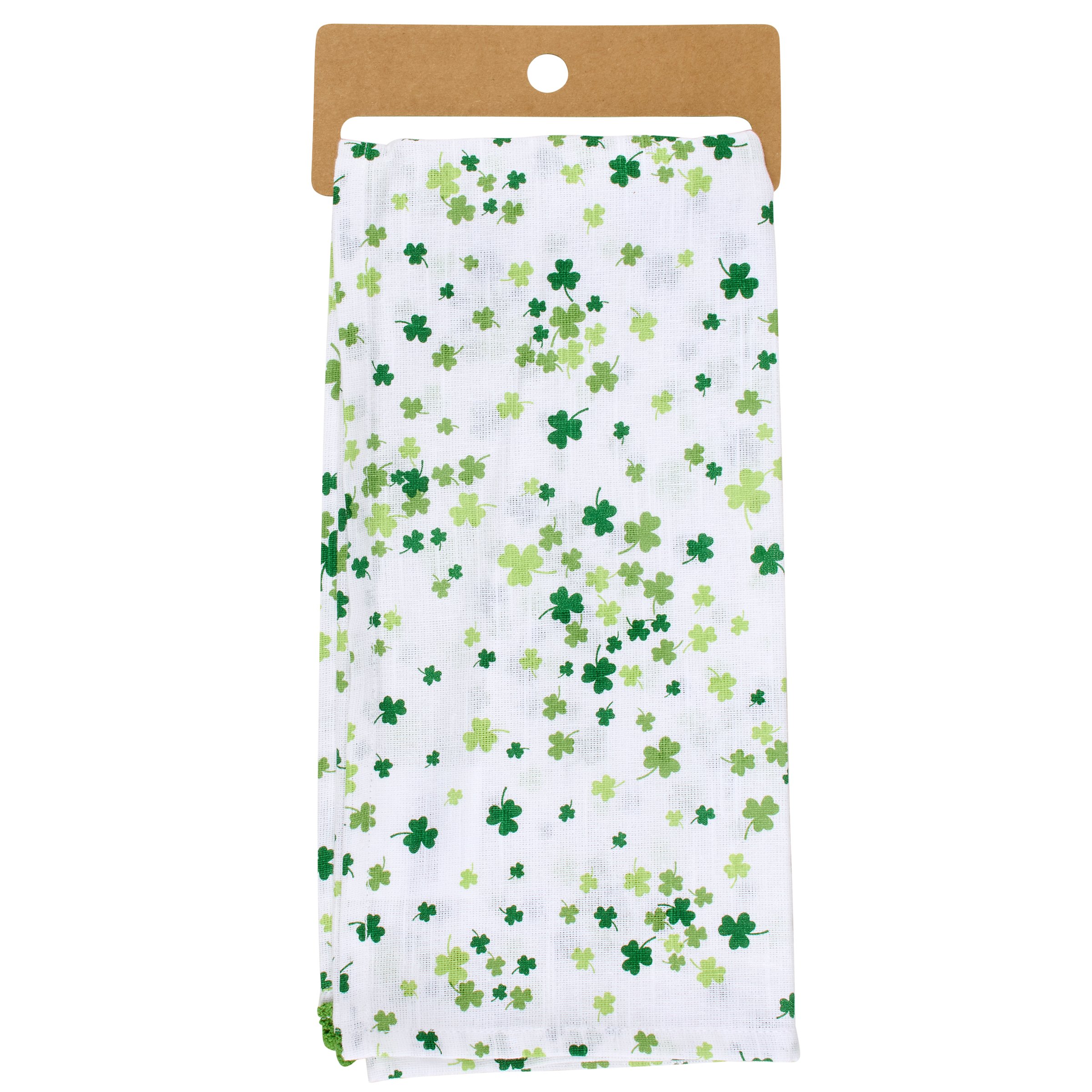 A cotton kitchen towel from ourĀ St. Patrick's Day Collection featuring an all-over design displaying a toss pattern of small shamrocks. St. Patrick's Day towel features a coordinating green lace trim for added interest. Our Mini Shamrocks kitchen towel is conveniently machine-washable for easy cleaning. Seasonal towel is packaged on a cardboard hanger with hole to easily display on rack. A stylish shamrock-themed kitchen accessory perfect for seasonal use.