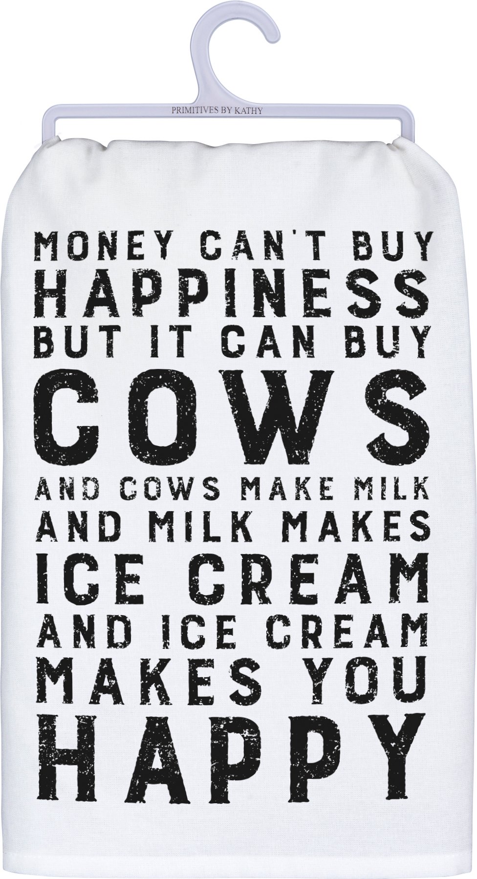 A black and white cotton kitchen towel lending a distressed "Money Can't Buy Happiness But It Can Buy Cows And Cows Make Milk And Milk Makes Ice Cream And Ice Cream Makes You Happy" sentiment. Complements well with coordinating design pieces for a rustic decor collection. Machine-washable.