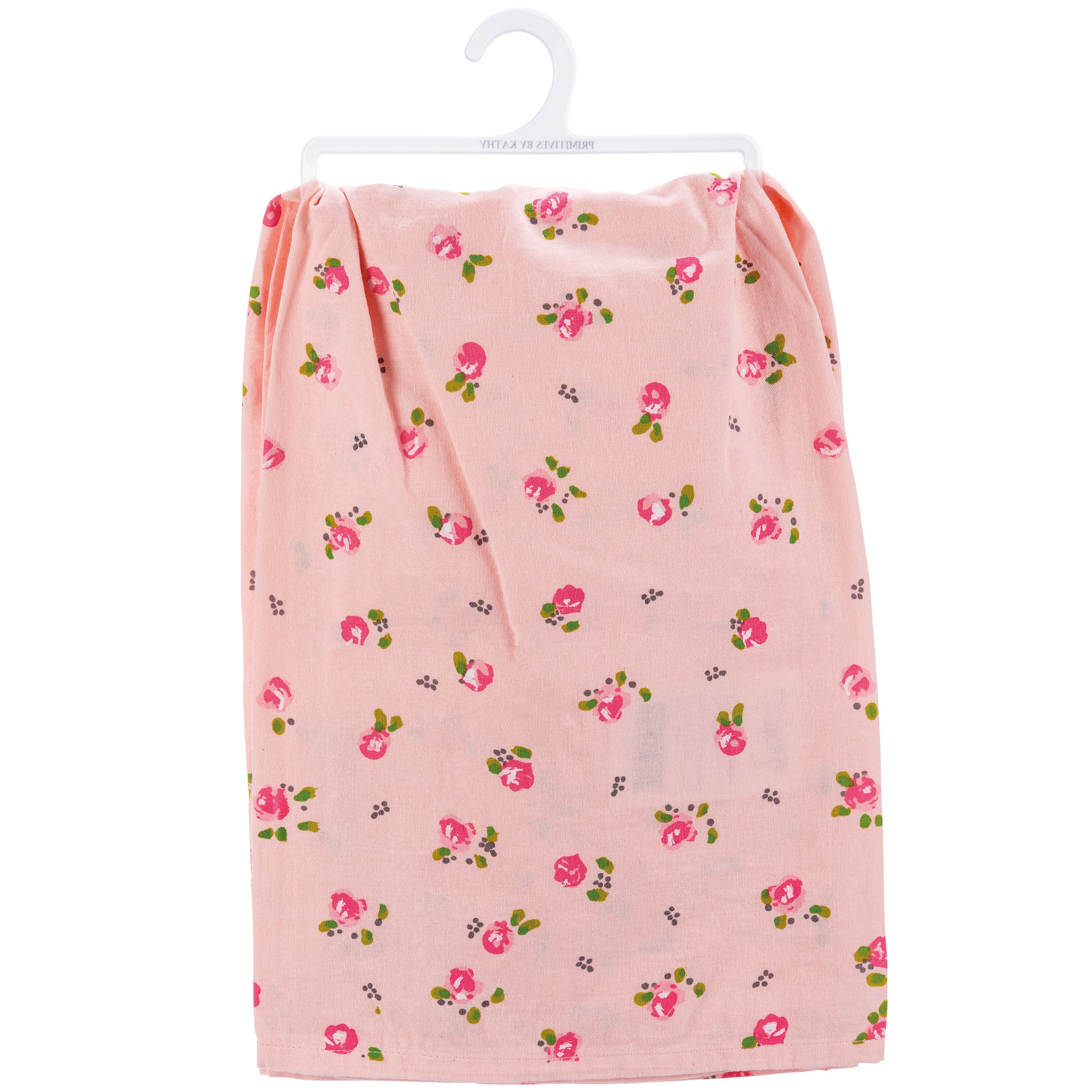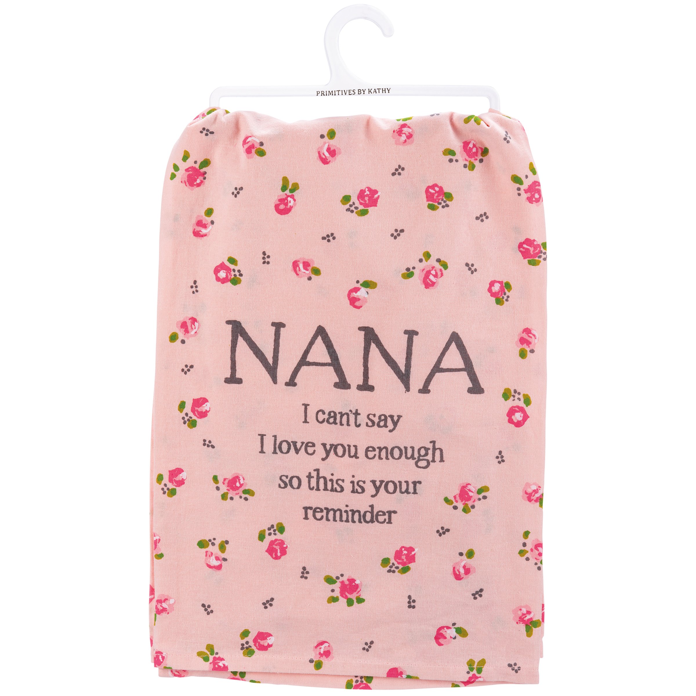 A cotton kitchen towel featuring a hand lettered "Nana I Can't Say I Love You Enough So This Is Your Reminder" sentiment with an all-over pink floral design. Our Nana I Can't Say I Love You Enough kitchen towel is machine-washable.