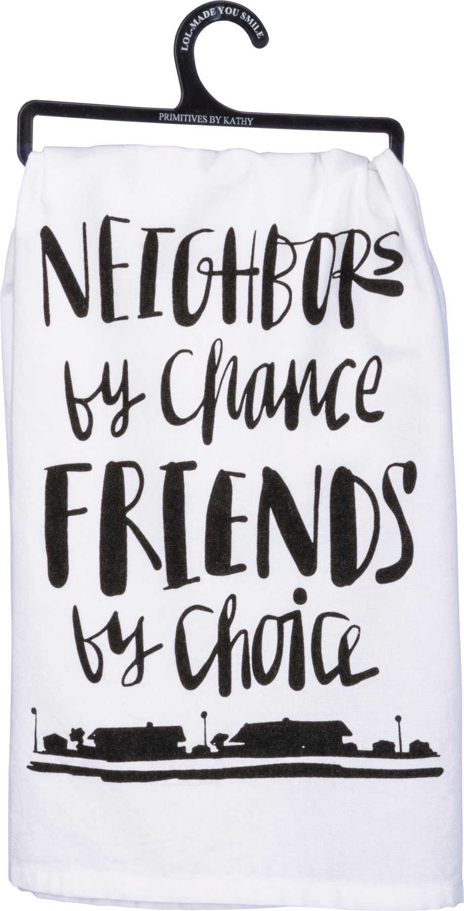 A black and white cotton kitchen towel lending a "Neighbors By Chance Friends By Choice" sentiment with neighborhood design. Machine-washable