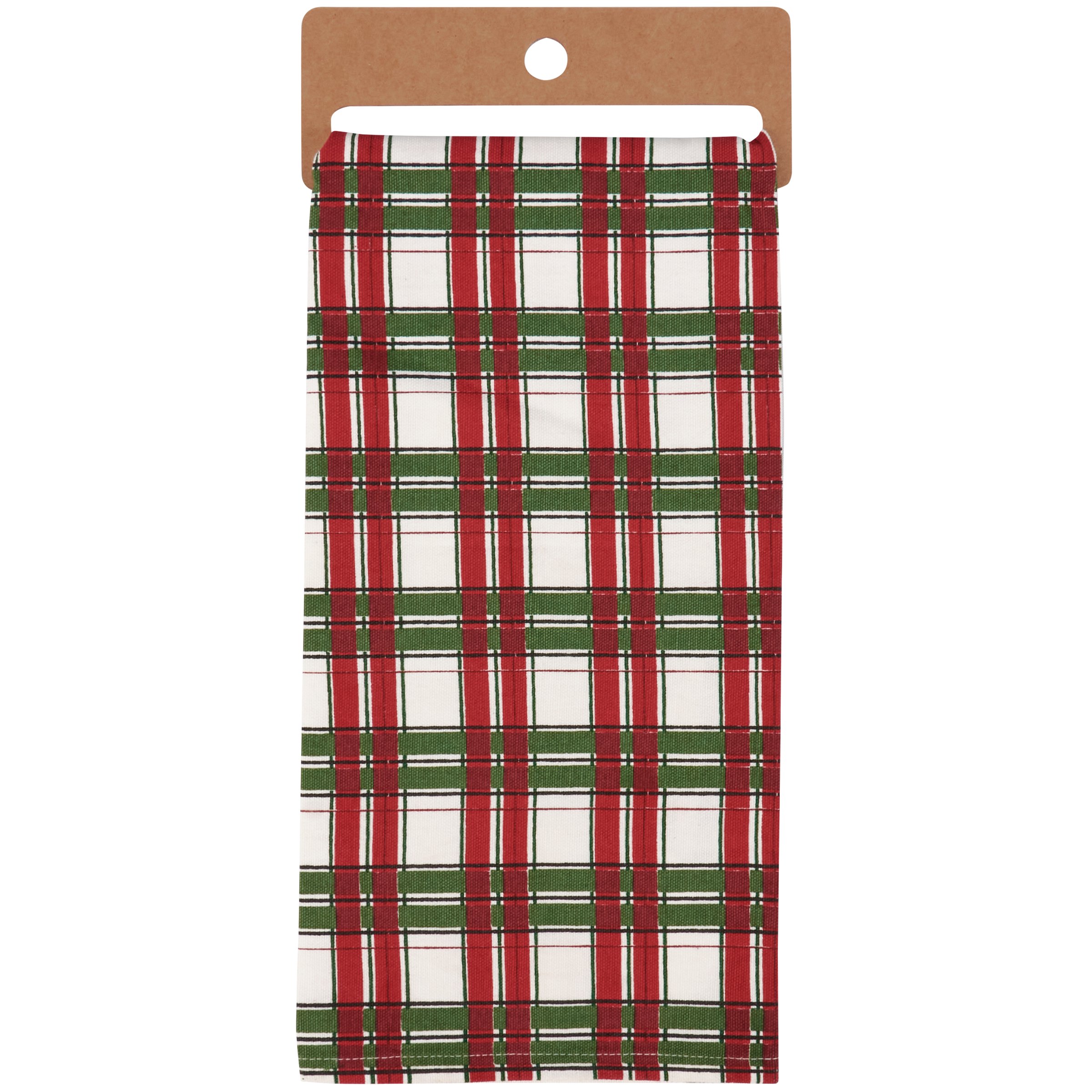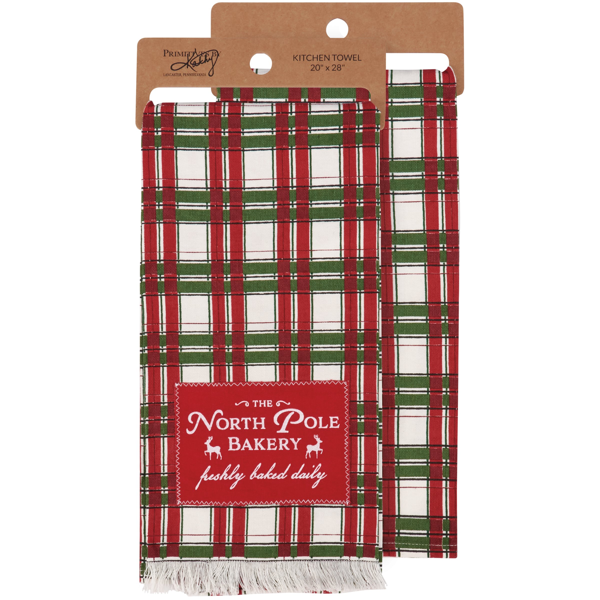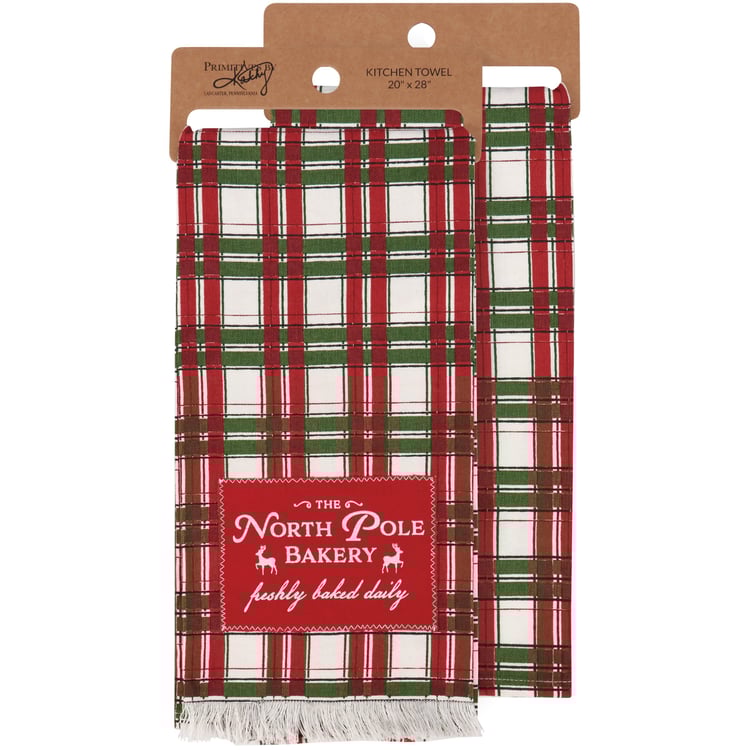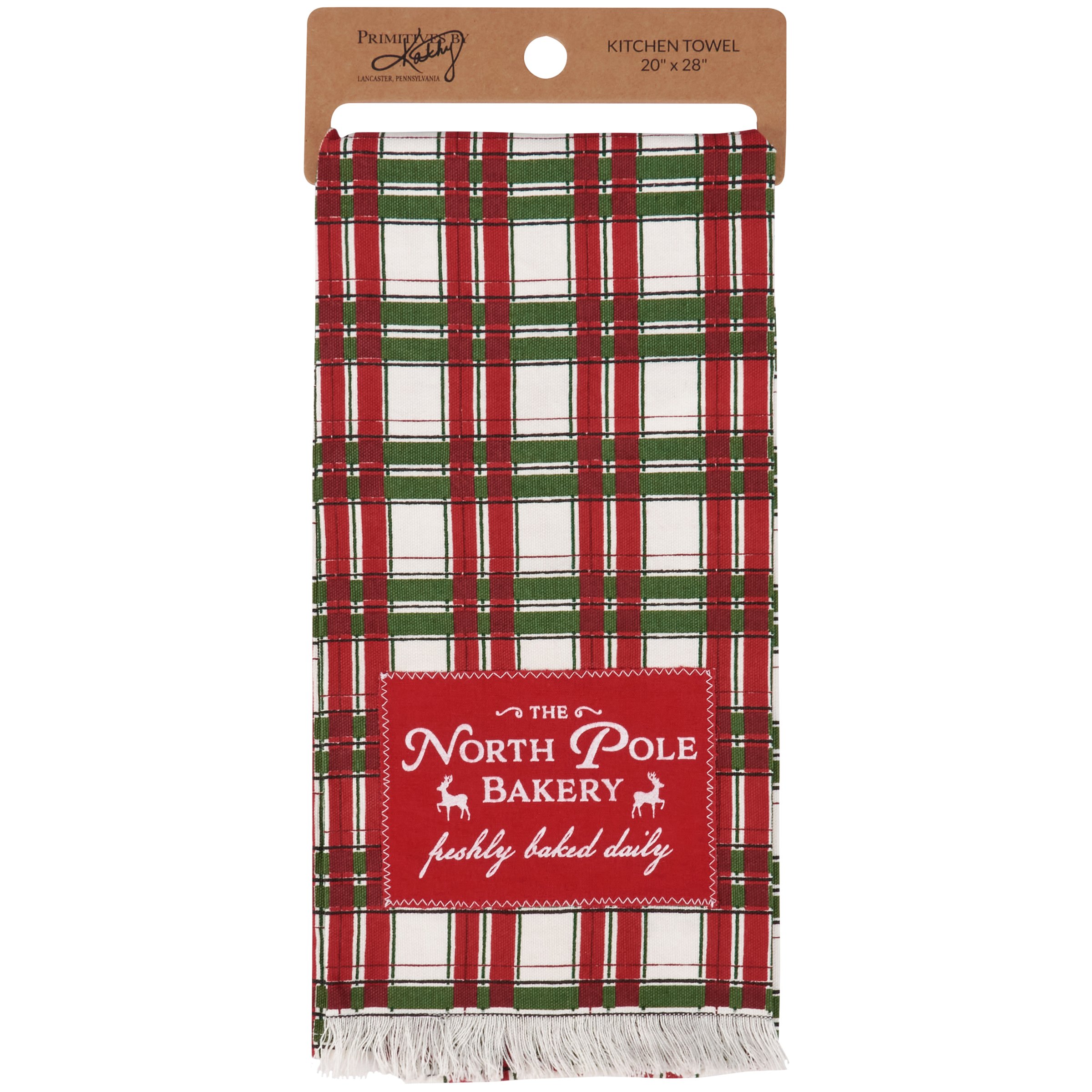 A cotton kitchen towel from our Christmas Collection featuring a stitched art panel and holiday plaid pattern all-over towel. Art panel displays a fun logo inspired design with "The North Pole Bakery - Freshly Baked Daily" and reindeer. Our North Pole Bakery kitchen towel is conveniently machine-washable for easy cleaning. Packaged on a cardboard hanger with hole to easily hang on rack. A charming baking-themed kitchen accessory perfect for seasonal use.