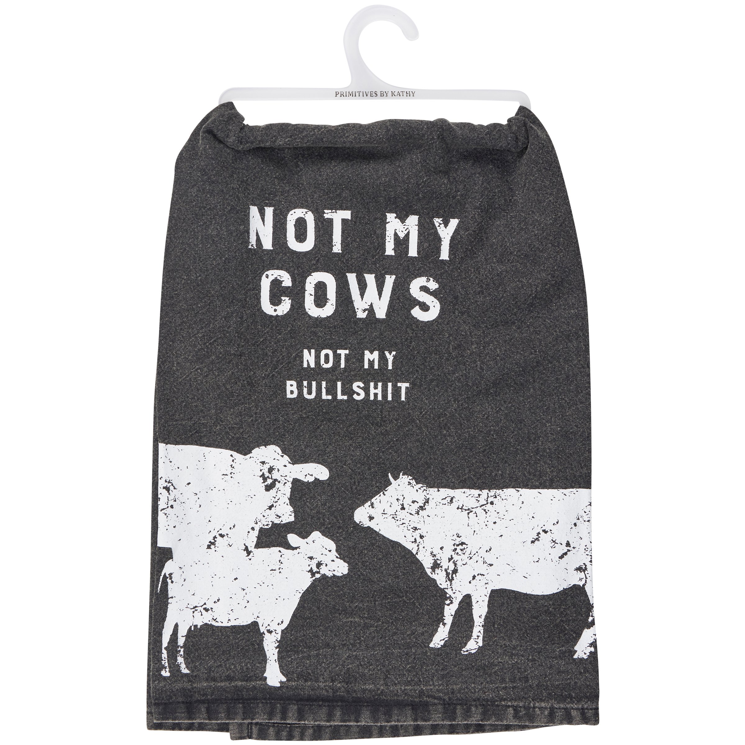 A rustic-inspired cotton kitchen towel from our Farmhouse Collection displaying cow designs on a stonewashed black towel with humorous sentiment that reads "Not My Cows - Not My Bullshit." Our Not My Cows kitchen towel is conveniently machine-washable for easy cleaning. Packaged on a clear plastic hanger to easily display on rack. A farm-themed kitchen accessory perfect for everyday use.