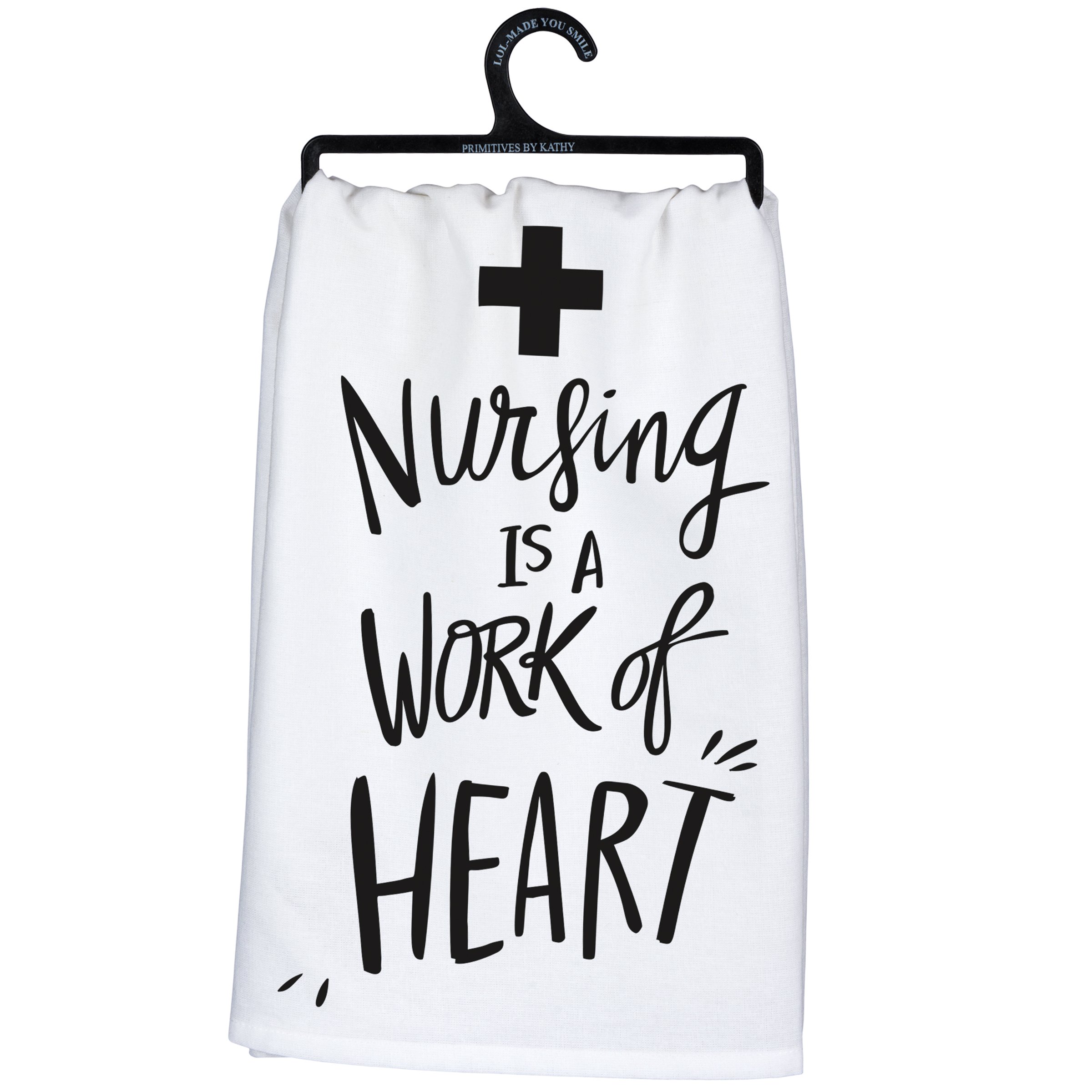 Join us in celebrating healthcare workers with this black and white cotton kitchen towel lending a "Nursing Is A Work Of Heart" sentiment with dozens of varying medical graphics and captions throughout. Machine-washable.
