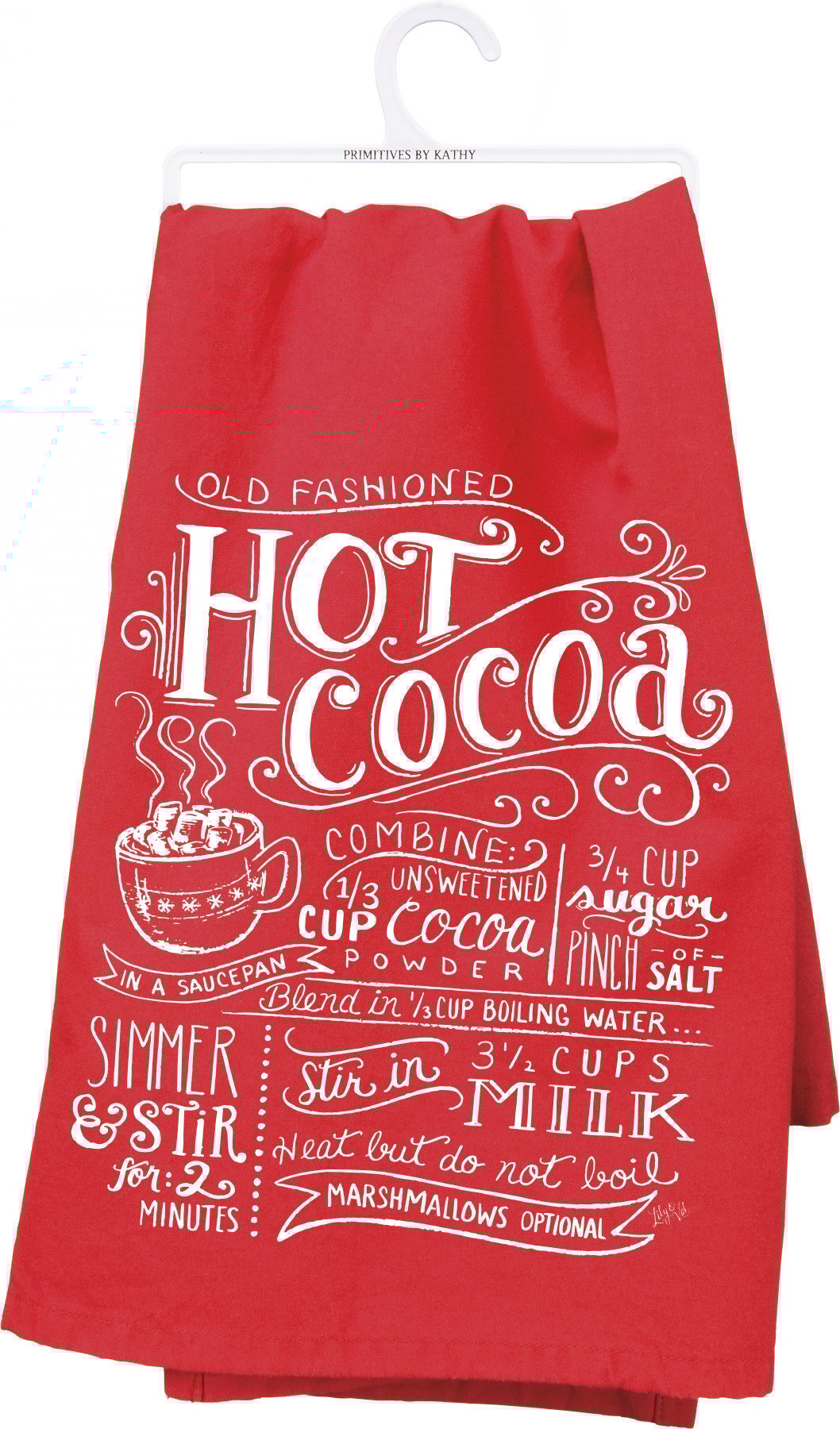 A red and white cotton kitchen towel lending a hand lettered "Old Fashioned Hot Cocoa" recipe sentiment. Complements well with existing kitchen decor. Machine-washable.