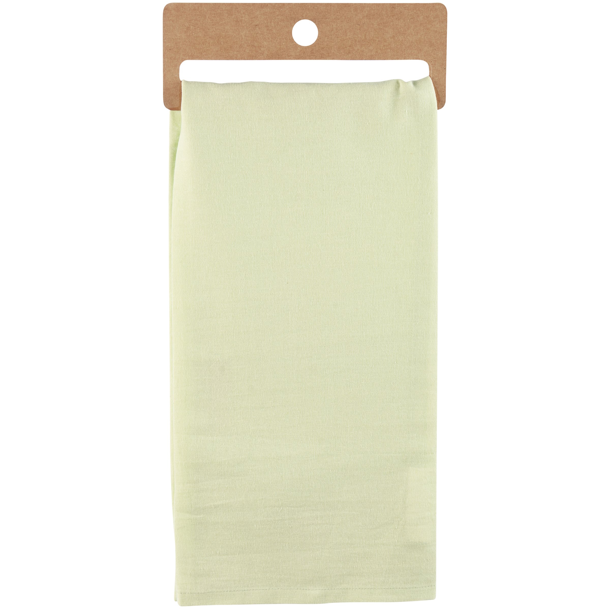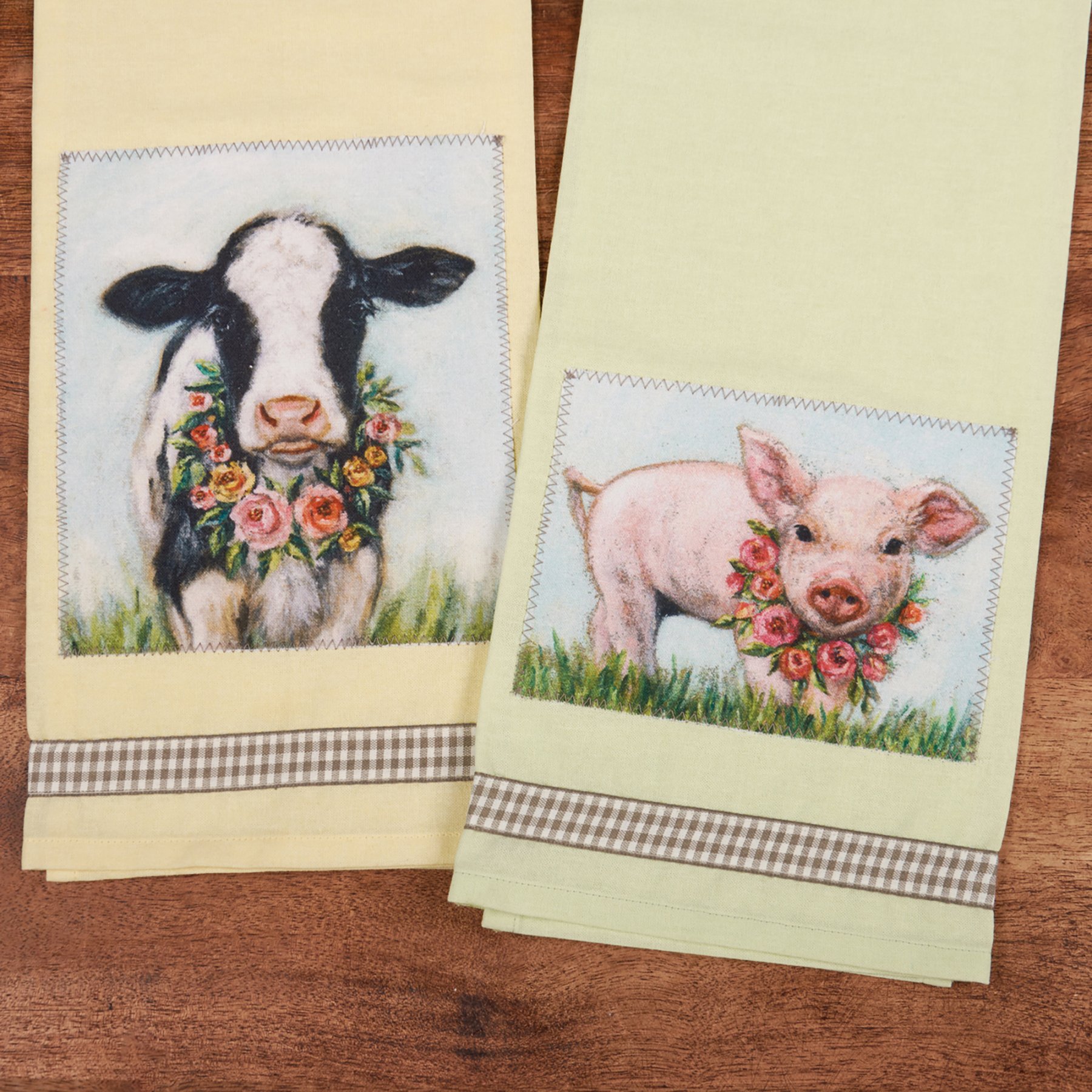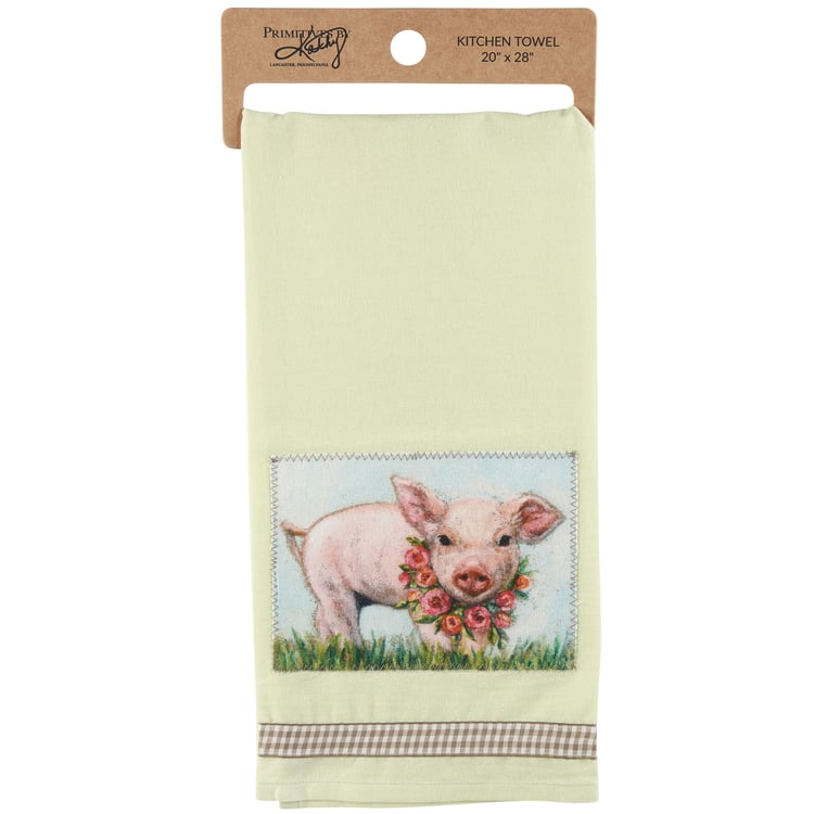 A charming green cotton kitchen towel from our Easter & Spring Collection featuring a stitched art panel and gray gingham ribbon. Art panel displays a hand painted design of a piglet wearing a wreath of flowers. Design is replicated from original artwork painted onto burlap canvas, giving the art a unique depth and texture. Our Piglet And Wreath kitchen towel is machine-washable for convenient cleaning. Packaged on a cardboard hanger with hole to easily hang on rack.