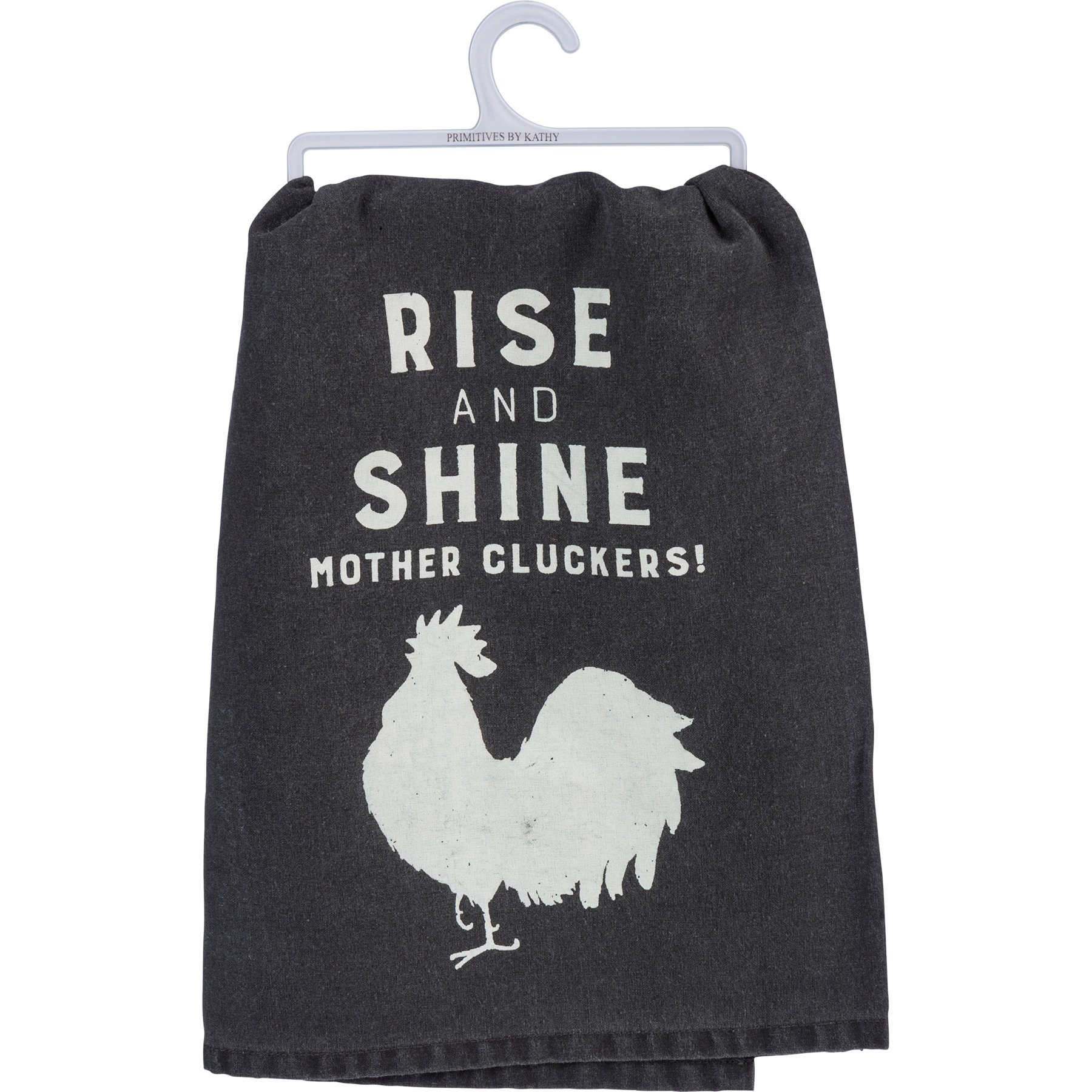 A cotton kitchen towel lending a distressed "Rise And Shine Mother Cluckers!" sentiment with chicken silhouette design. Complements well with coordinating design pieces for a rustic decor collection. Machine-washable.