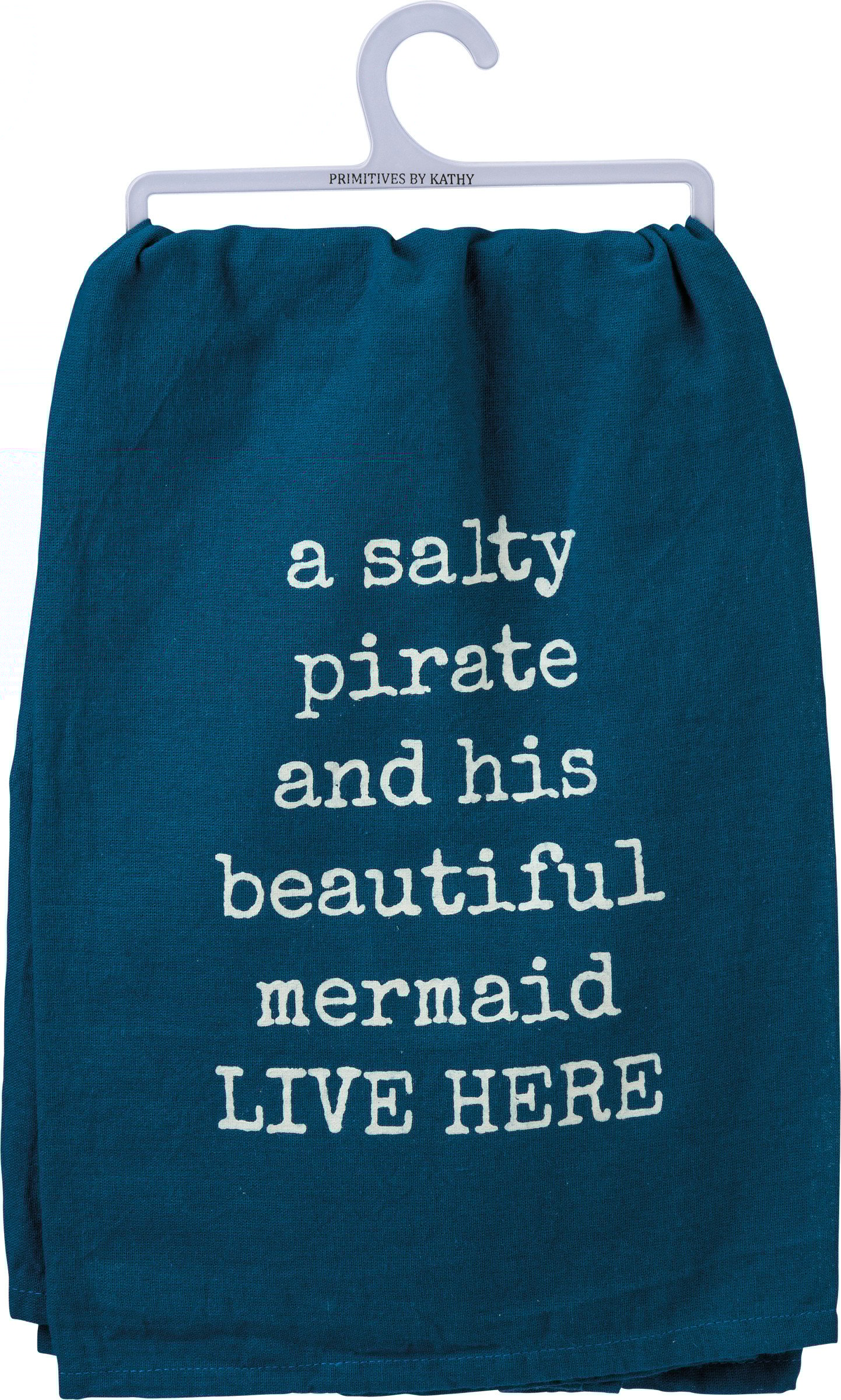 A cotton kitchen towel featuring a typeset "A Salty Pirate And His Beautiful Mermaid Live Here" sentiment in a beach-inspired palette. Machine-washable.