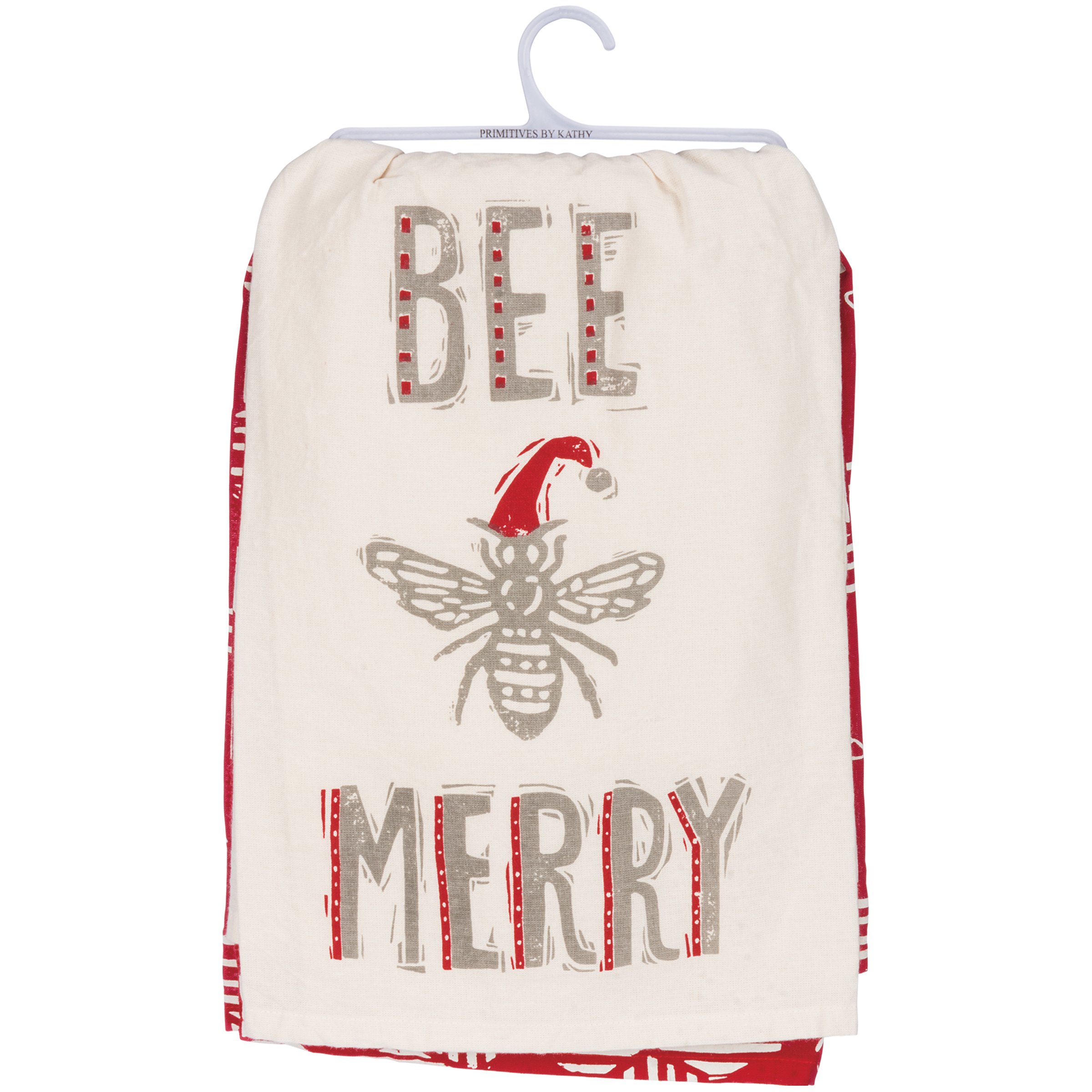 Set of two Christmas-themed kitchen towels featuring intricate, age-old block carving and printmaking techniques. One towel lends "Bee Merry" sentiment with bumblebee in a Santa hat design and is paired with a coordinating replicated honeycomb and bee patterned towel. Complements well with similar block print pieces to make for a festive collection. Machine-washable.