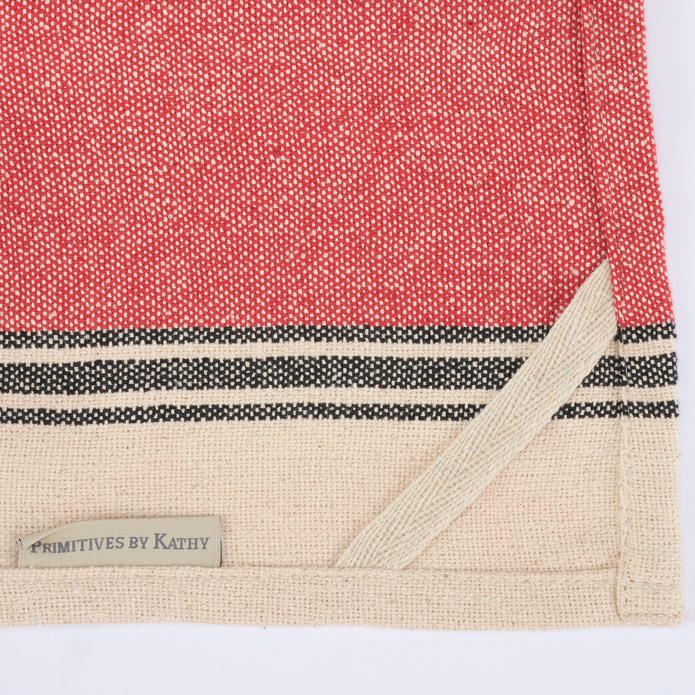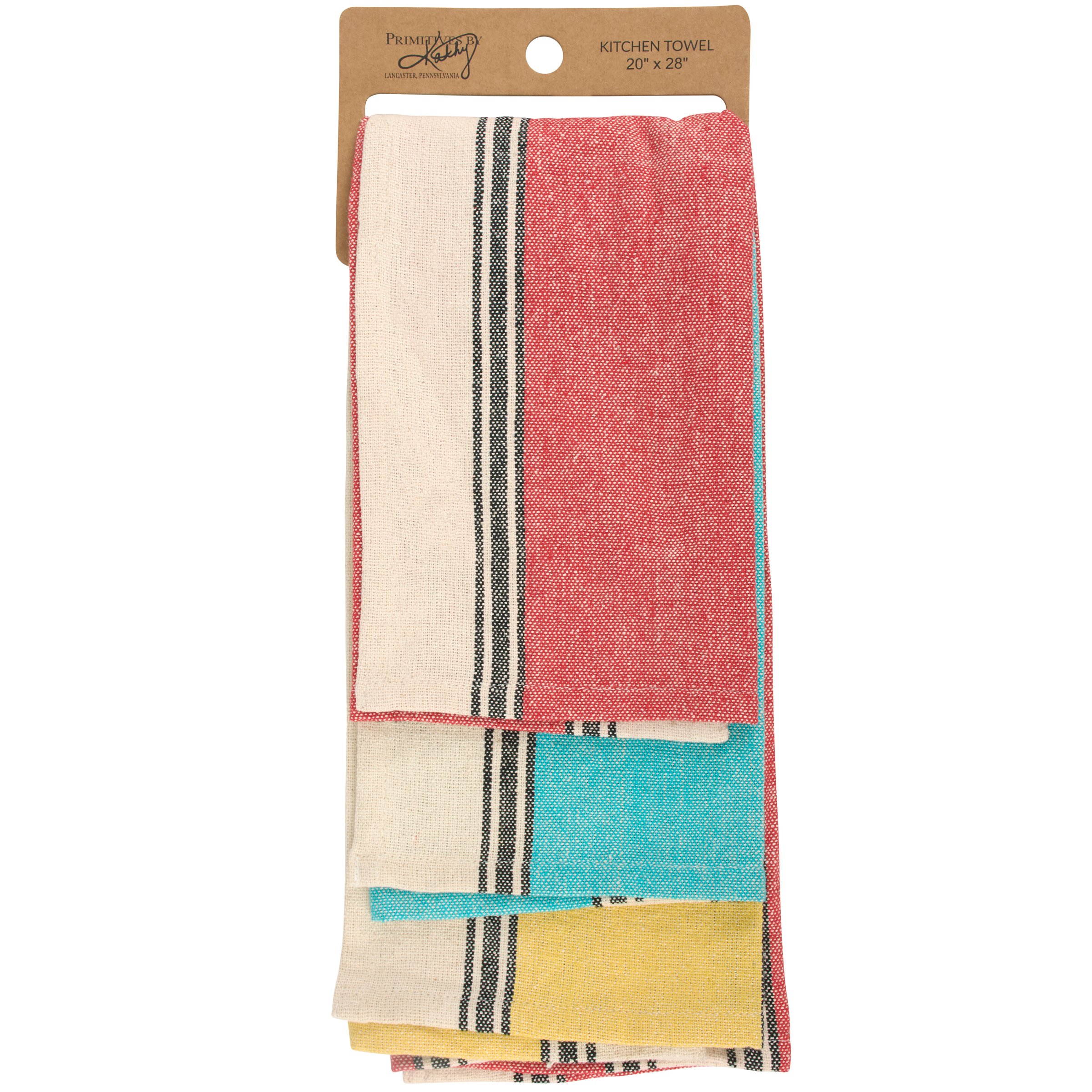 A set of cotton kitchen towel from our Lake & Cabin Collection including 3 towels with coordinating woven color bloc stripe designs inspired by vintage summer camp style. Our Color Bloc kitchen towel set is conveniently machine-washable for easy cleaning. Camp kitchen towel set is packaged together on a cardboard hanger with hole to easily display on rack. A set of camping themed kitchen accessories perfect for adding vintage style to cabin or RV.