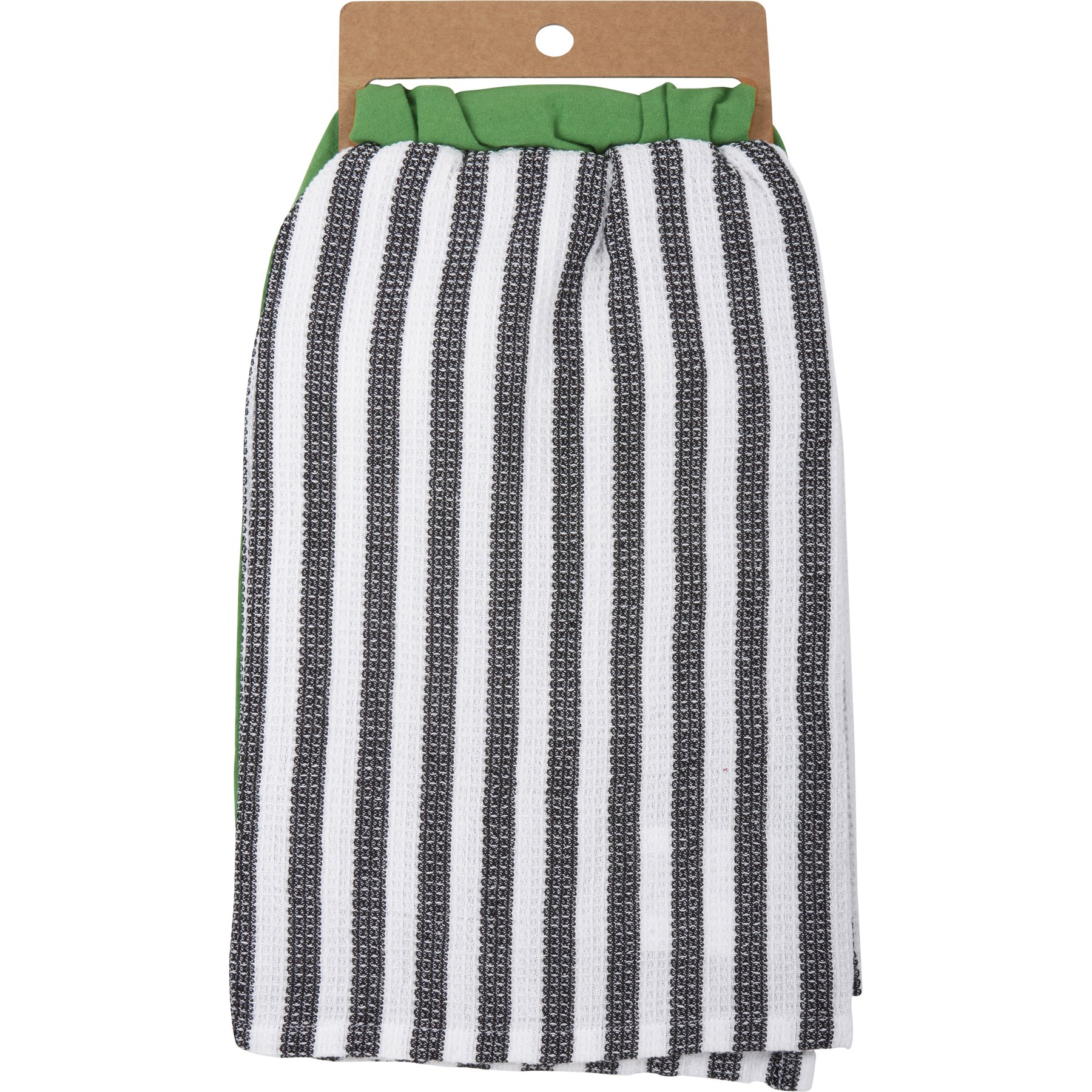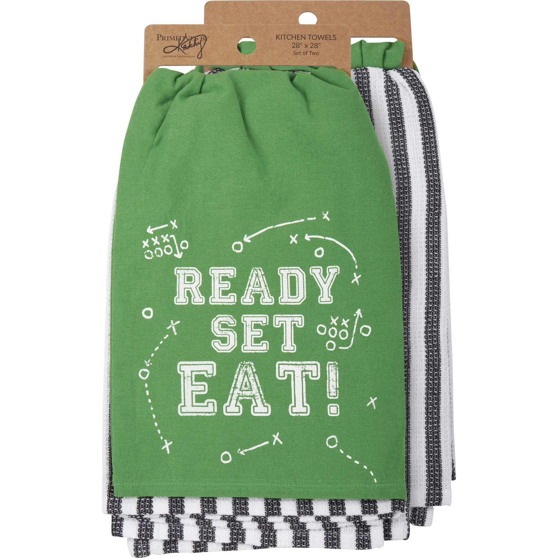 A coordinating kitchen towel set from our Sports Collection displaying a fun gameday party design on each. One towel features "Ready Set Eat!" sentiment and playbook designs on grass green background with referee stripe waffle weave design on the other. Our Ready Set Eat kitchen towel set is machine-washable for convenient cleaning. Both towels come packaged together on a cardboard hanger with hole to easily hang on rack.