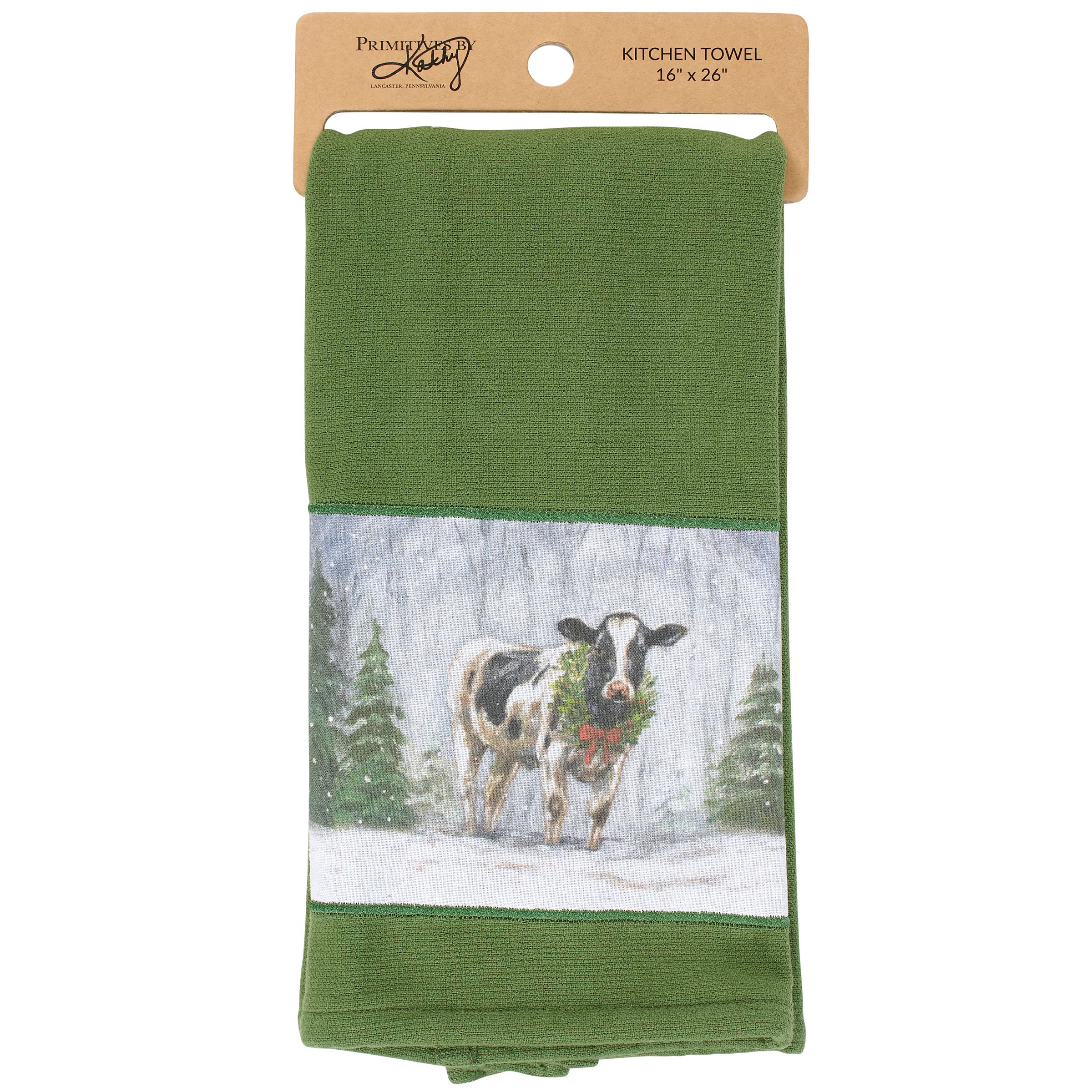 A cotton kitchen towel from our Christmas Collection featuring a farm inspired Christmas design with a stitched art panel and on holiday green towel. Art panel displays a charming winter scene of a dairy cow wearing a holiday wreath replicated from original artwork painted onto burlap canvas, giving the art a unique depth and texture. Christmas cow kitchen towel features a terrycloth layer on the back for added absorbency. Our Snowy Cow kitchen towel is conveniently machine-washable for easy cleaning. Seasonal kitchen towel is packaged on a cardboard hanger with hole to easily display on rack. A farm-themed Christmas kitchen accessory perfect for seasonal use.