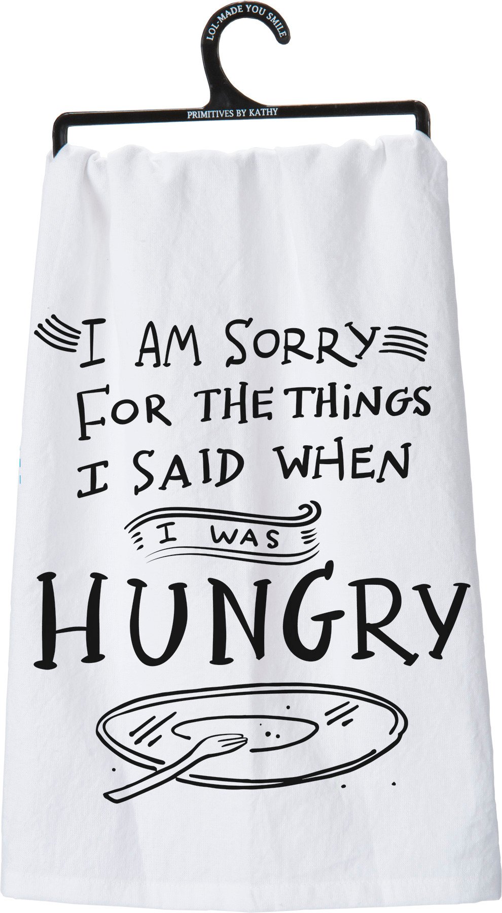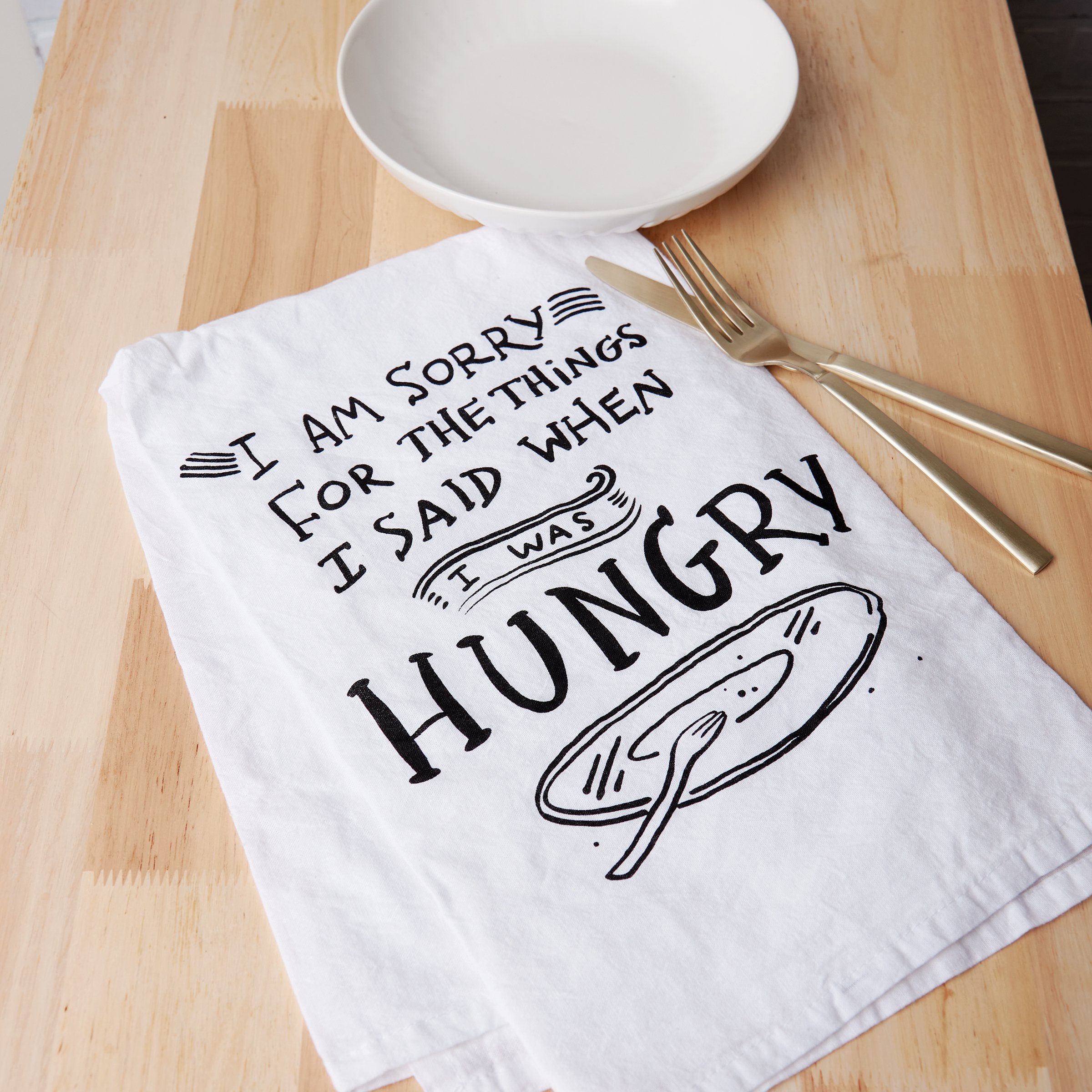 A black and white cotton kitchen towel lending a hand lettered "I Am Sorry For The Things I Said When I Was Hungry" sentiment with empty plate and fork design that complements well with existing kitchen decor. Machine-washable.