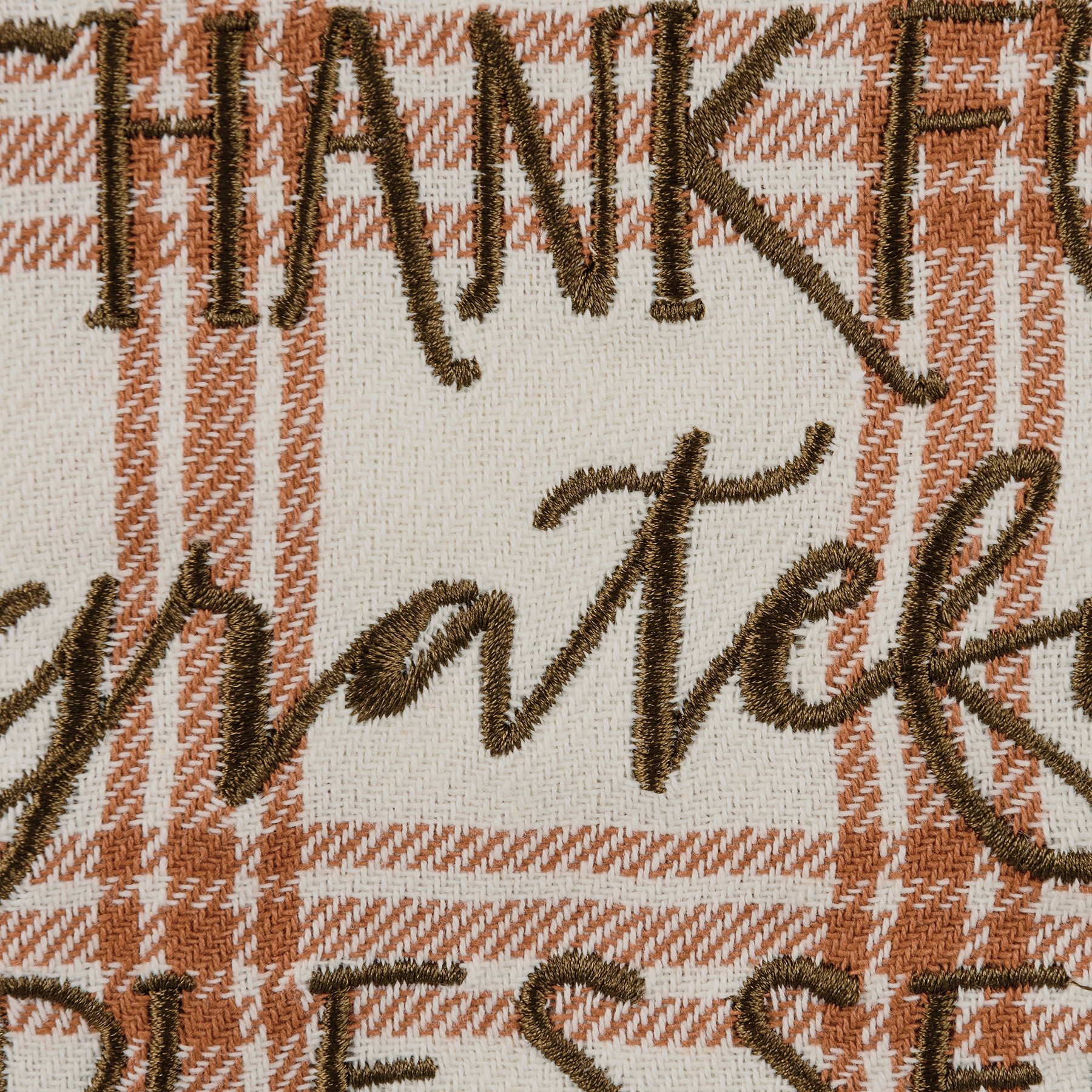 A cotton kitchen towel featuring hand lettered embroidered "Thankful Grateful Blessed" sentiment and orange and cream plaid pattern. Our Thankful Grateful Blessed kitchen towel is machine-washable.