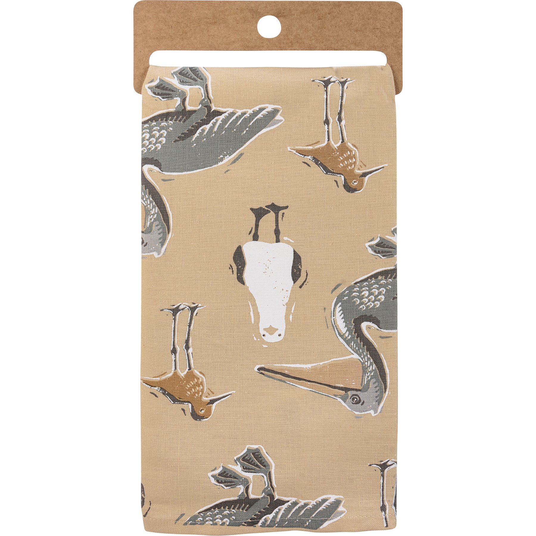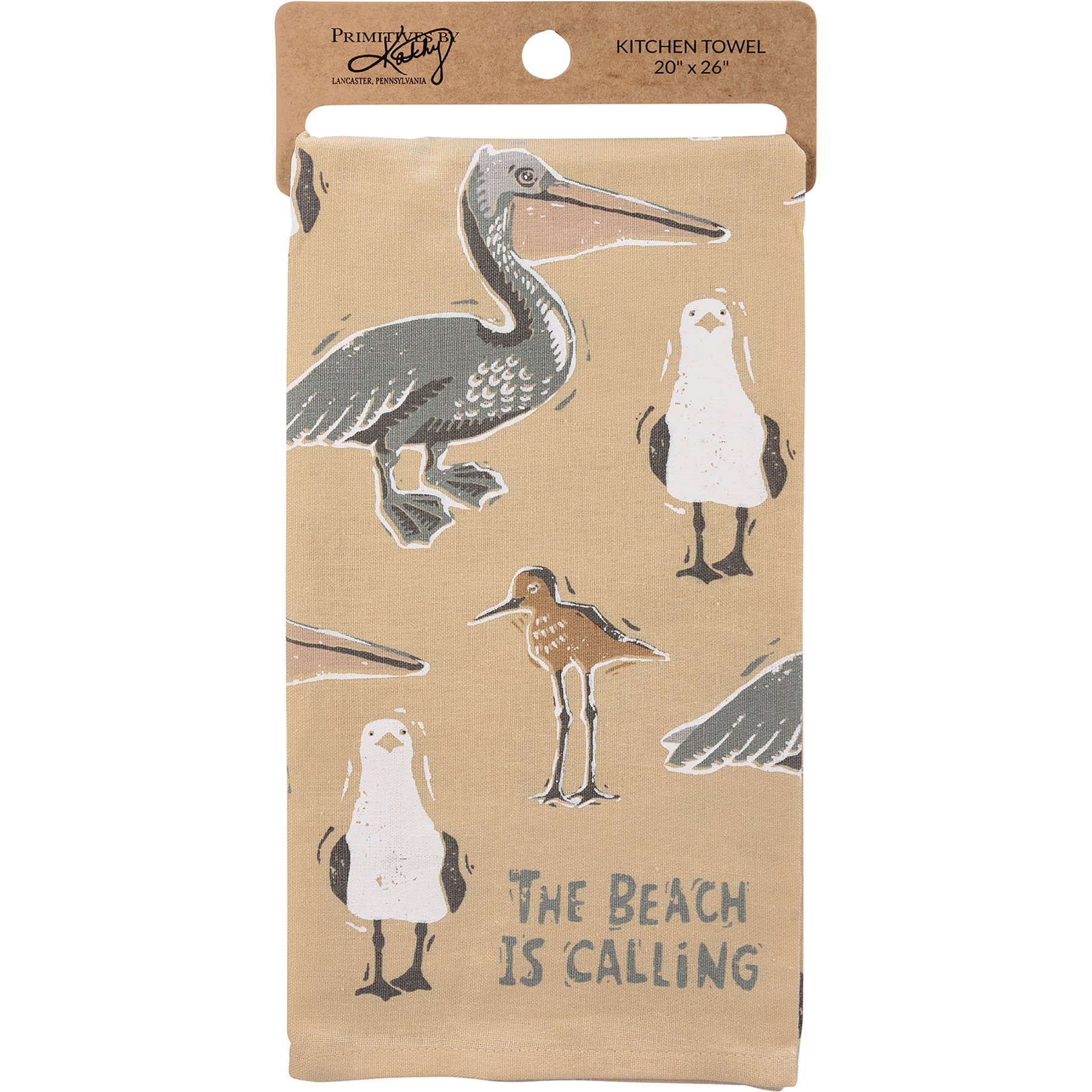 A cotton linen blend kitchen towel featuring an all-over design of various birds popular at beaches with "The Beach Is Calling" sentiment. Our The Beach Is Calling kitchen towel is machine-washable. Towel is packaged on a cardboard hanger with a hole to easily hang on rack.