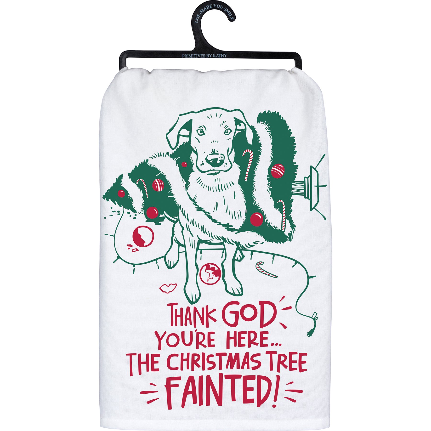 A cotton kitchen towel featuring "Thank God You're Hereā¦The Christmas Tree Fainted!" sentiment with festive dog and tree design. Machine-washable.