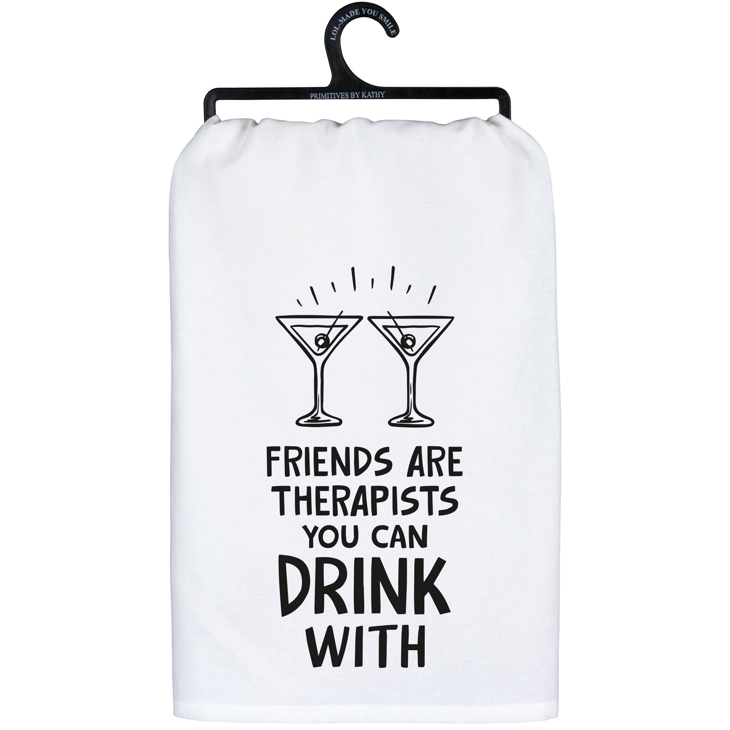 A black and white cotton kitchen towel from our LOL-Made You Smile Collection displaying a fun hand illustrated design of two martinis with a sentiment that reads "Friends Are Therapists You Can Drink With." Our Therapists kitchen towel is conveniently machine-washable for easy cleaning. Packaged on a black plastic hanger to easily display on rack. A fun kitchen accessory perfect for everyday use.