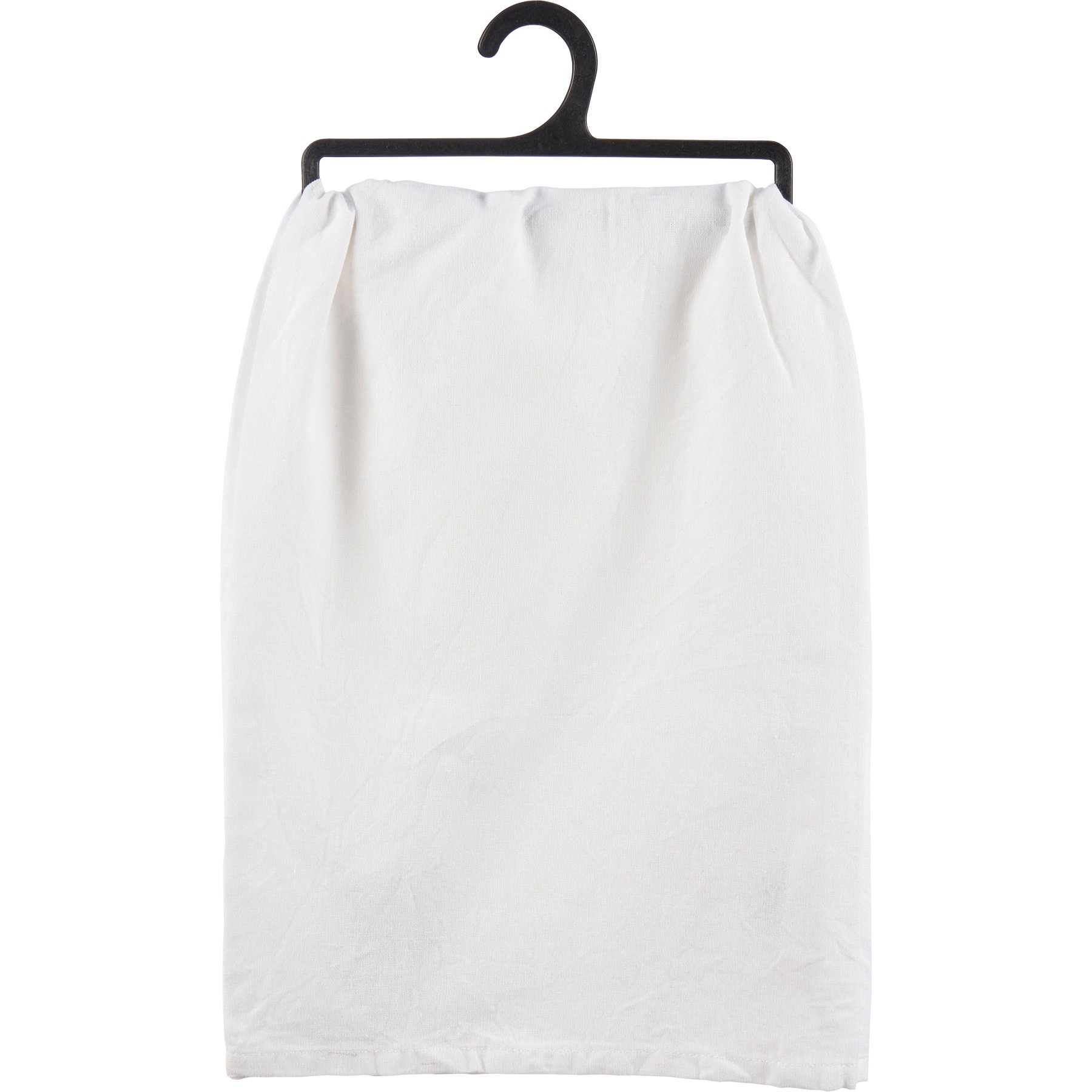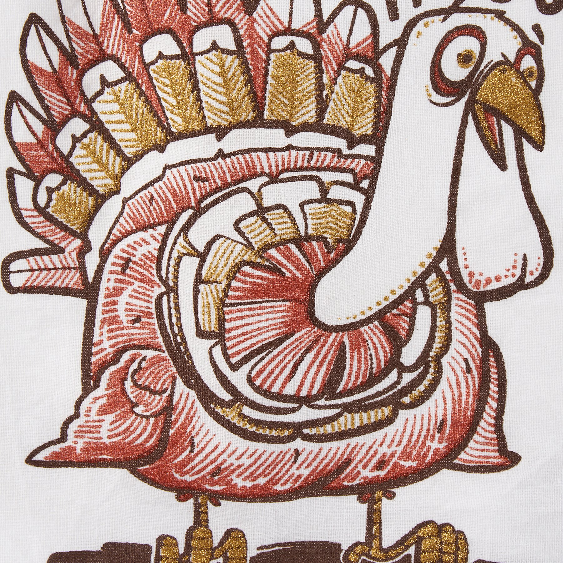 A white cotton kitchen towel from our Fall & Harvest Collection displaying a unique hand illustrated design with glitter accents of shocked turkey with humorous sentiment that reads "They Do What? ...Stuff What Into Where? Oh Hell No... I'm Out!" Design features autumn color palette and glitter accents. Our They Do What? Stuff What kitchen towel is machine-washable for convenient cleaning. Packaged on a black plastic hanger to easily display on rack. A fun and functional seasonal kitchen accent.