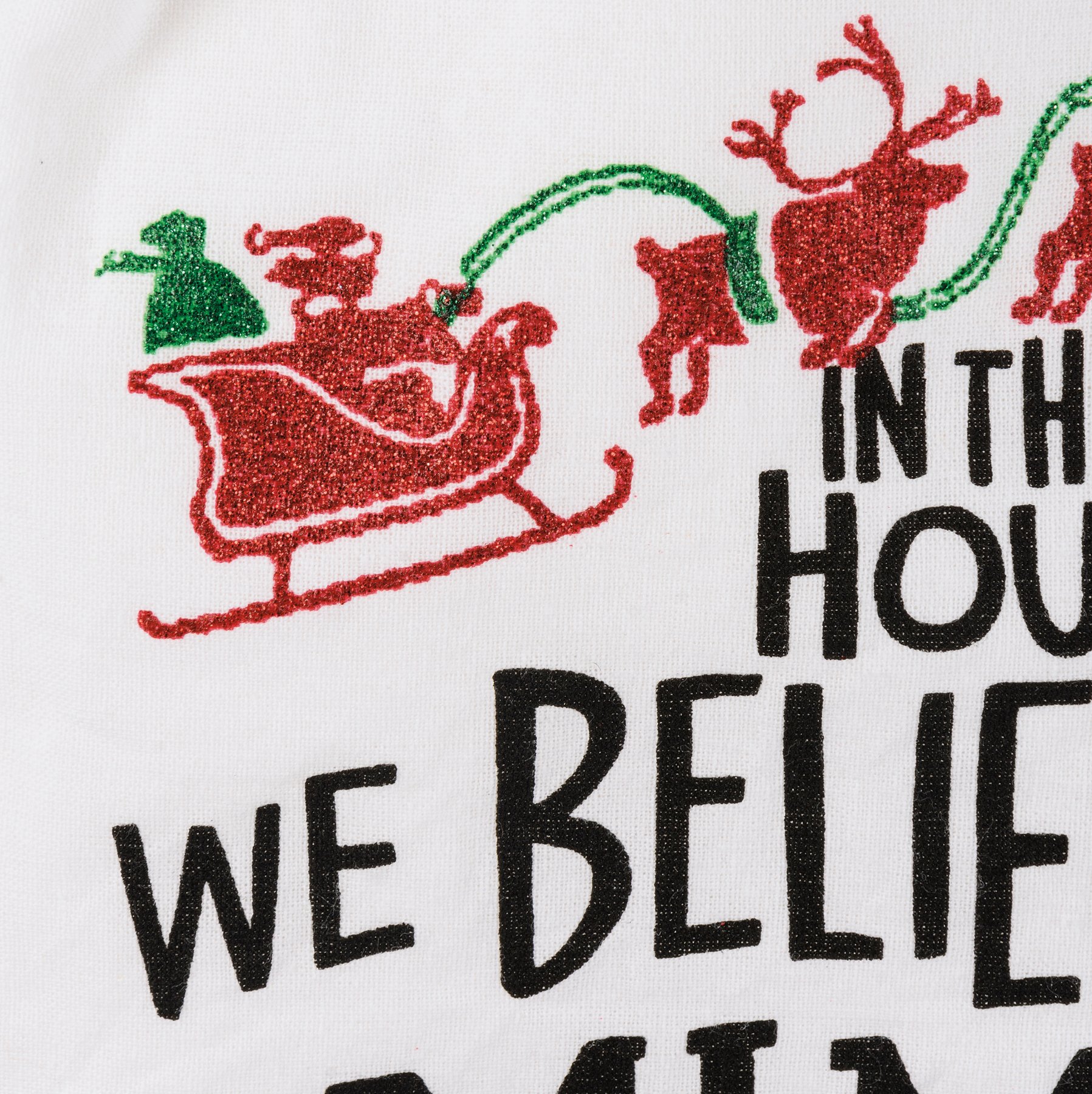 A cotton kitchen towel featuring "In This House We Believe In Mimi Claus" sentiment with festive designs. Machine-washable.