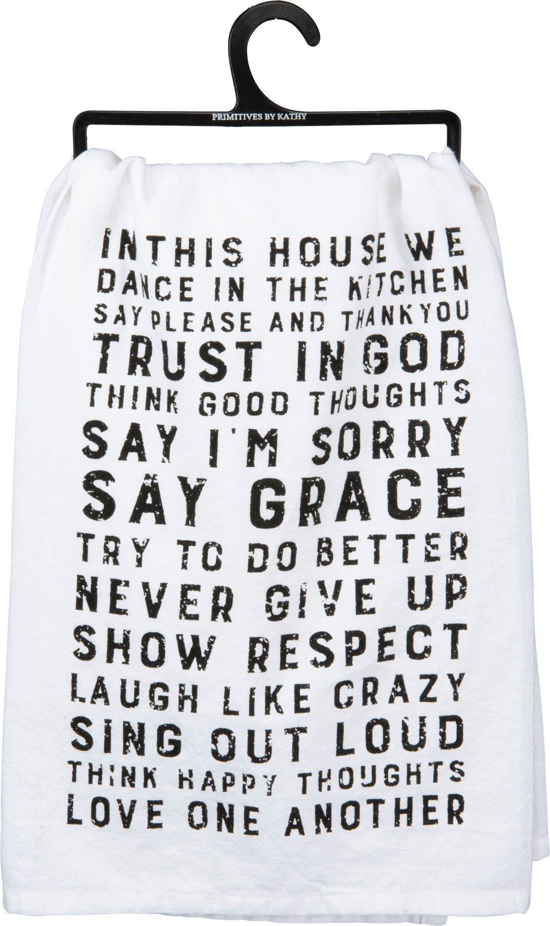 A black and white cotton kitchen towel lending a distressed "In This House We Dance In The Kitchen Say Please And Thank You Trust In God Think Good Thoughts Say I'm Sorry Say Grace Try To Do Better Never Give Up Show Respect Laugh Like Crazy Sing Out Loud Think Happy Thoughts Love One Another" sentiment that complements well with existing kitchen decor. Machine-washable.
