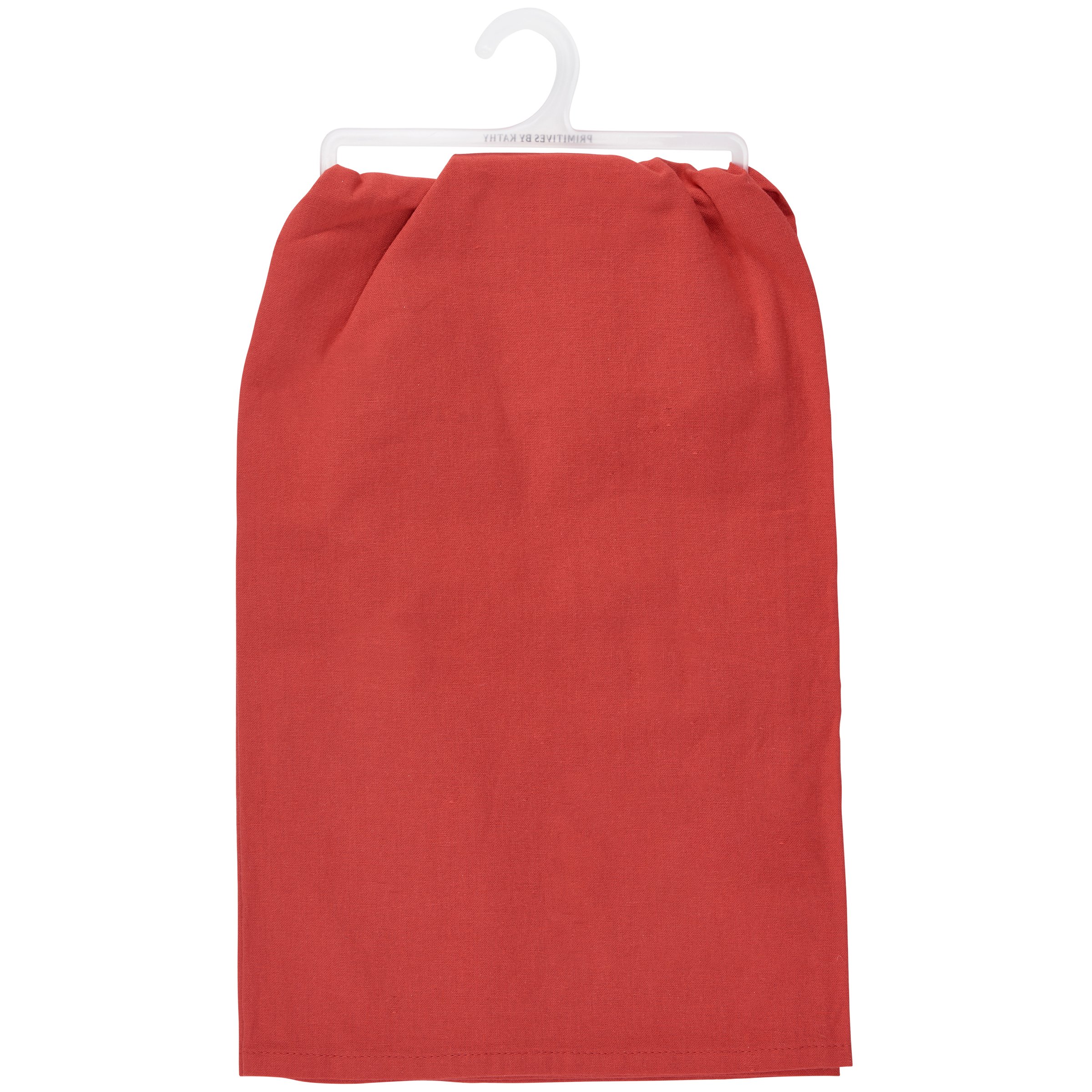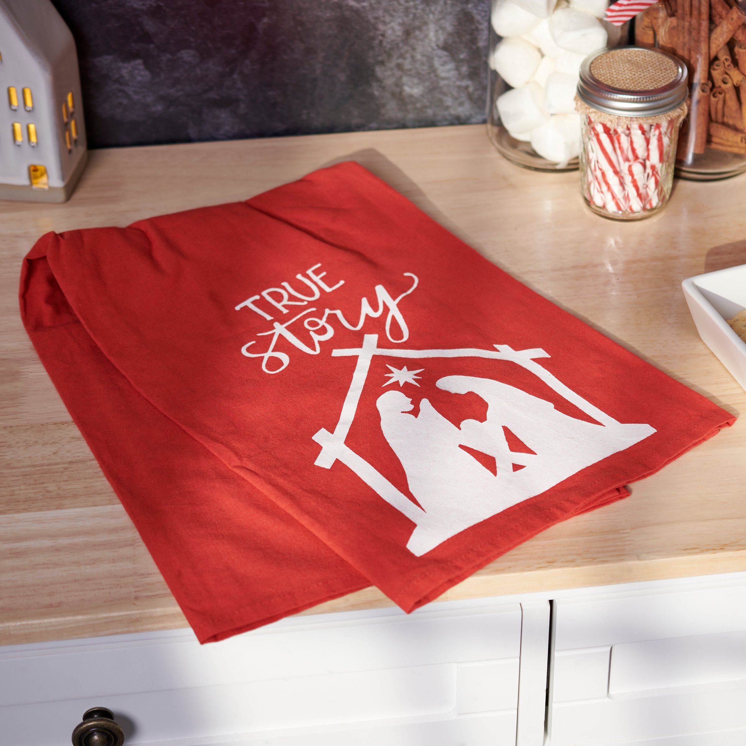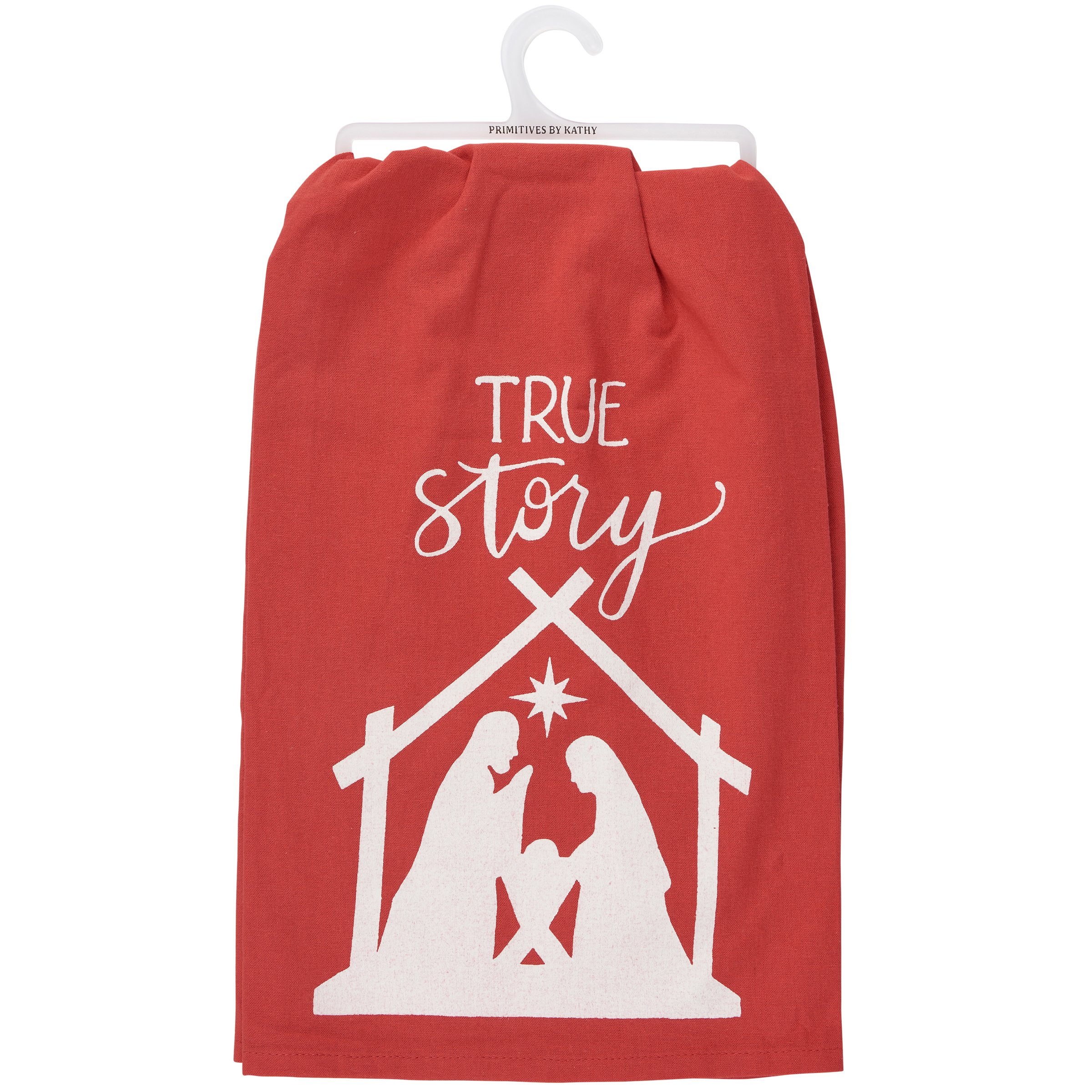 A red cotton kitchen towel from our Christmas Collection displaying a silhouette of a nativity with a sentiment in a hand illustrated style that reads "True Story." Our True Story kitchen towel is conveniently machine-washable for easy cleaning. Seasonal kitchen towel is packaged on a clear plastic hanger to easily display on rack. A nativity-themed kitchen accessory perfect for seasonal use.