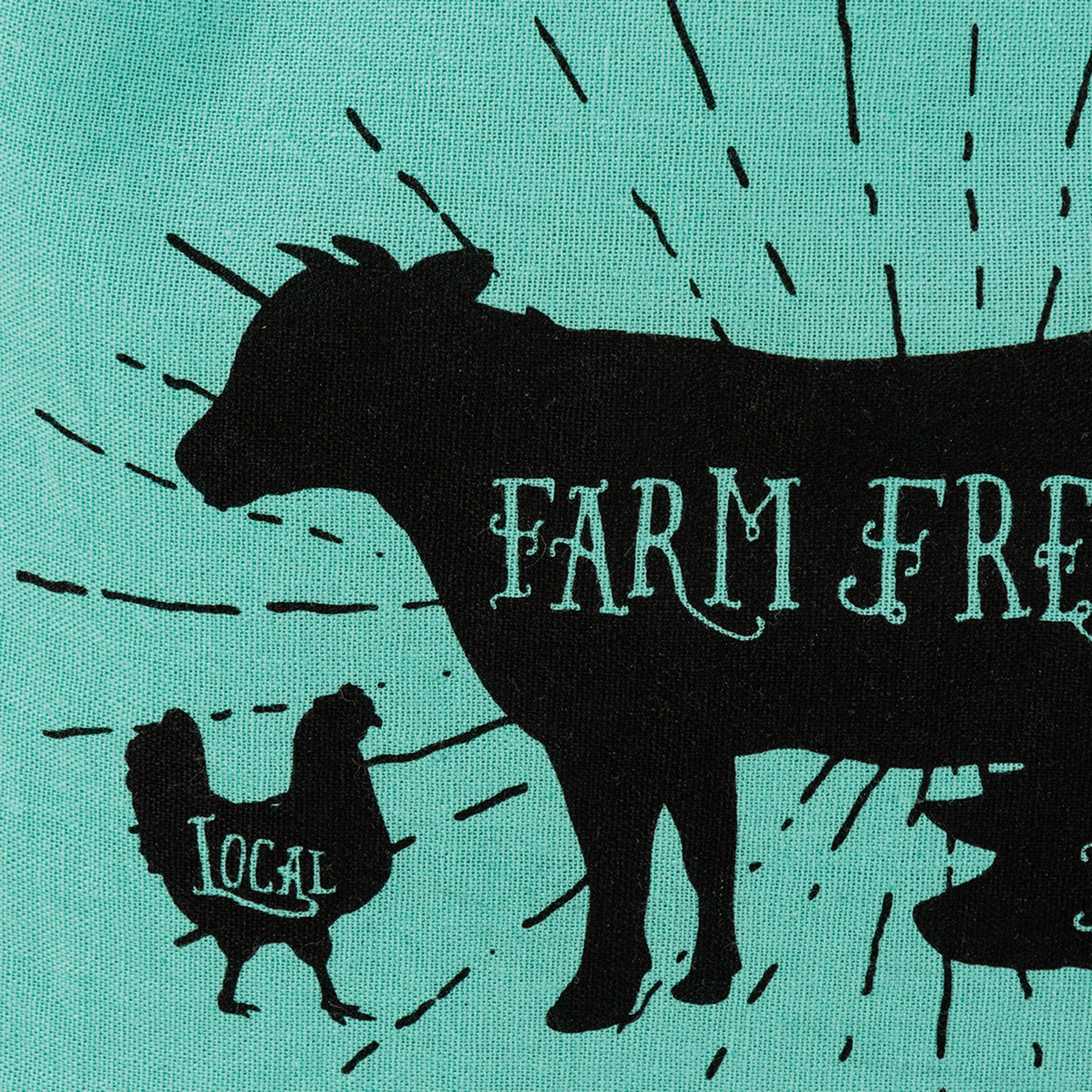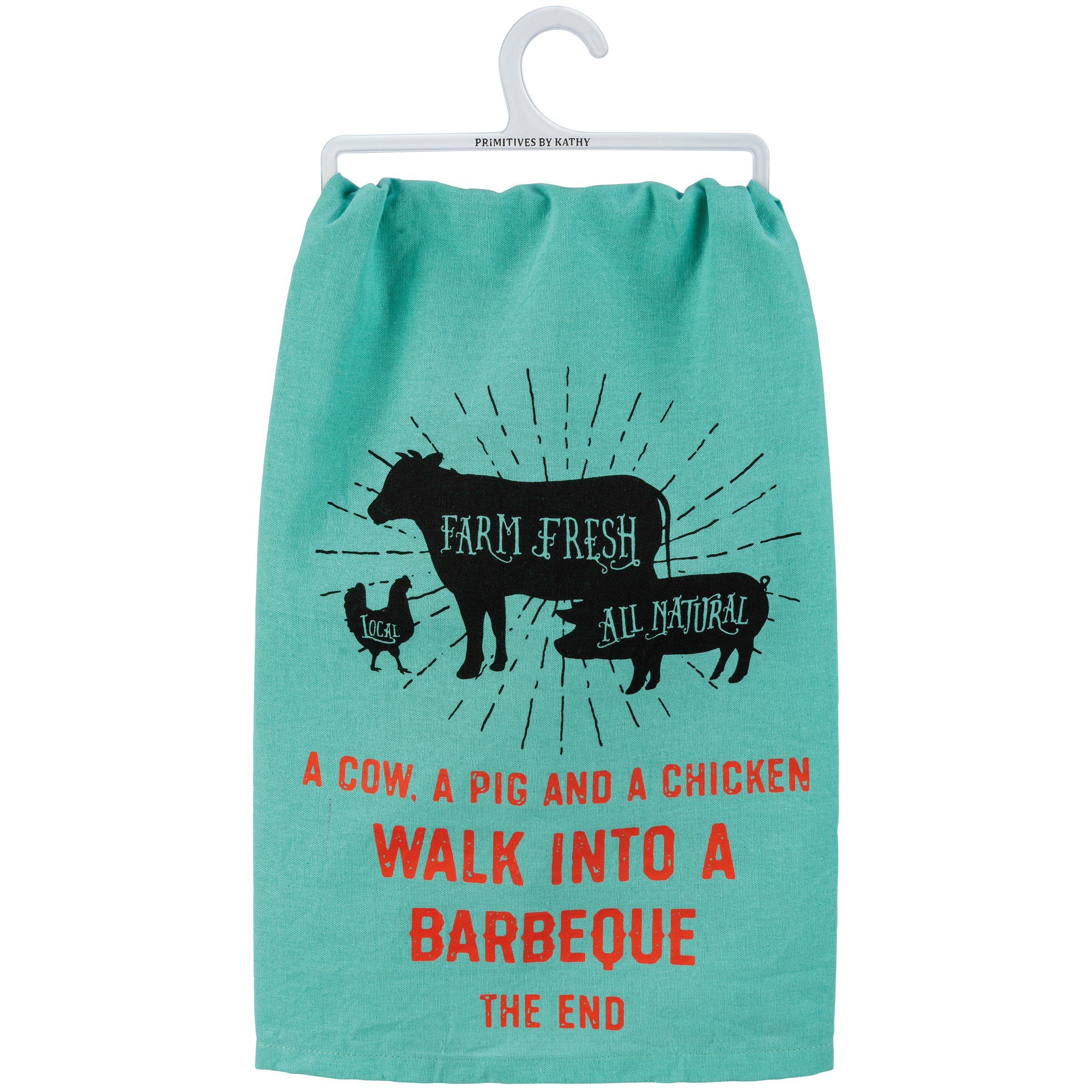 A cotton kitchen towel featuring "A Cow, A Pig And A Chicken Walk Into A Barbeque The End" sentiment with farm animal designs. Machine-washable.