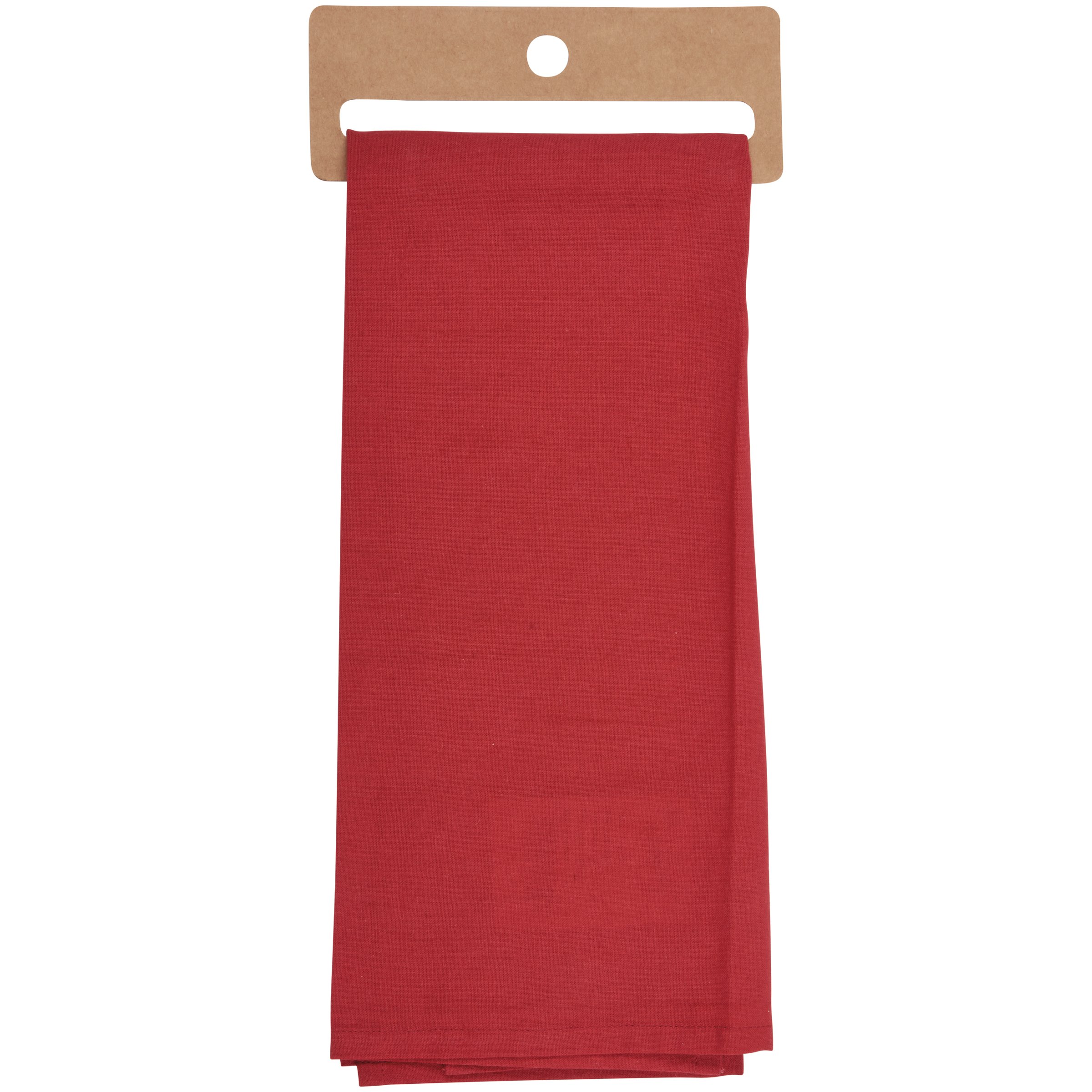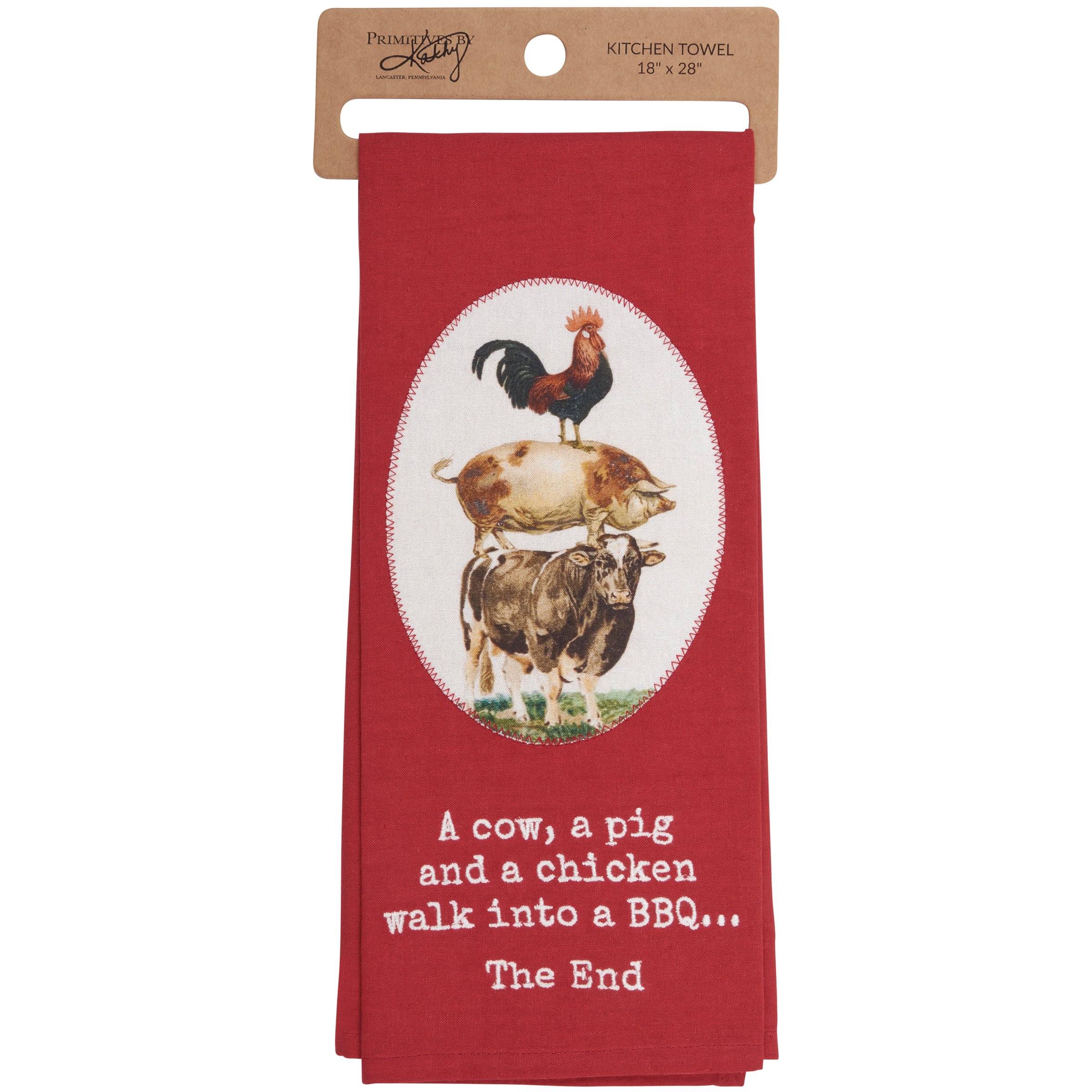 A red cotton kitchen towel from our Farmhouse Collection featuring a stitched art panel and embroidered sentiment. Art panel displays vintage art of a cow, pig, and rooster stacked on each other with humorous sentiment that reads "A Cow, A Pig, And A Chicken Walk Into A BBQ... The End." Our Walk Into A BBQ kitchen towel is machine-washable for convenient cleaning. Packaged on a cardboard hanger with hole to easily display on rack. A charming and functional everyday kitchen accent.