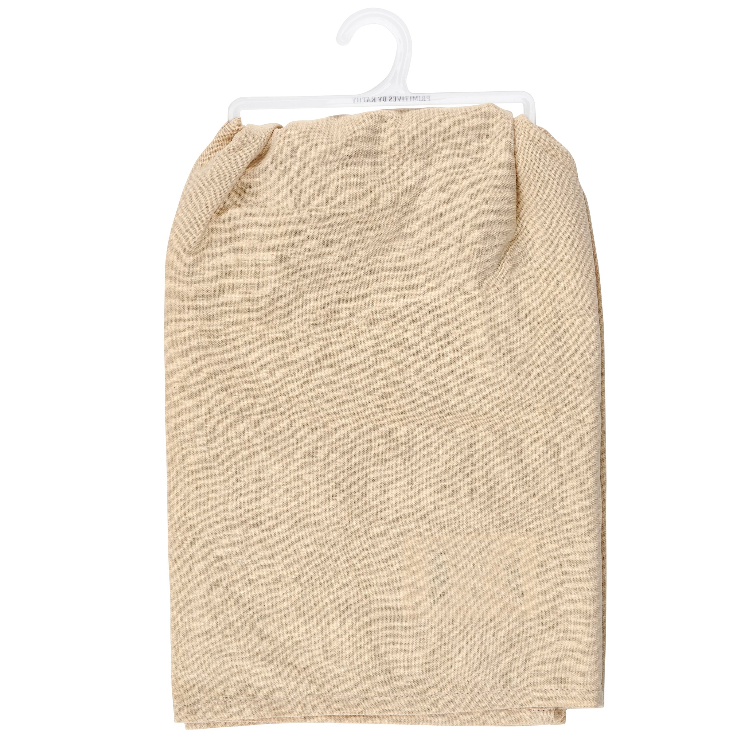 A tan cotton kitchen towel from our Pet Collection displaying a rustic design of a dog wearing a red bandana with a humorous pet-themed sentiment that reads "Every Burger You Flip - Every Chip You Dip - I'll Be Watching You." Our Watching You kitchen towel is machine-washable for convenient cleaning. Packaged on a clear plastic hanger to easily display on rack. A fun pet-themed kitchen accessory perfect for everyday use.