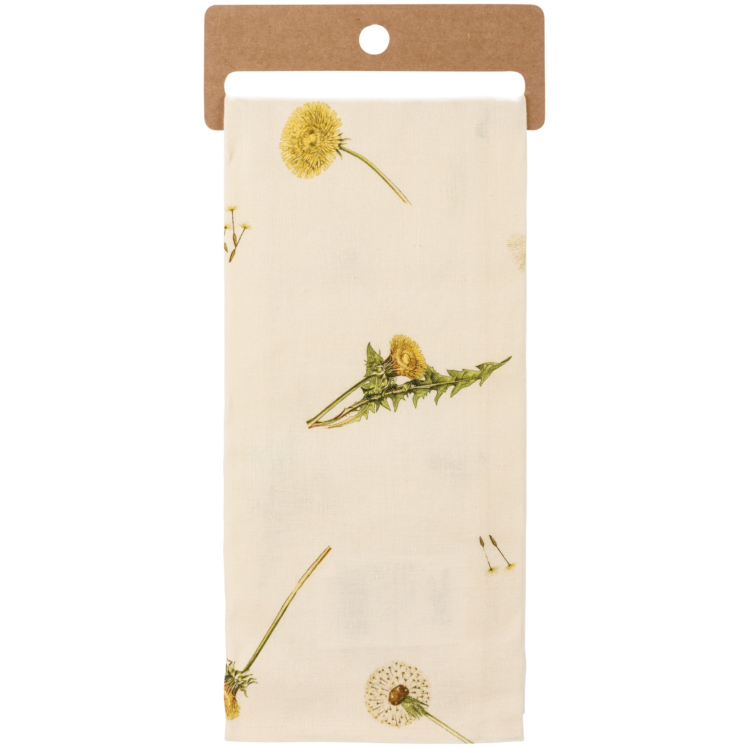 A cotton linen blend kitchen towel from our Garden Collection featuring all-over vintage style dandelion designs and punny embroidered "Well That's Just Dandy" sentiment. Features a cotton tape loop in the corner for easy hanging. Our Dandelion kitchen towel is machine-washable. Towel is packaged on a cardboard hanger with a hole to easily hang on rack.
