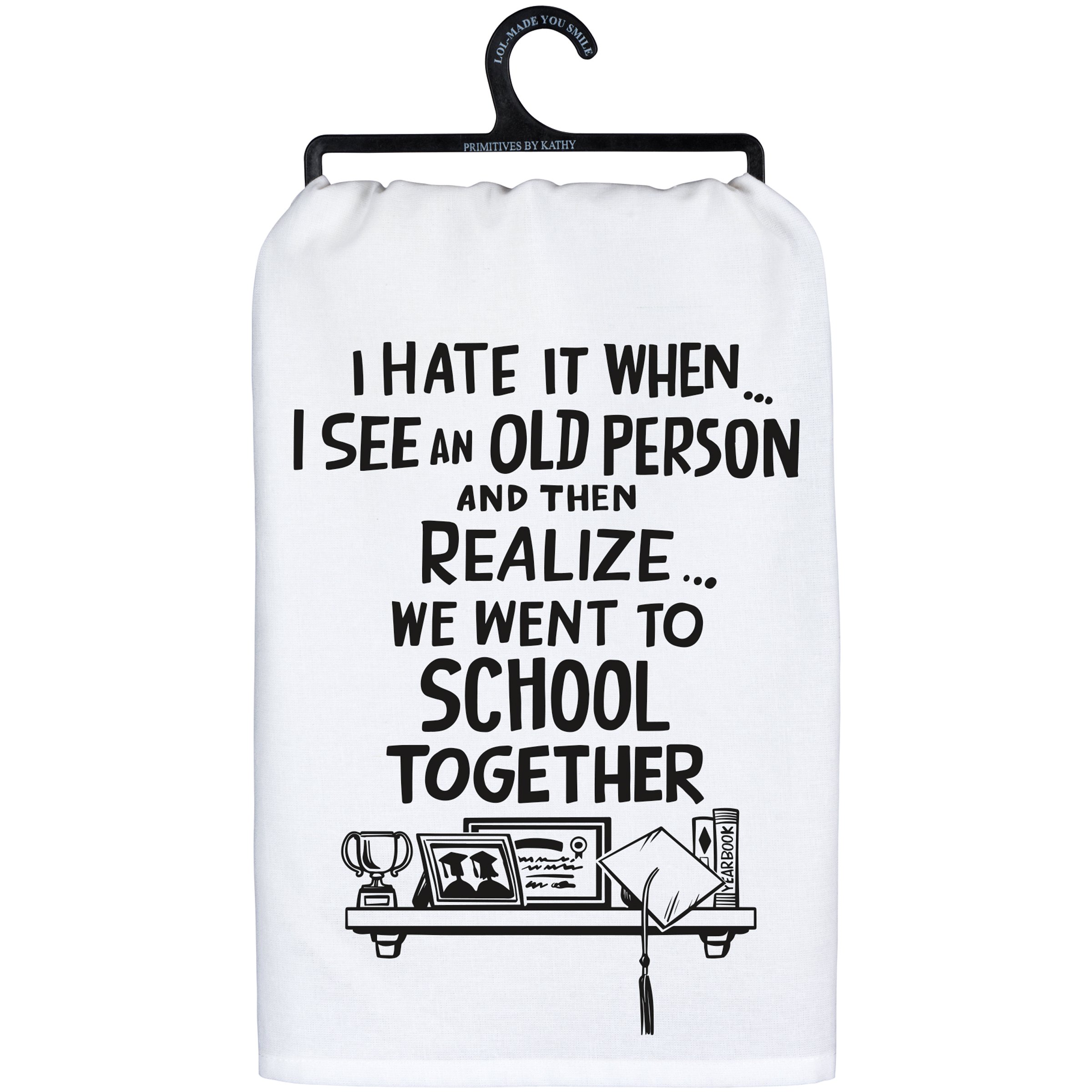 A black and white cotton kitchen towel from our LOL-Made You Smile Collection displaying a fun hand illustrated design of a shelf of graduation items with a humorous sentiment that reads "I Hate It When I See An Old Person And Then Realize We Went To School Together." Our When I See An Old Person kitchen towel is conveniently machine-washable for easy cleaning. Funny kitchen towel is packaged on a black plastic hanger to easily display on rack. A fun gift perfect for an everyday kitchen accessory.