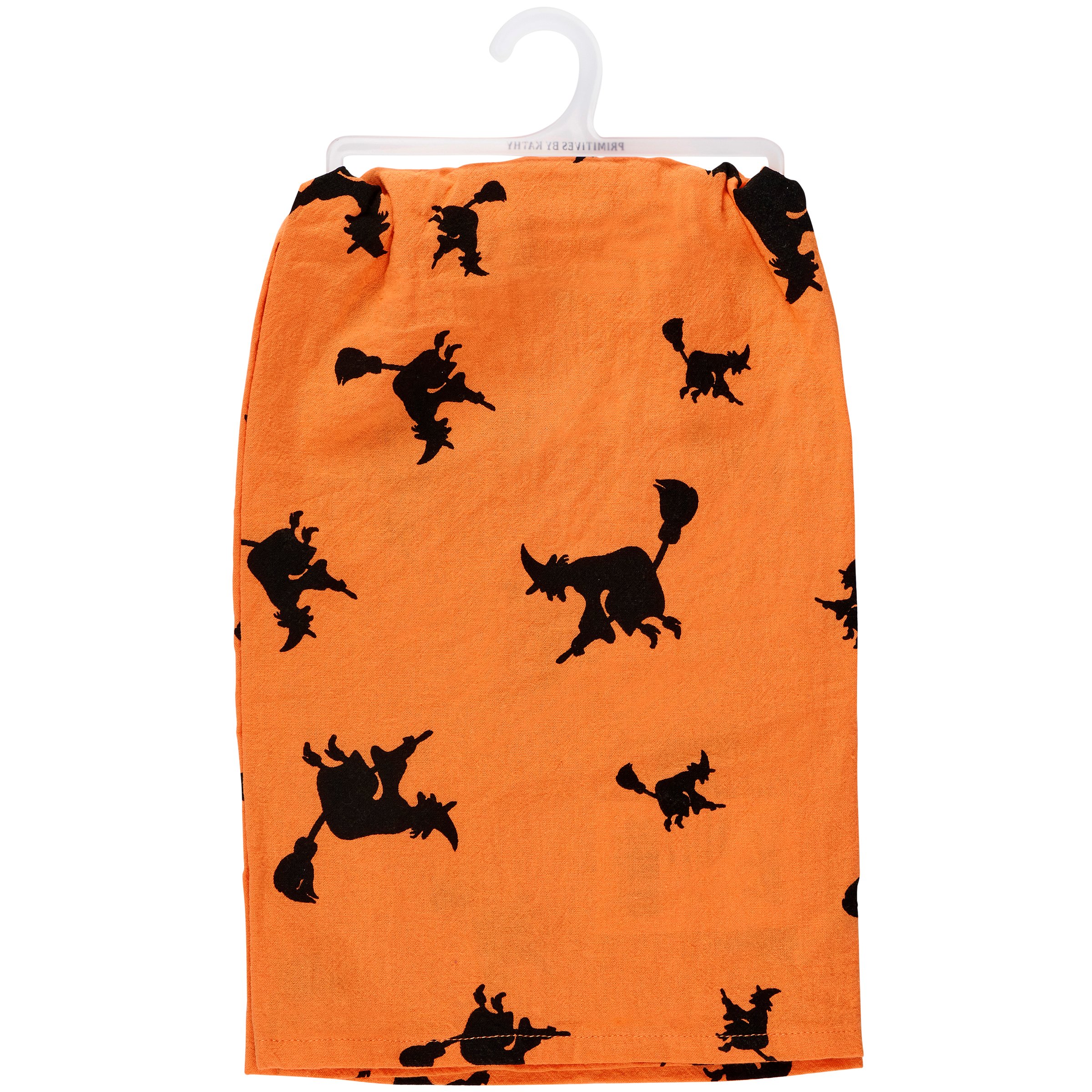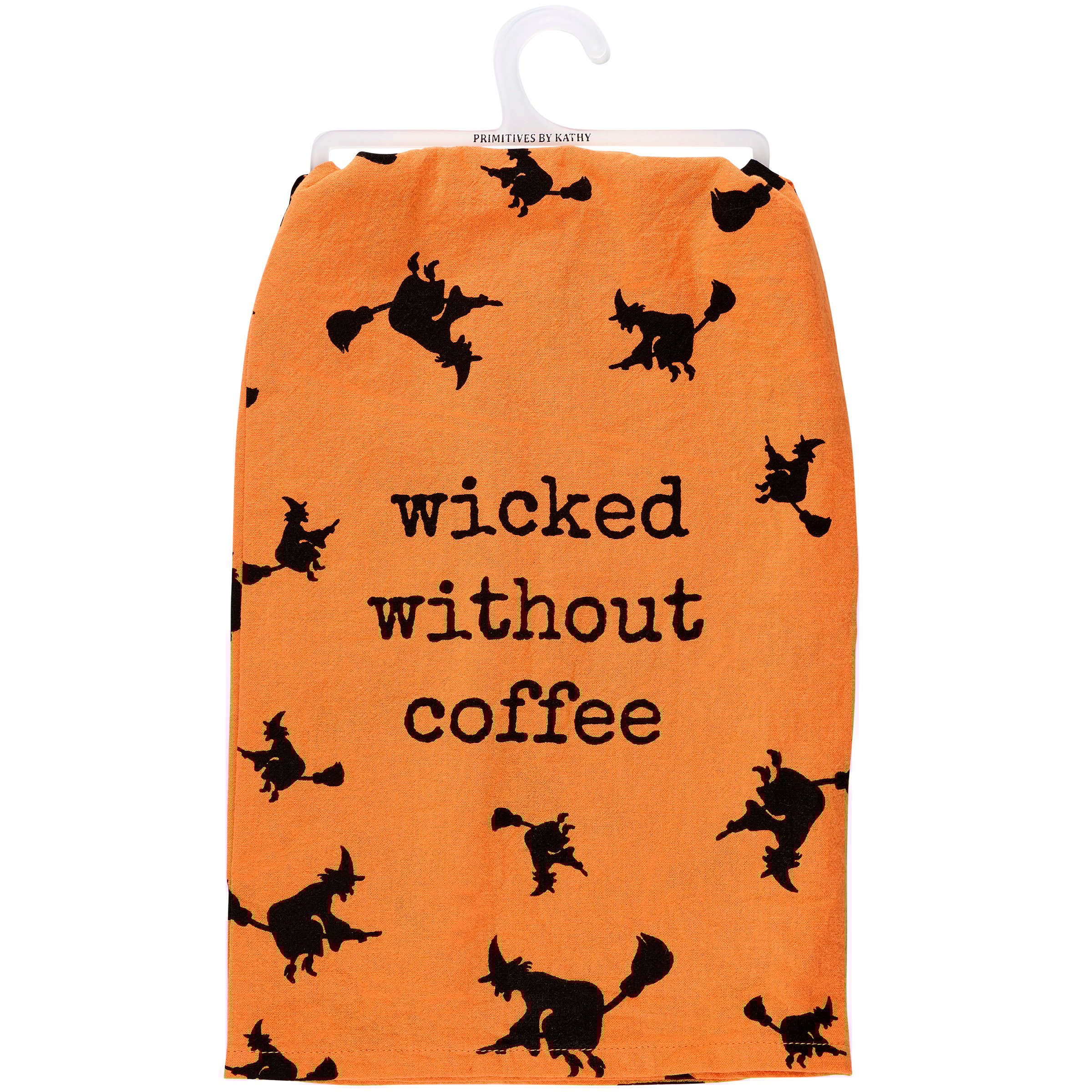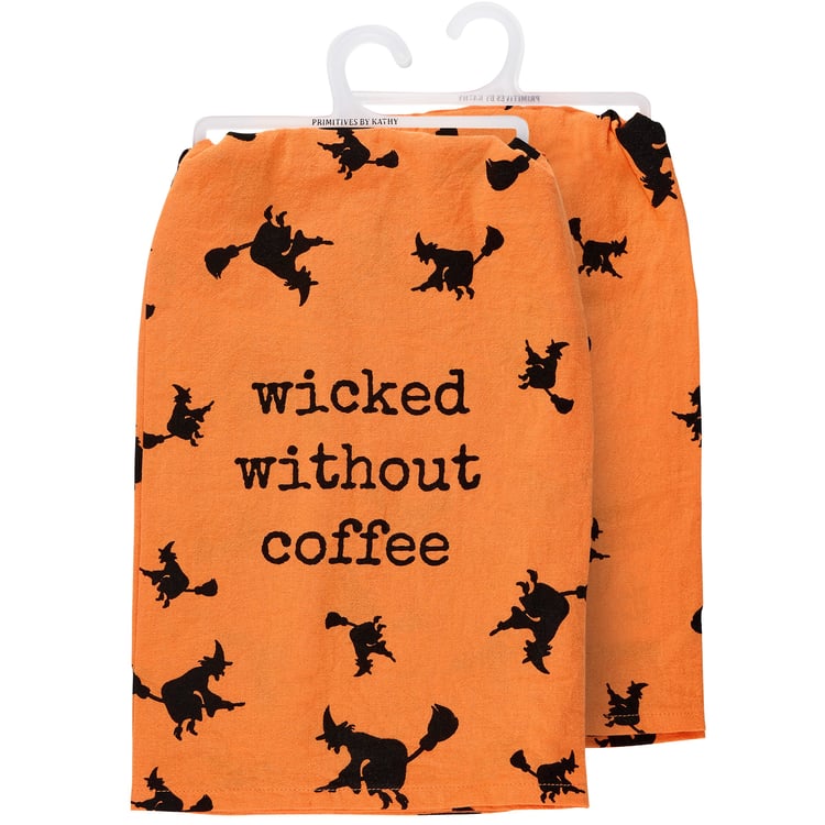 An orange cotton kitchen towel from our Halloween Collection displaying an all-over design of flying witches with a fun Halloween inspired sentiment that reads "Wicked Without Coffee." Our Wicked Without Coffee kitchen towel is conveniently machine-washable for easy cleaning. Seasonal kitchen towel is packaged on a clear plastic hanger to easily display on rack. A fun Halloween-themed kitchen accessory perfect for seasonal use.