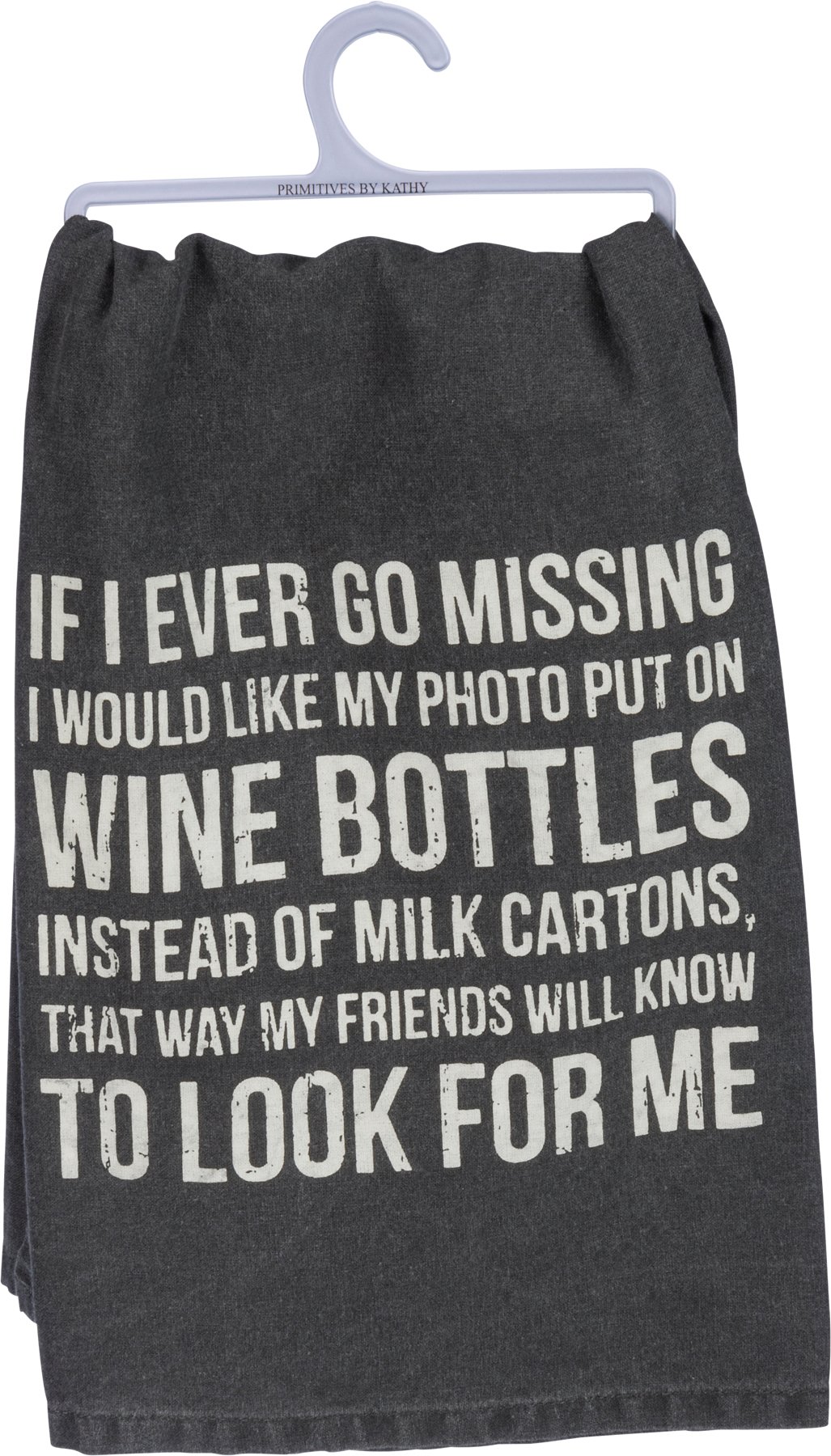 A classic black and white cotton kitchen towel featuring a distressed "If I Ever Go Missing I Would Like My Photo Put On Wine Bottles Instead Of Milk Cartons, That Way My Friends Will Know To Look For Me" sentiment. Machine-washable.