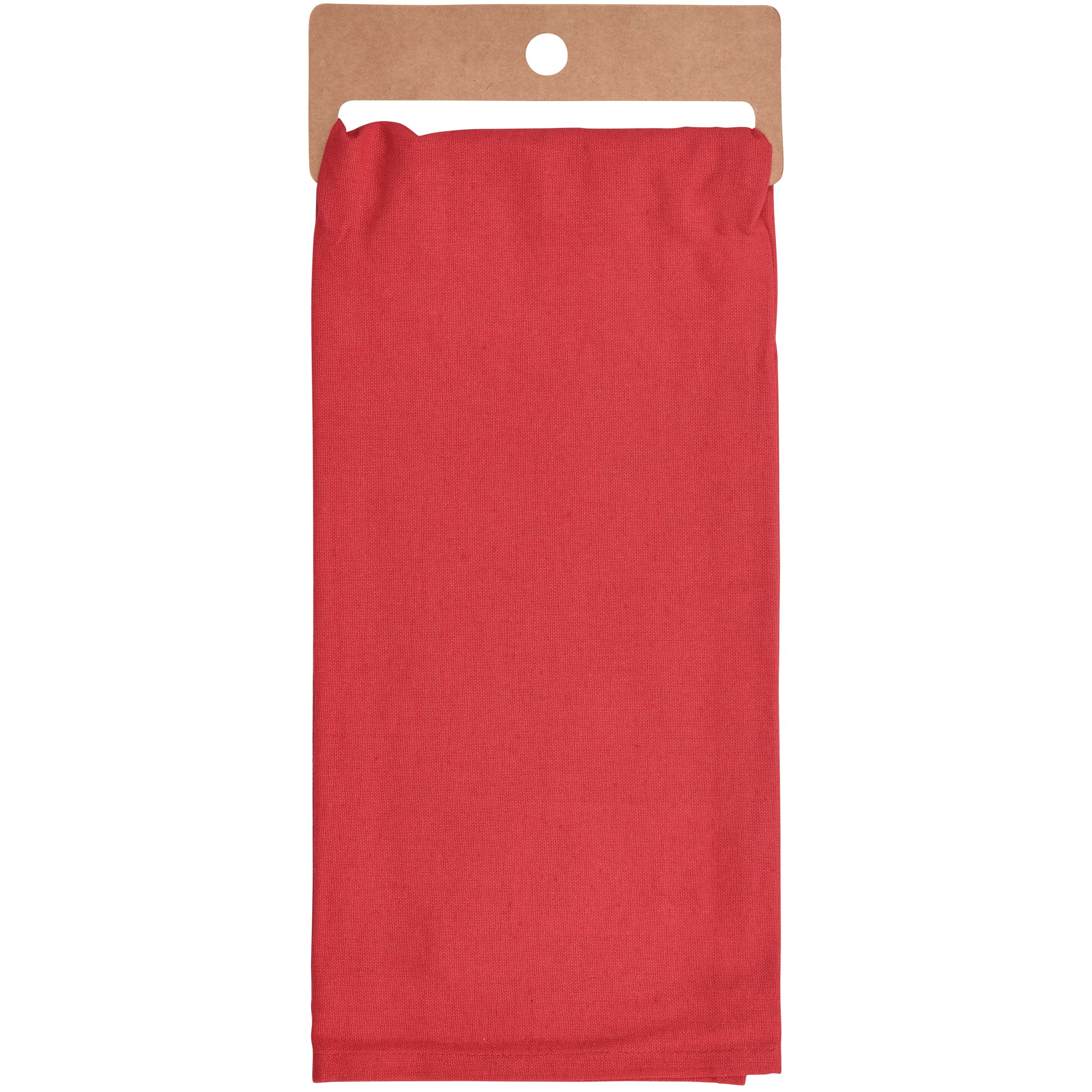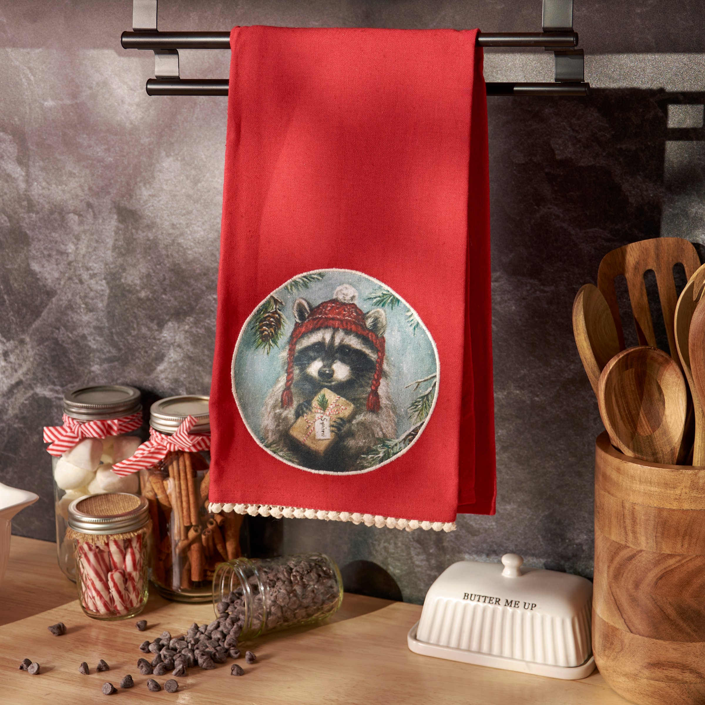 A red cotton kitchen towel from our Christmas Collection featuring a stitched art panel and white pom trim. Art panel displays a hand painted winter scene of a raccoon wearing a winter hat and holding a Christmas gift for a squirrel. Design is replicated from original artwork painted onto burlap canvas, giving the art a unique depth and texture. Our Winter Raccoon kitchen towel is conveniently machine-washable for easy cleaning. Seasonal kitchen towel is packaged on a cardboard hanger with hole to easily hang on rack. A rustic winter-themed kitchen accessory perfect for seasonal use.