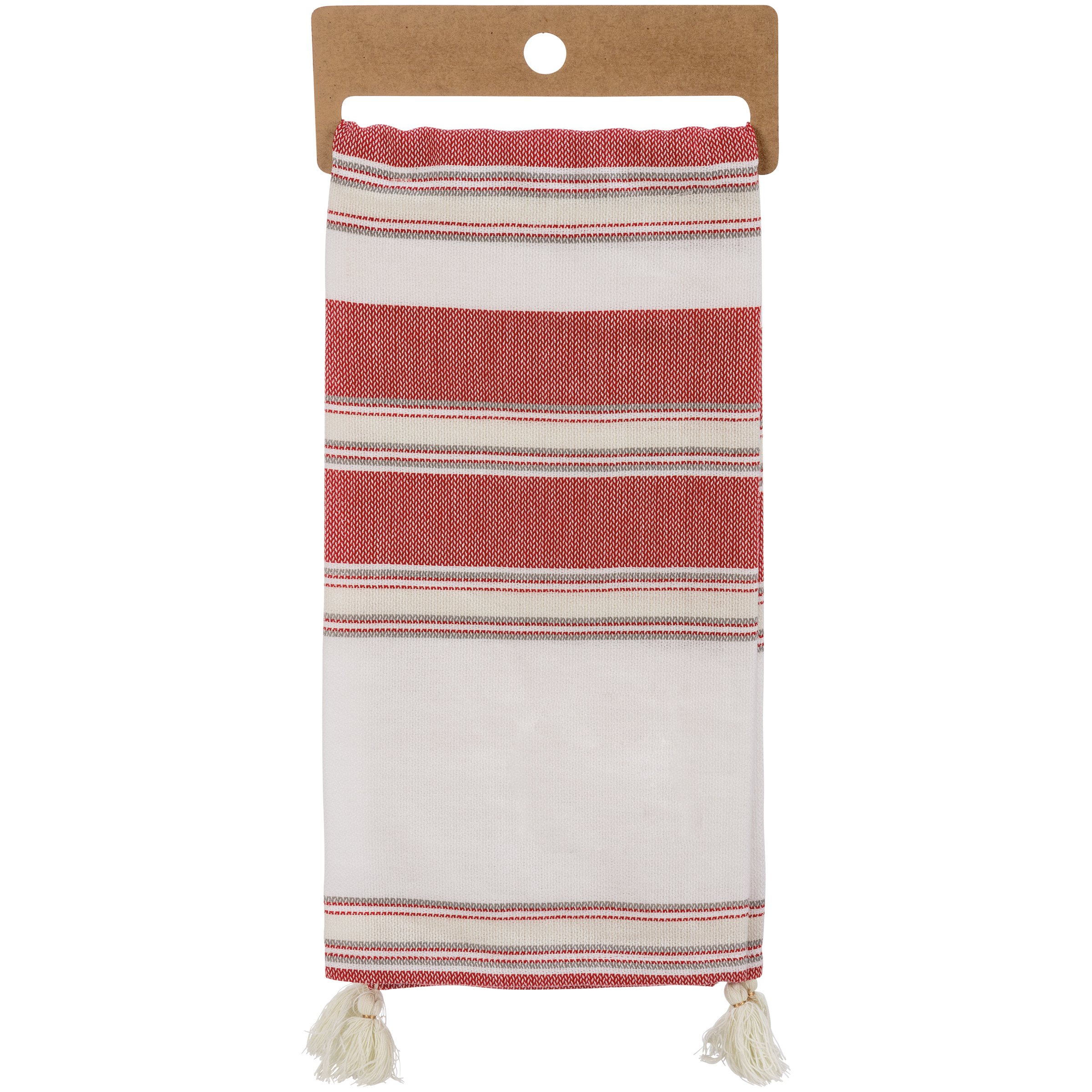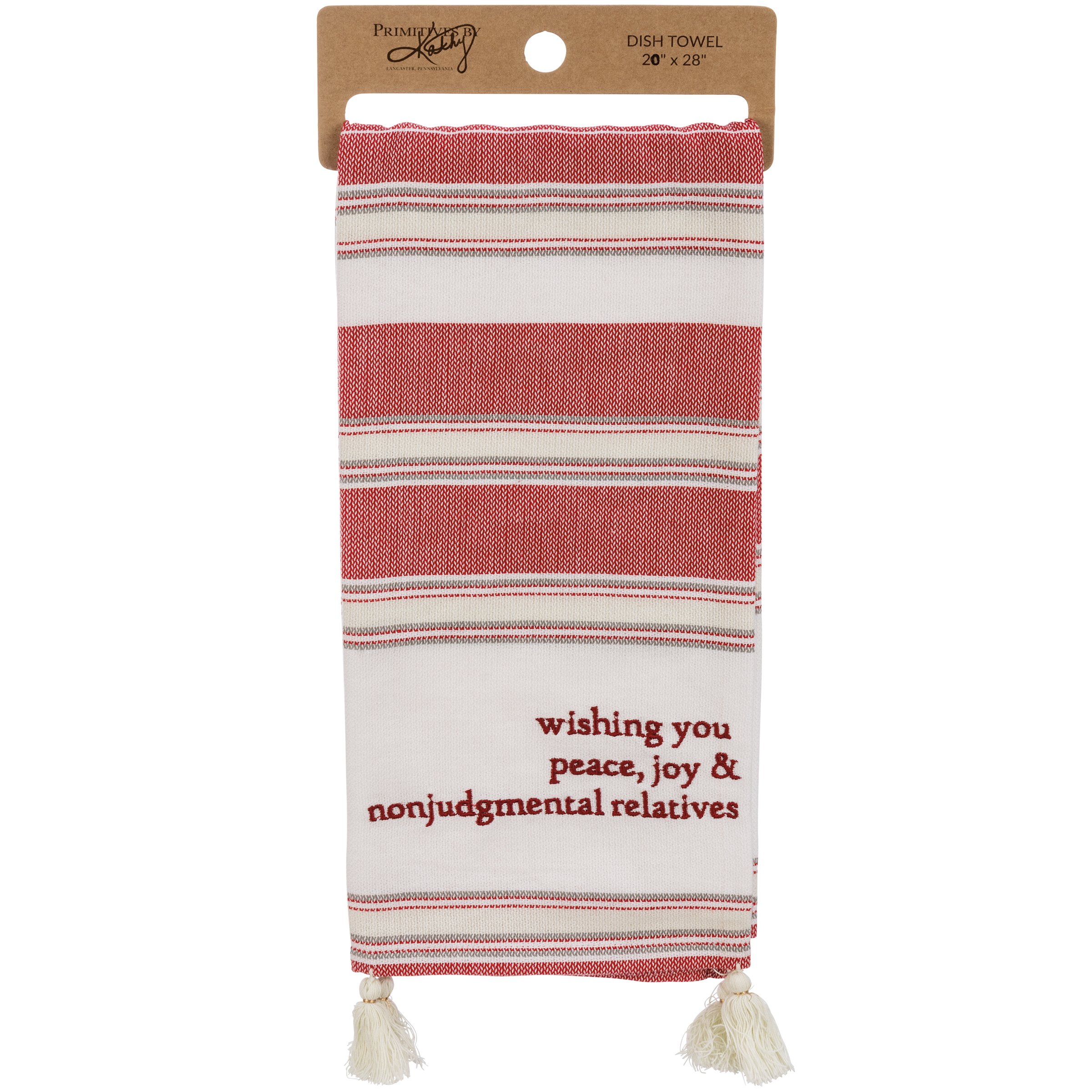 A cotton kitchen towel featuring a holiday-inspired color palette with embroidered "Wishing You Peace, Joy, & Nonjudgmental Relatives" sentiment and woven stripe designs. Includes tassel accents for added interest. Towel is packaged on a cardboard hanger with a hole to easily hang on rack. Machine-washable.