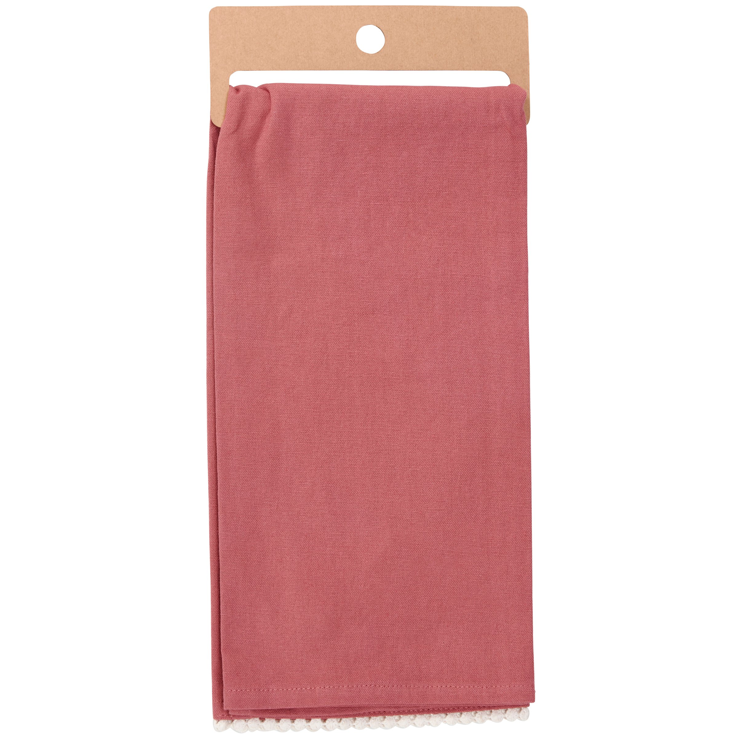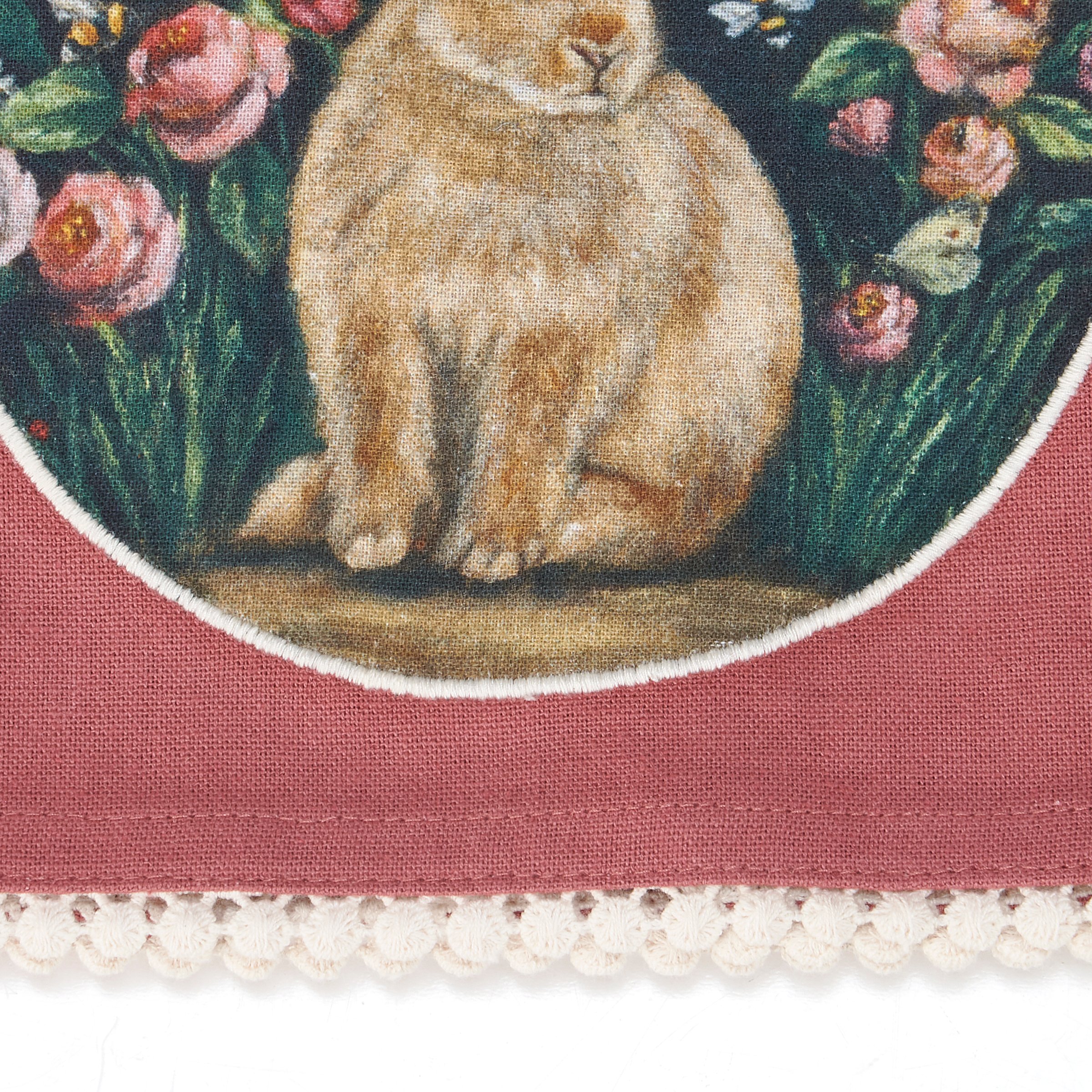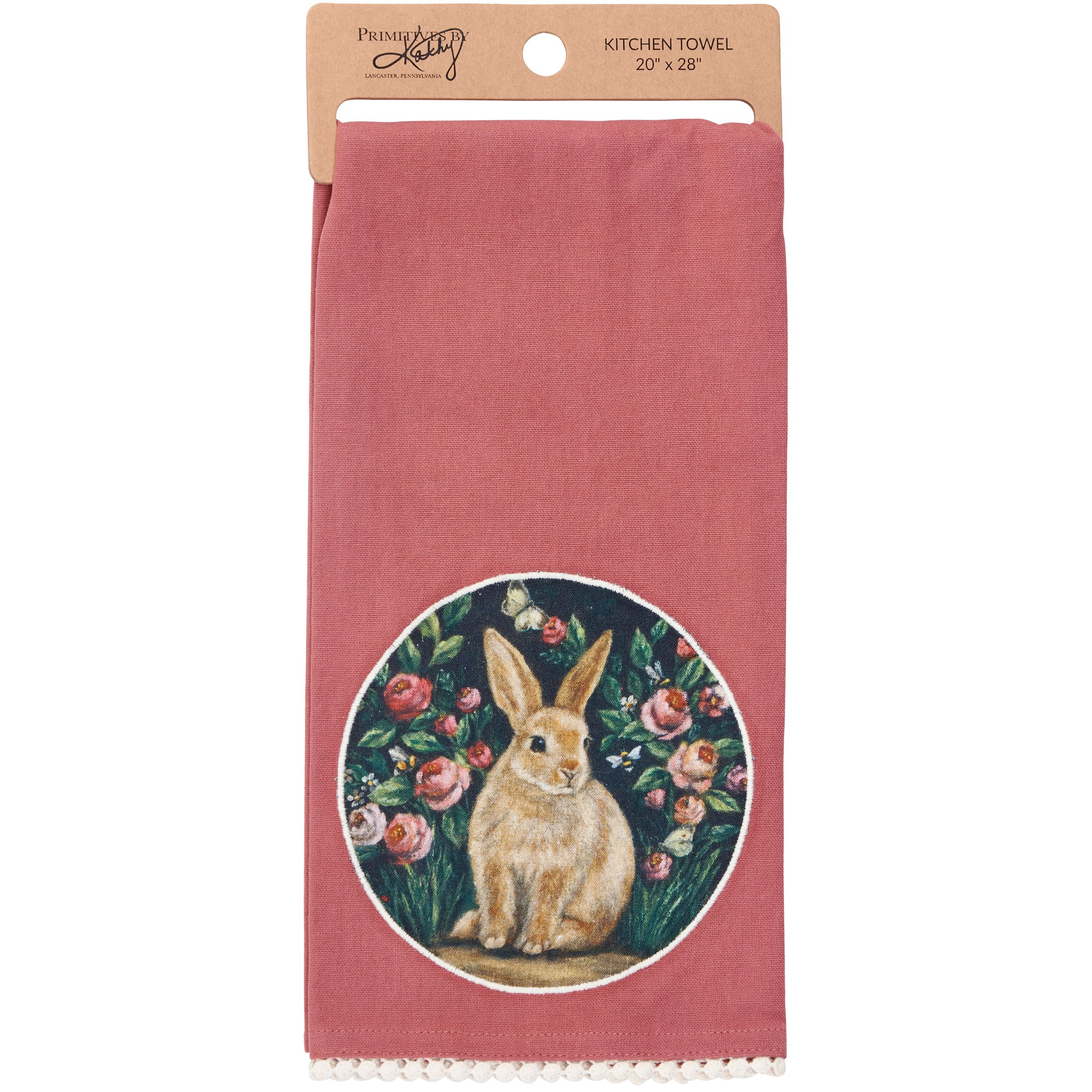 A pink cotton kitchen towel from our Easter & Spring Collection featuring a stitched art panel and white pom trim. Art panel displays a hand painted design of a woodland bunny surrounded by spring flowers in a moody color palette. Design is replicated from original artwork painted onto burlap canvas, giving the art a unique depth and texture. Our Woodland Bunny kitchen towel is machine-washable for convenient cleaning. Packaged on a cardboard hanger with hole to easily hang on rack. A charming spring-themed kitchen accessory perfect for seasonal use.