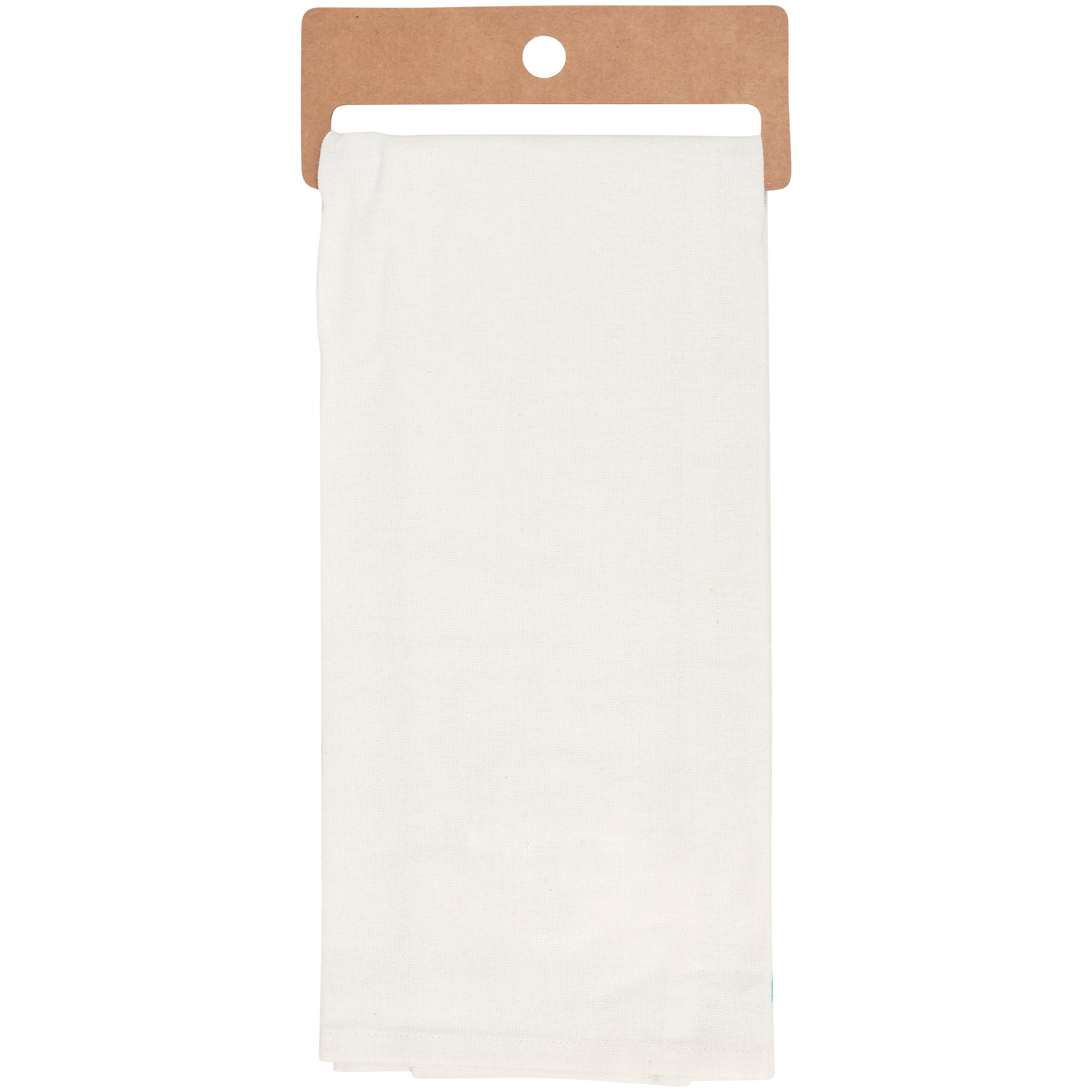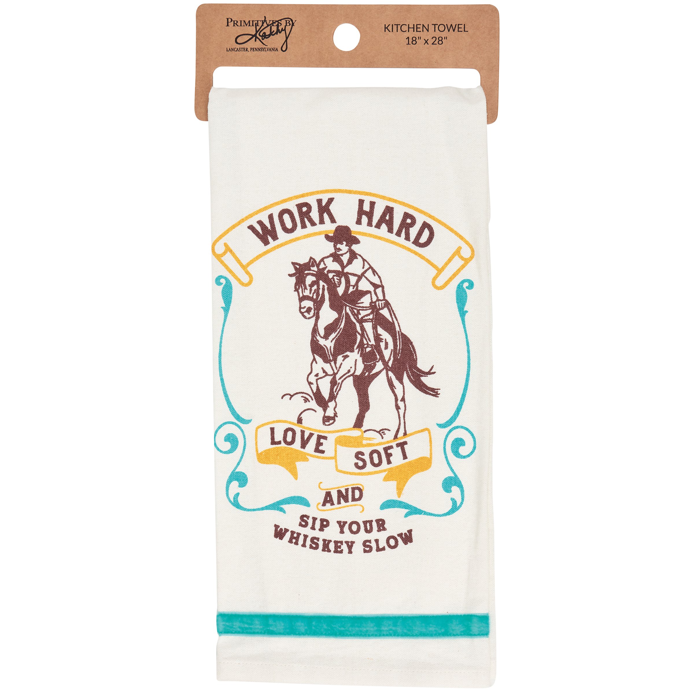 A cotton kitchen towel from our Western Collection displaying a hand illustrated design of a cowboy on a horse with a western inspired sentiment that reads "Work Hard Love Soft And Sip Your Whiskey Slow." Kitchen towel features a coordinating turquoise velvet ribbon along one edge. Our Work Hard kitchen towel is conveniently machine-washable for easy cleaning. Packaged on a cardboard hanger with hole to easily hang on rack. A western-themed kitchen accessory perfect for everyday use.