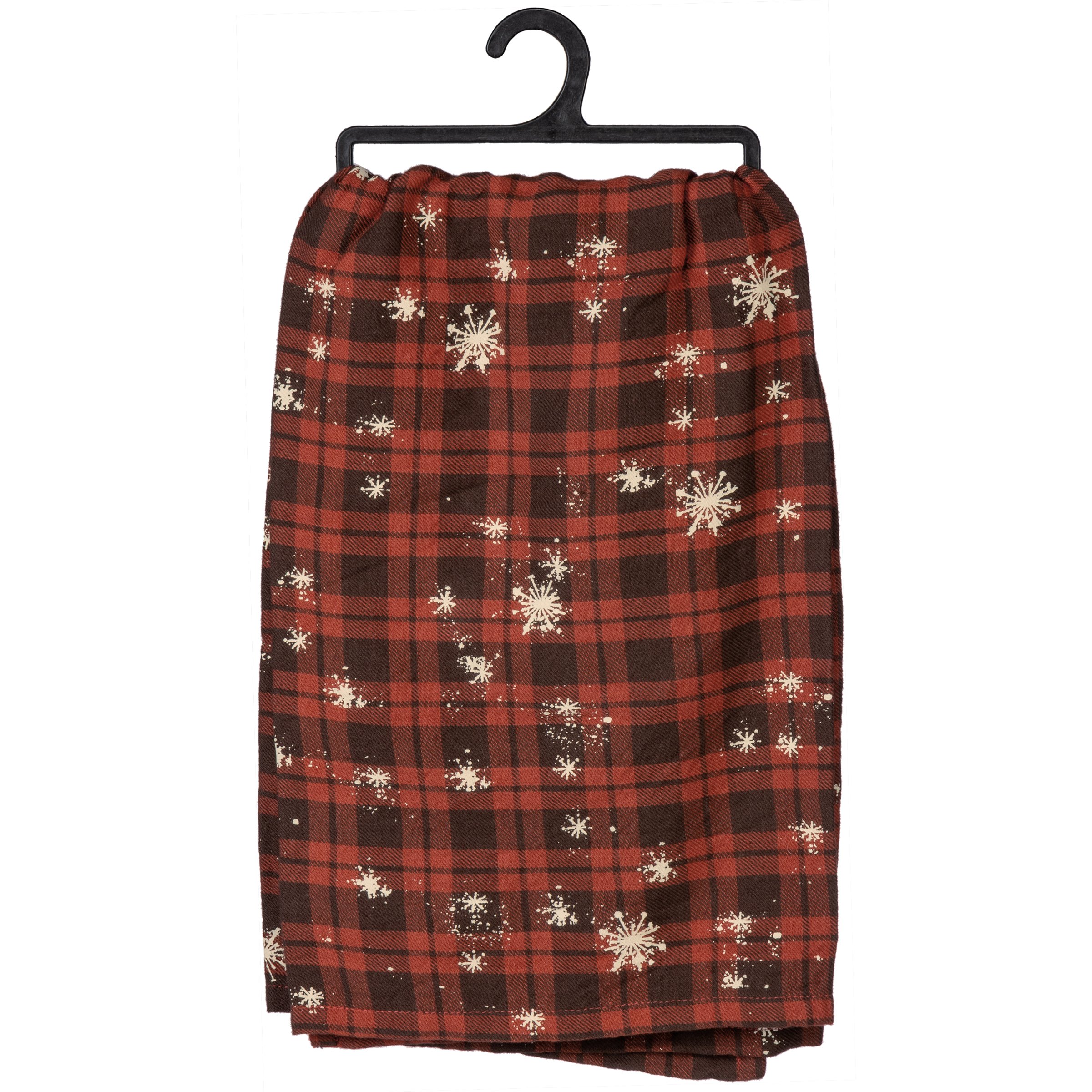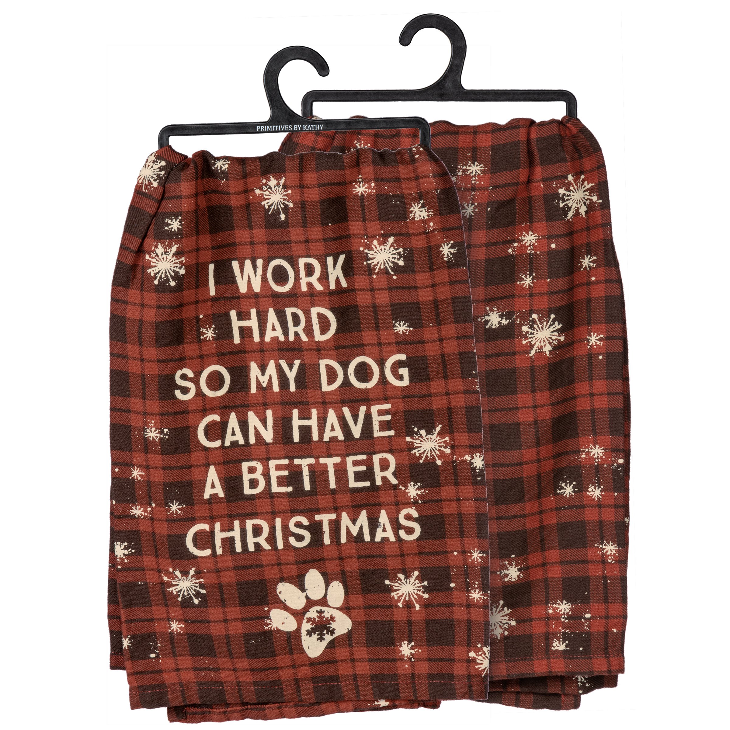 A cotton kitchen towel displaying a rustic design of a paw print and snowflakes on red plaid with a heartwarming dog inspired seasonal sentiment that reads "I Work Hard So My Dog Can Have A Better Christmas." Our Better Dog Christmas kitchen towel is conveniently machine-washable for easy cleaning. Seasonal kitchen towel is packaged on a black plastic hanger to easily display on rack. A lovely pet-themed kitchen accessory perfect for seasonal use.