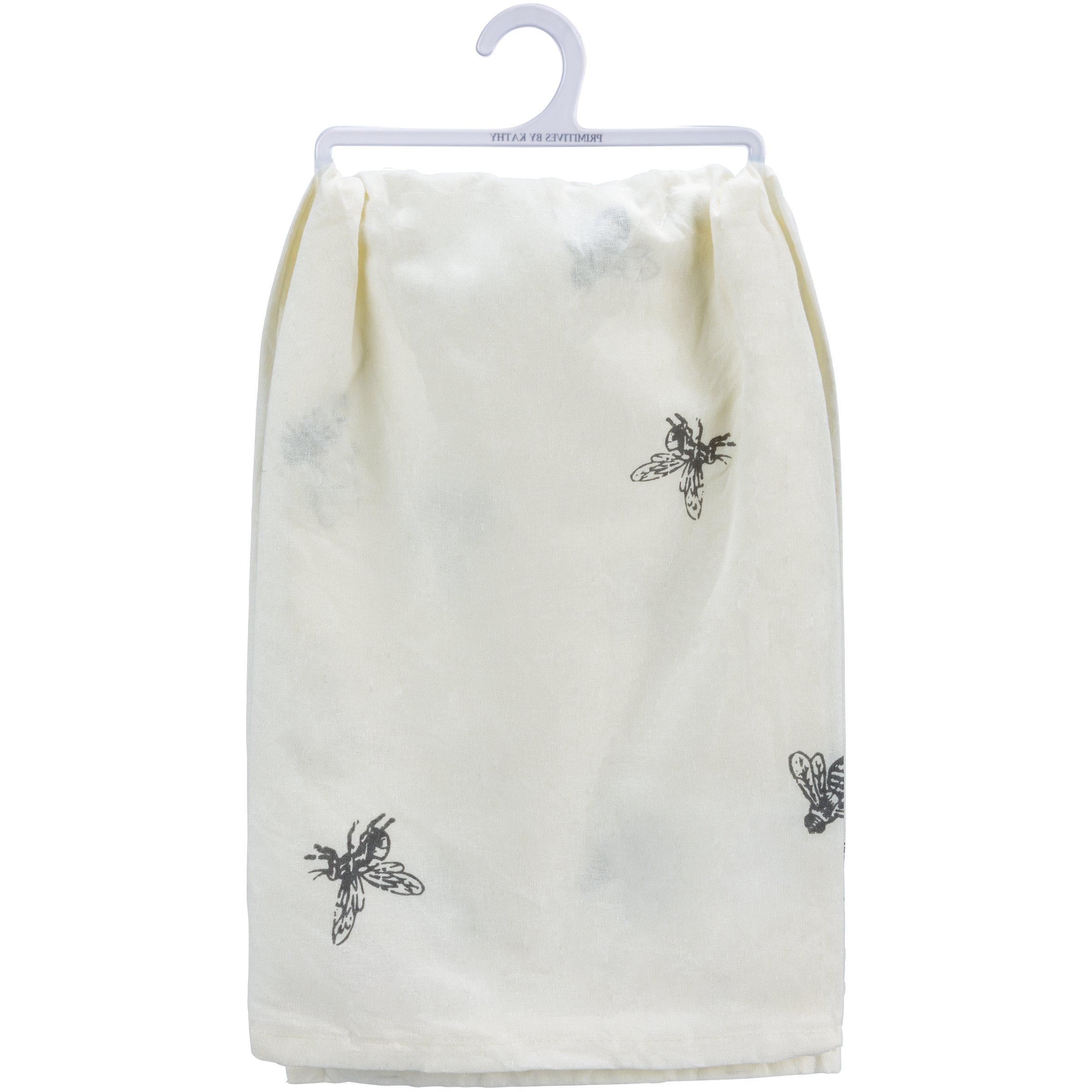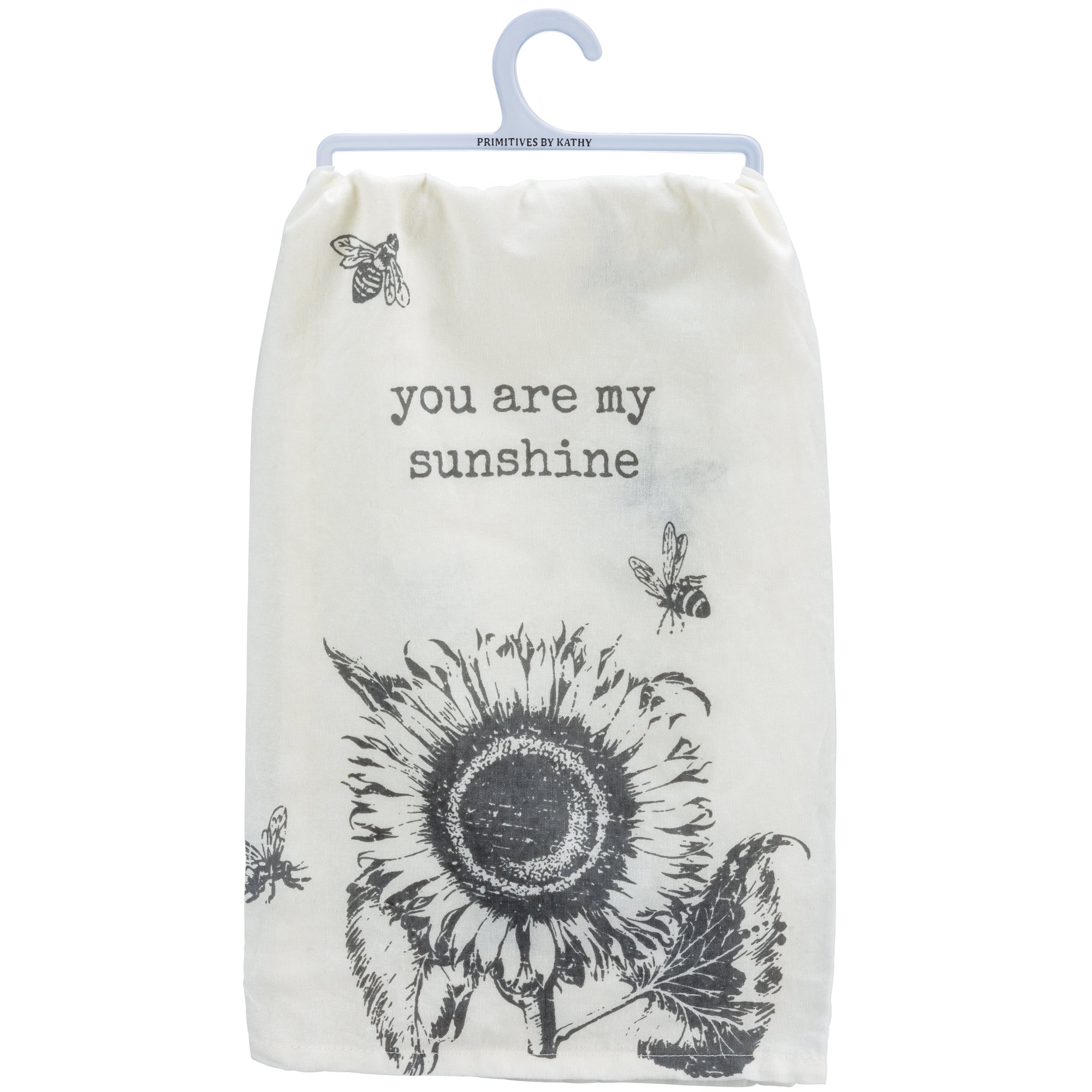 A cotton kitchen towel featuring a "You Are My Sunshine" sentiment, sunflower illustration, and all-over bee designs. Machine-washable.