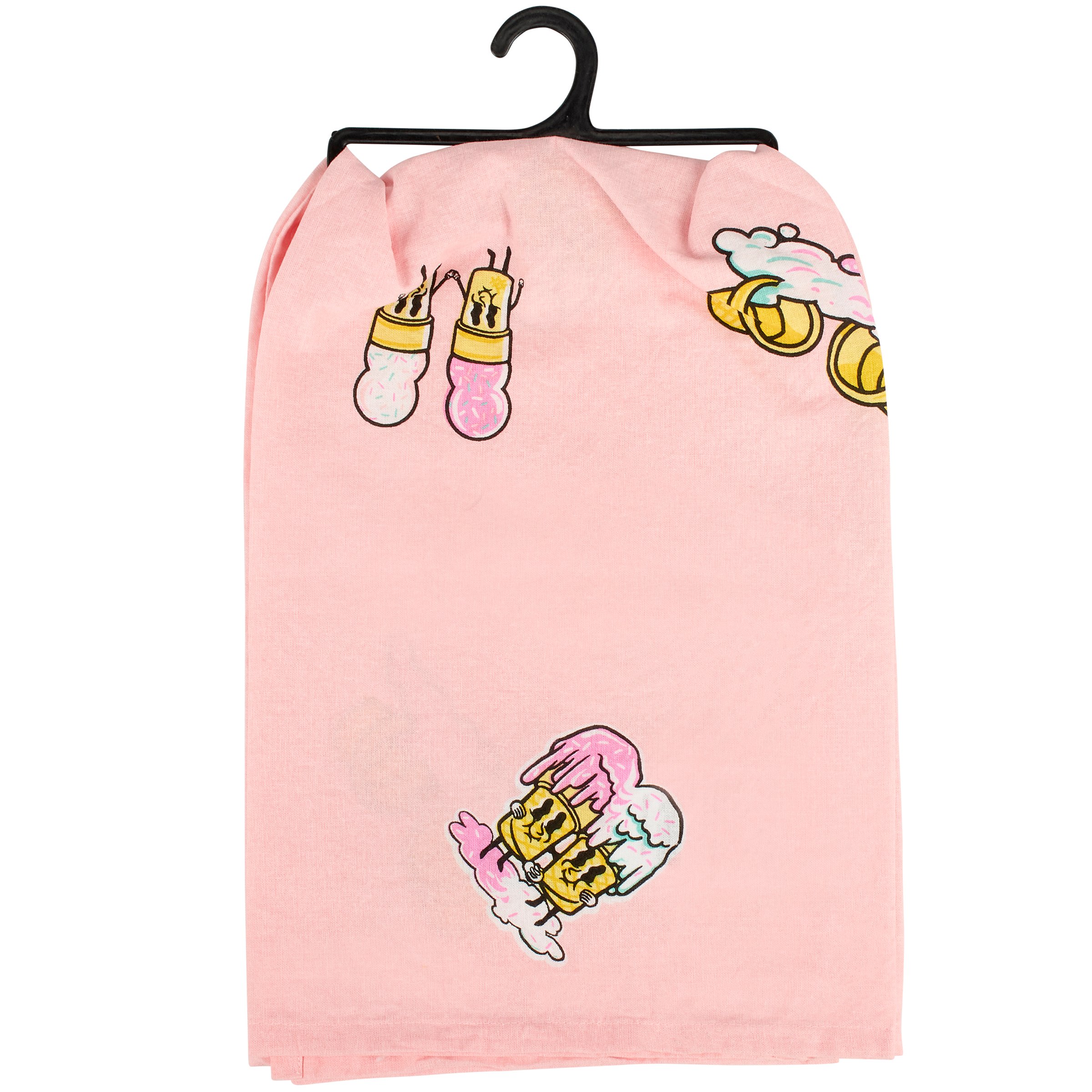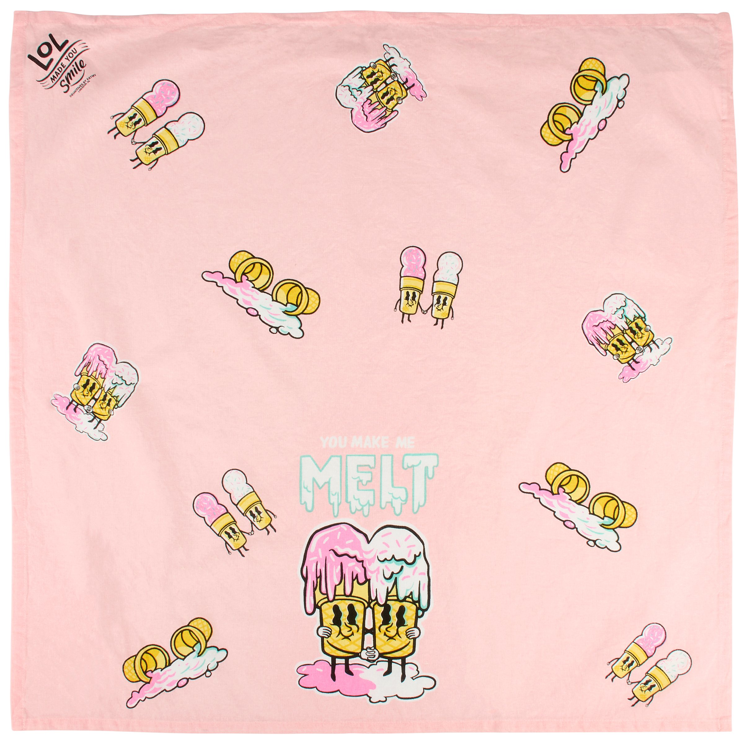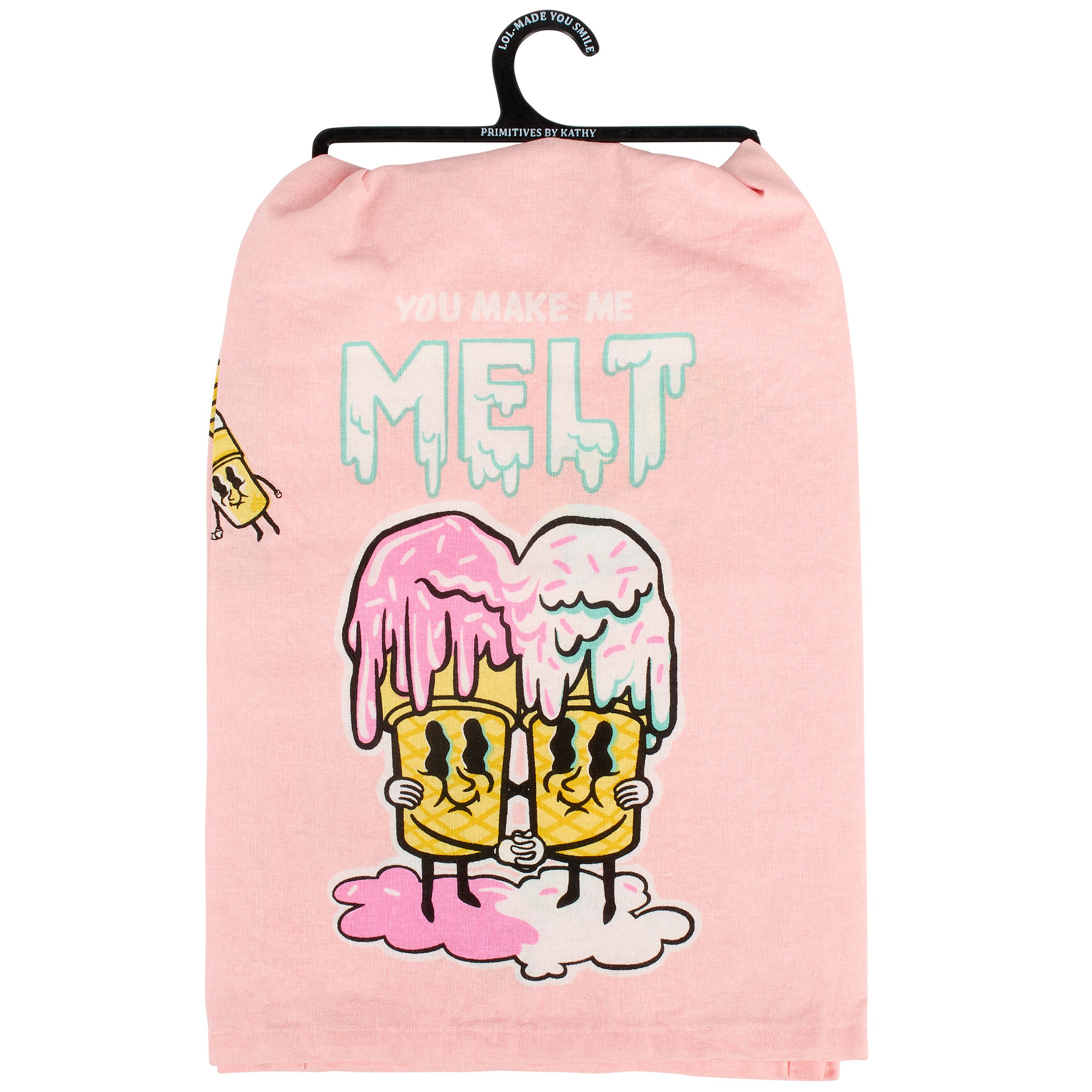 A pink cotton kitchen towel from our Valentine's Day Collection featuring an all-over design displaying playful hand illustrated ice cream cone characters with a melting ice cream cone couple on the front of the towel below a food inspired sentiment that reads "You Make Me Melt." Our You Make Me Melt kitchen towel is conveniently machine-washable for easy cleaning. Seasonal kitchen towel is packaged on a black plastic hanger to easily display on rack. A fun food-themed Valentine's Day kitchen accessory perfect for adding seasonal style to any kitchen.