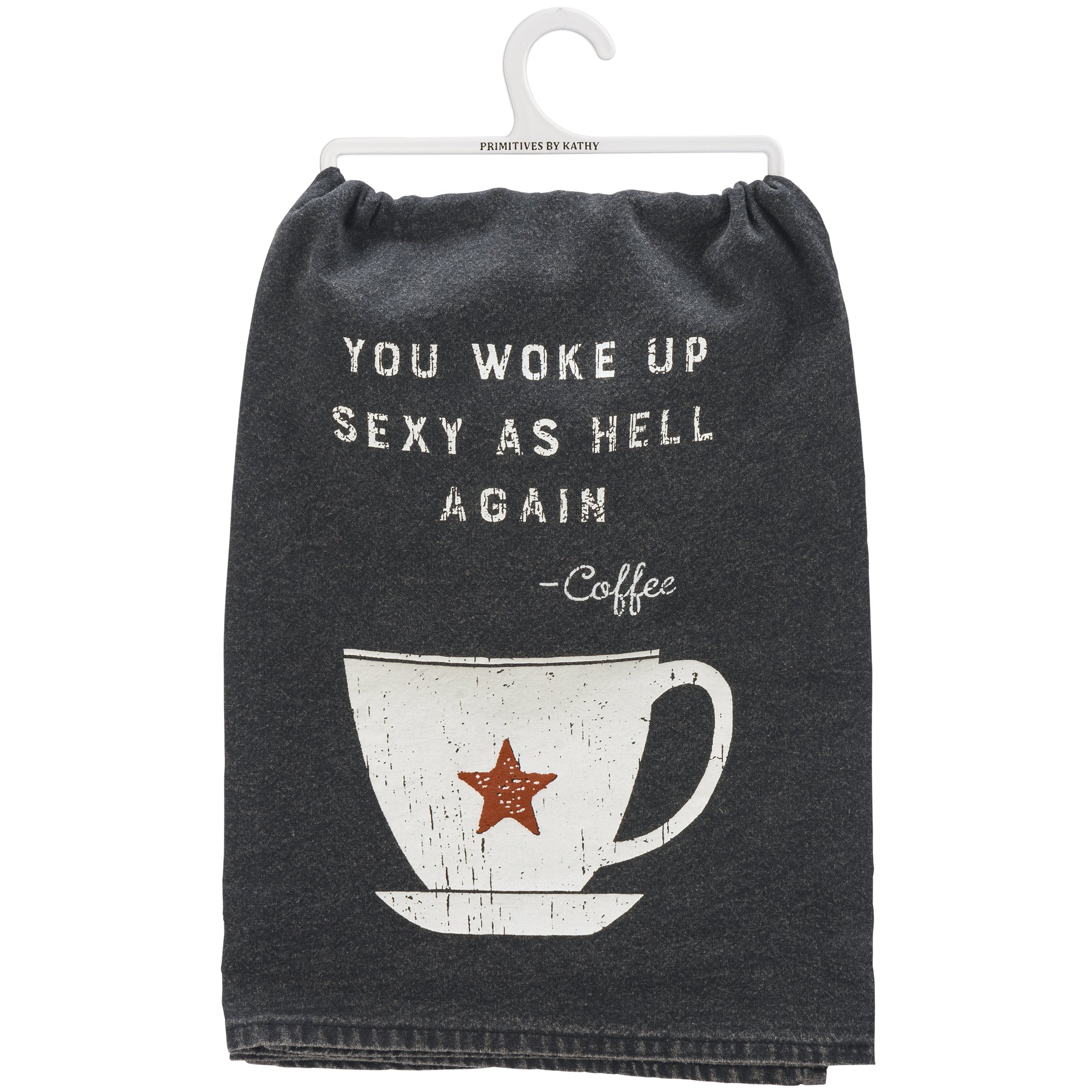 A black cotton kitchen towel featuring a distressed "You Woke Up Sexy As Hell Again - Coffee" sentiment with rustic coffee cup featuring a star design. Our You Woke Up Sexy As Hell Again kitchen towel is machine-washable.