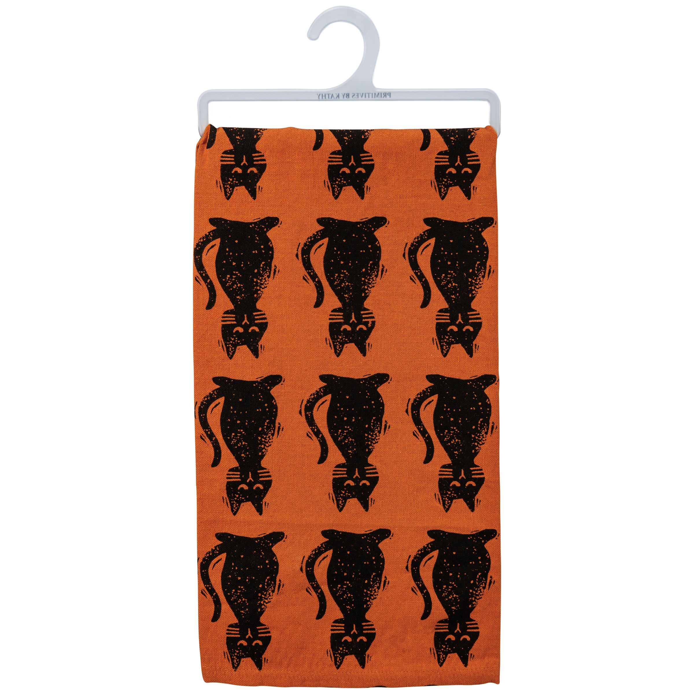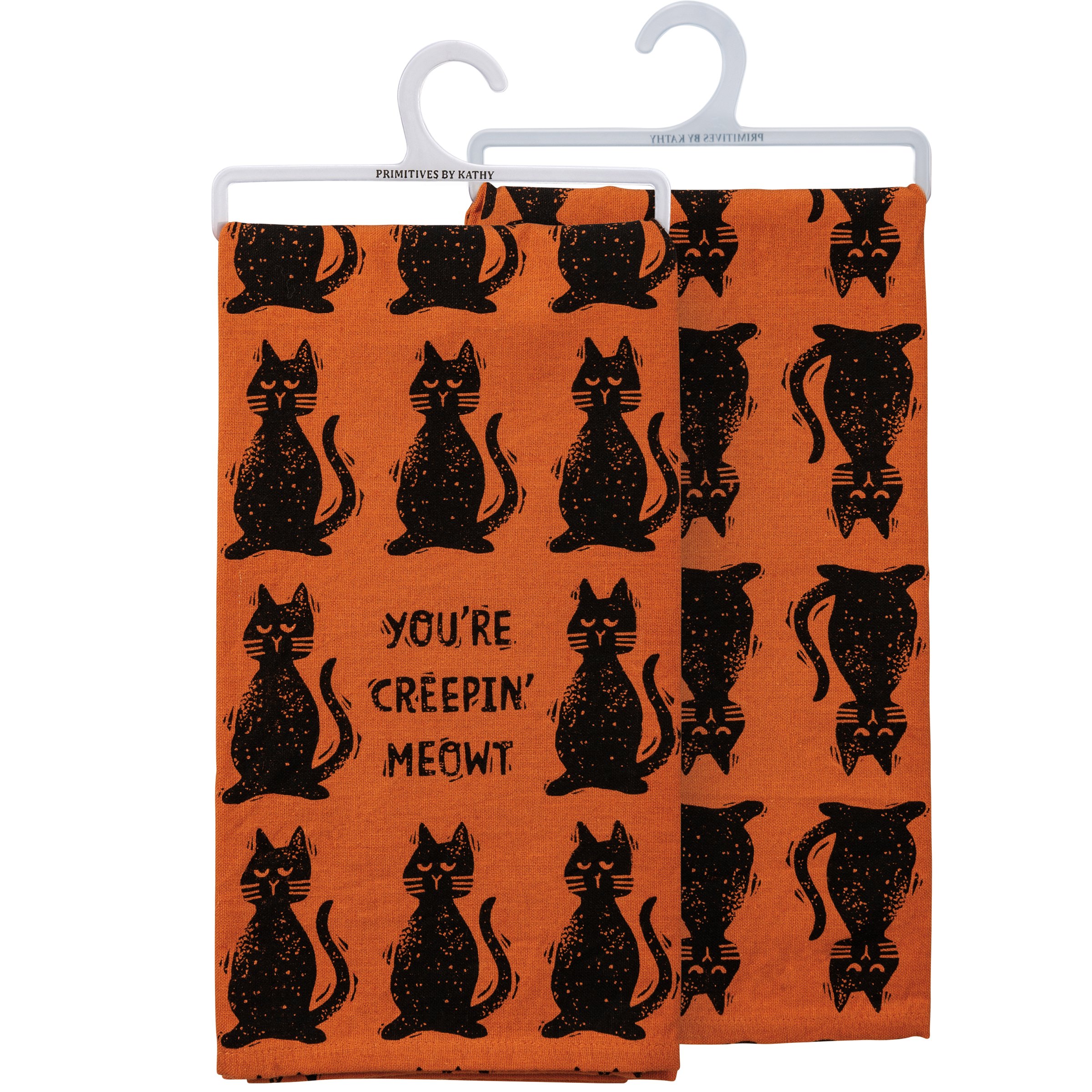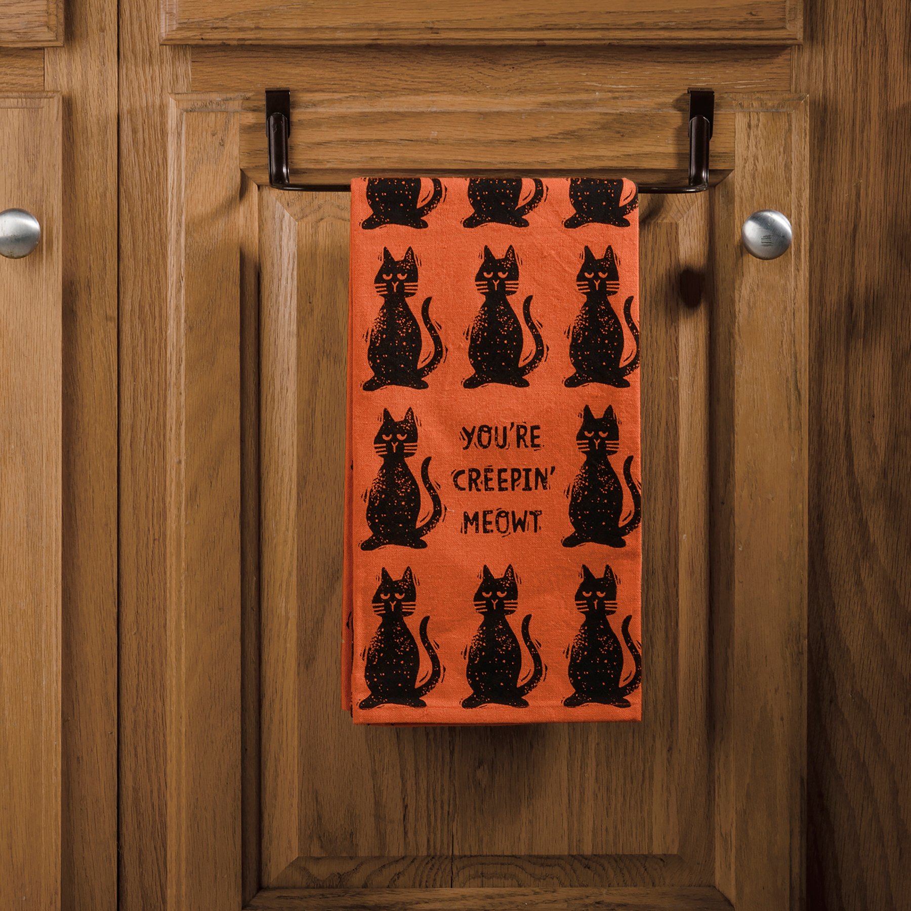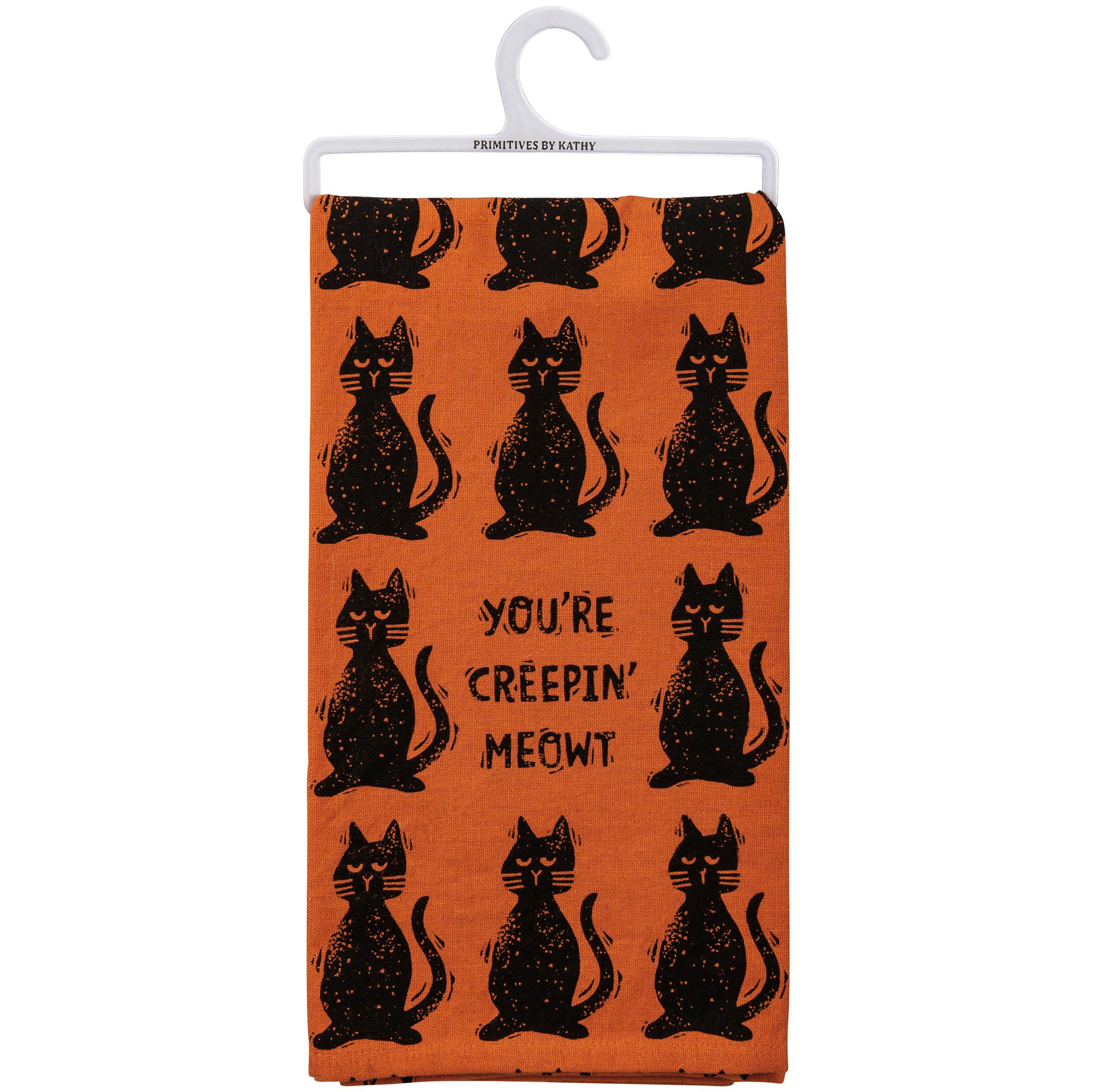 A cotton kitchen towel featuring "You're Creepin' Meowt" sentiment and all-over block print cat designs for Halloween. Machine-washable.