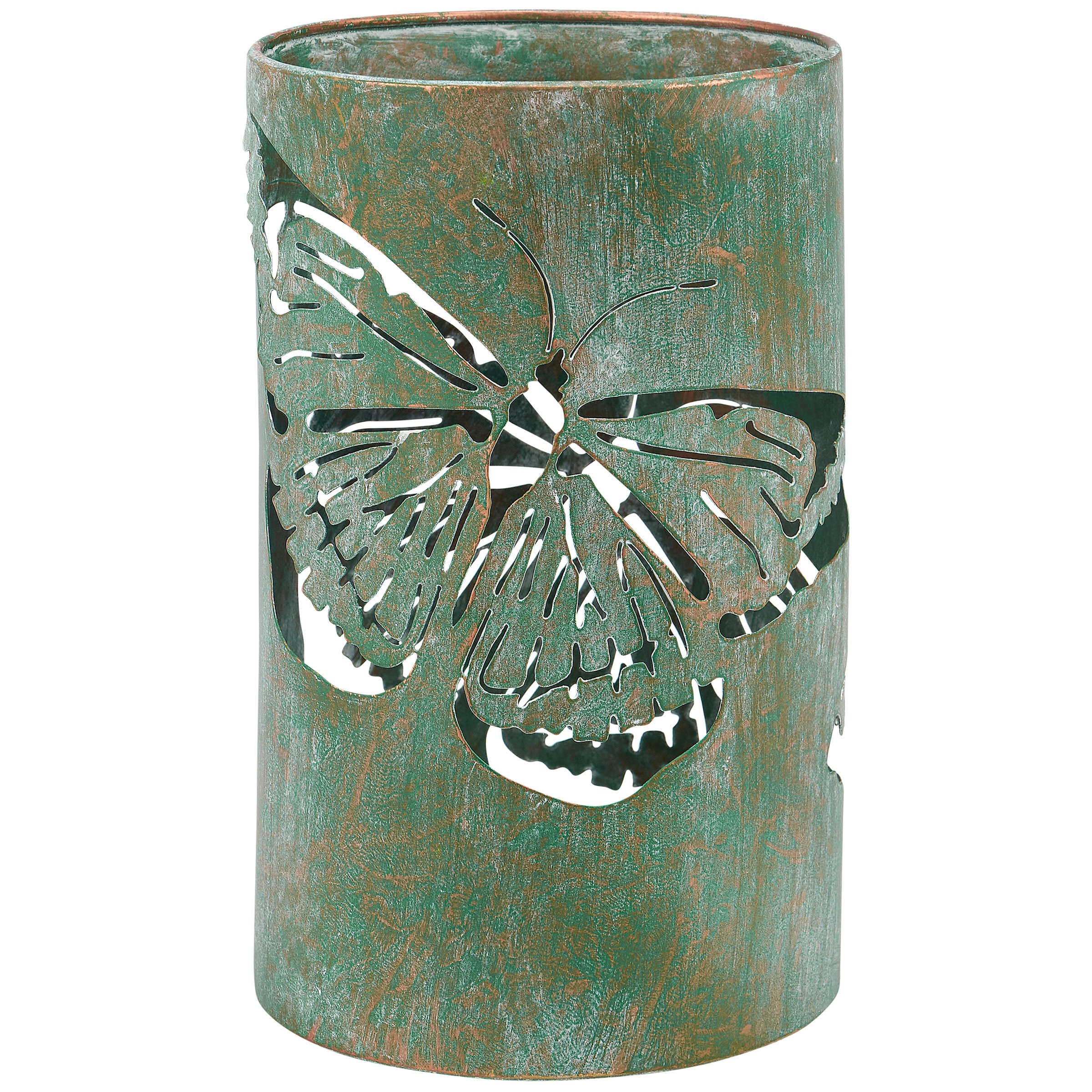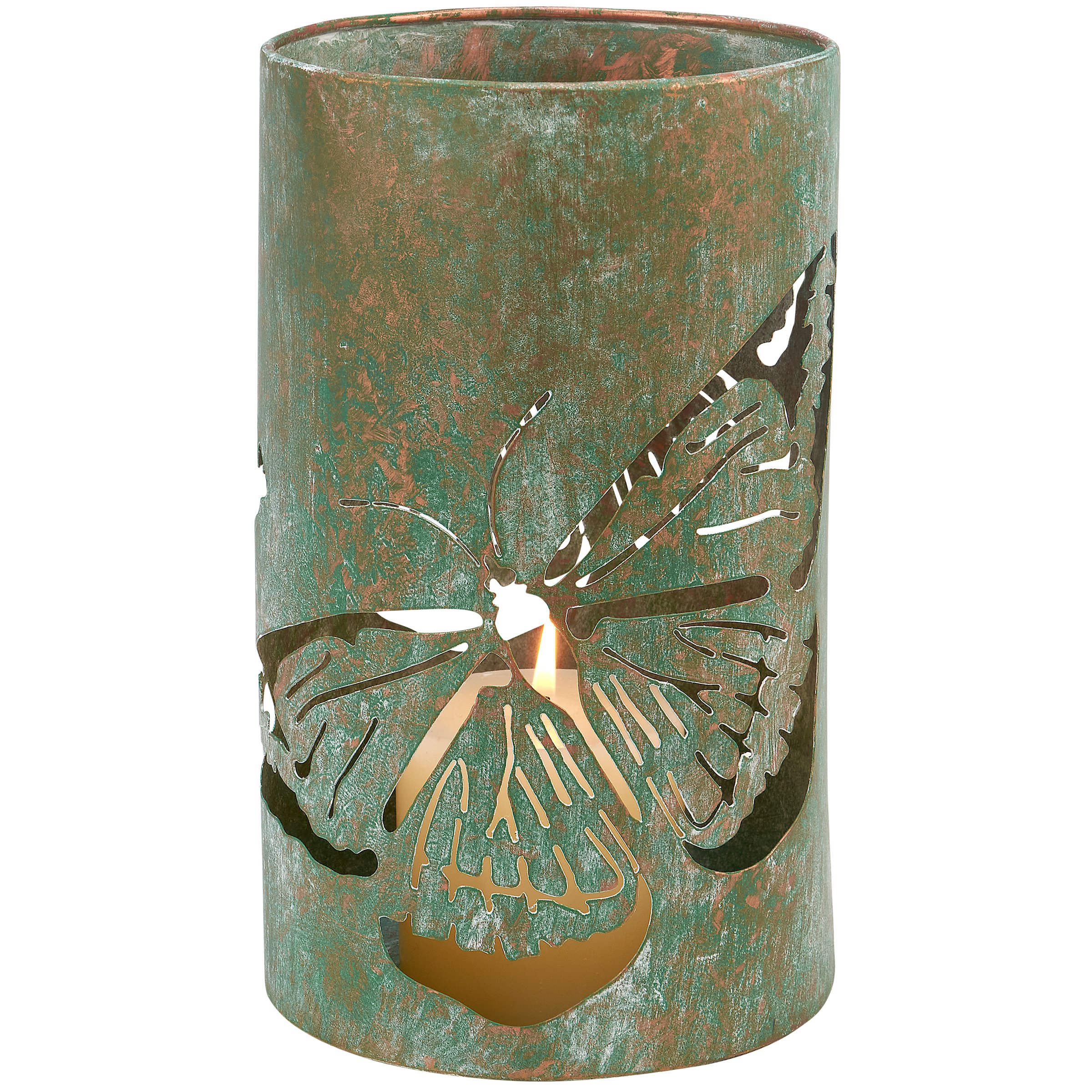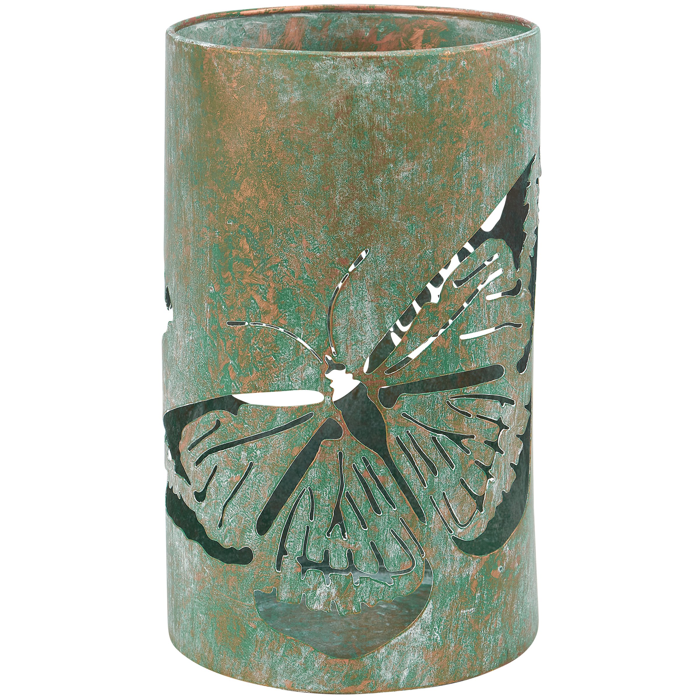 A metal lantern from our Cottagecore Collection displaying a double-sided design of a butterfly with distressed details throughout. Lantern includes space inside to place various light sources and features cutout details to illuminate designs. Candle pictured not included. Our Butterfly lantern is designed to free stand on flat surface for display. A rustic everyday home accent perfect for adding natural lighting to any space.