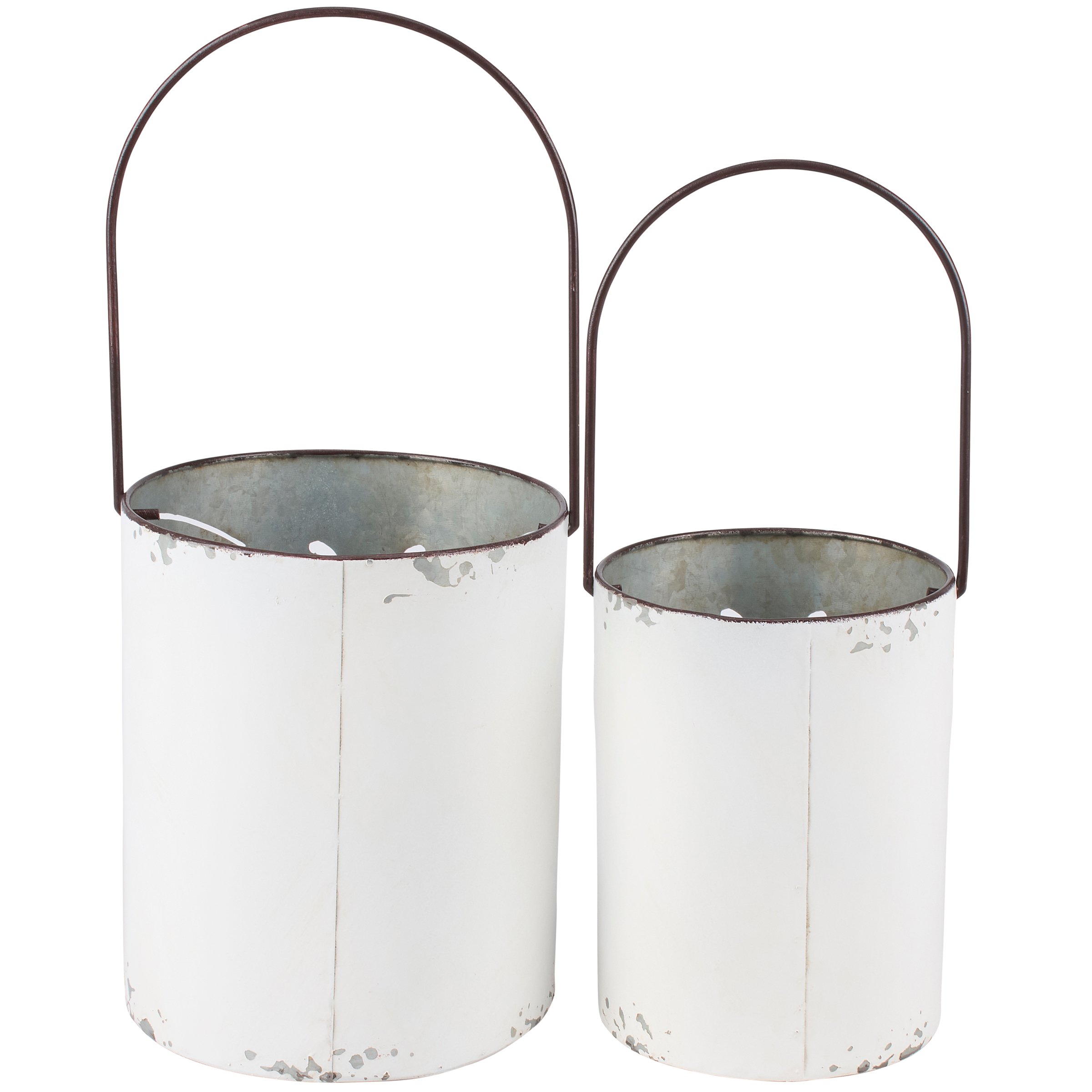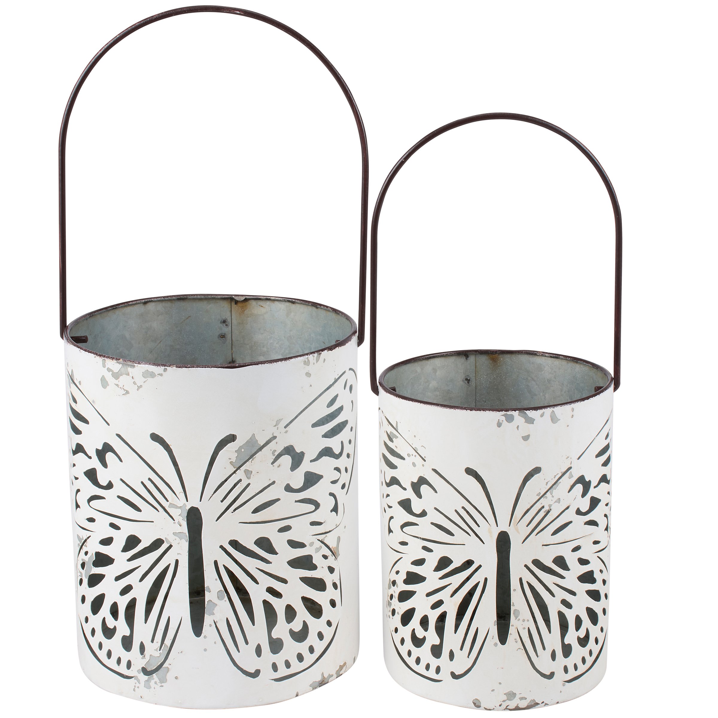 A set of metal lanterns from our Garden Collection displaying cutout designs of butterflies with distressed details throughout. Butterfly lanterns include space inside to place various light sources and features cutout details to illuminate designs. Candles pictured not included. Our Butterfly lantern set is designed to free stand on flat surface for display or hang via metal hangers. A rustic butterfly-themed home accent perfect for adding natural lighting to any space.