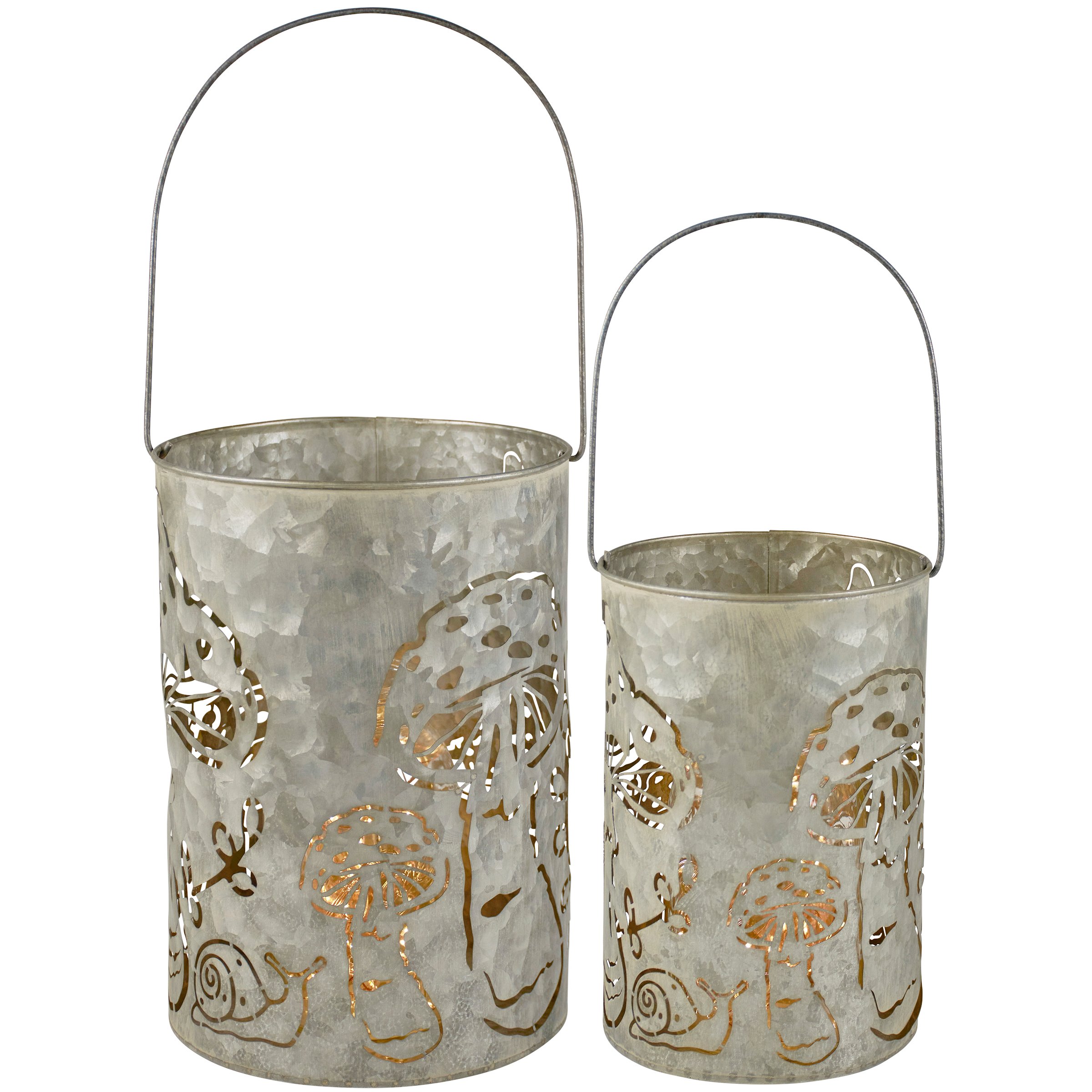 A set of galvanized metal lanterns from our Cottagecore Collection displaying a wrap-around design of mushrooms and snails. Lanterns include space inside to place various light sources and features cutout details to illuminate designs. Candles pictured not included. Set includes two different size lanterns that can nest inside each other for easy storage. Our Mushroom lantern set includes metal wire handles to carry or hang for display. A rustic everyday home accent with a variety of display options.