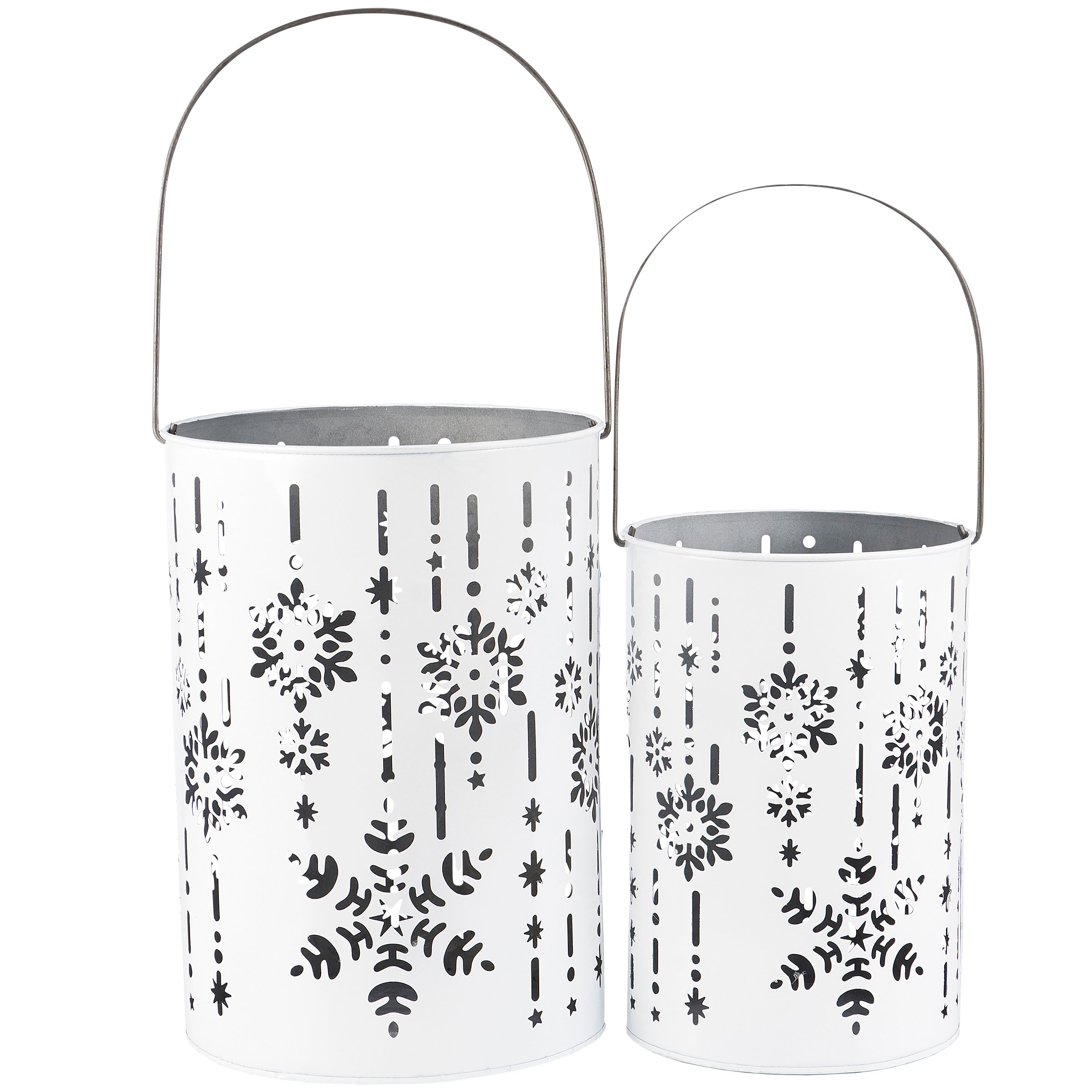 A set of metal lanterns from our Christmas Collection displaying wrap-around snowflake designs with white paint finish. Lanterns include space inside to place various light sources and features cutout details to illuminate snowflake designs. Candles pictured not included. Set includes two different size lanterns that can nest inside each other for easy storage. Our Snowflakes lantern set includes metal wire handles to carry or hang for display. A rustic seasonal home accent with a variety of display options.