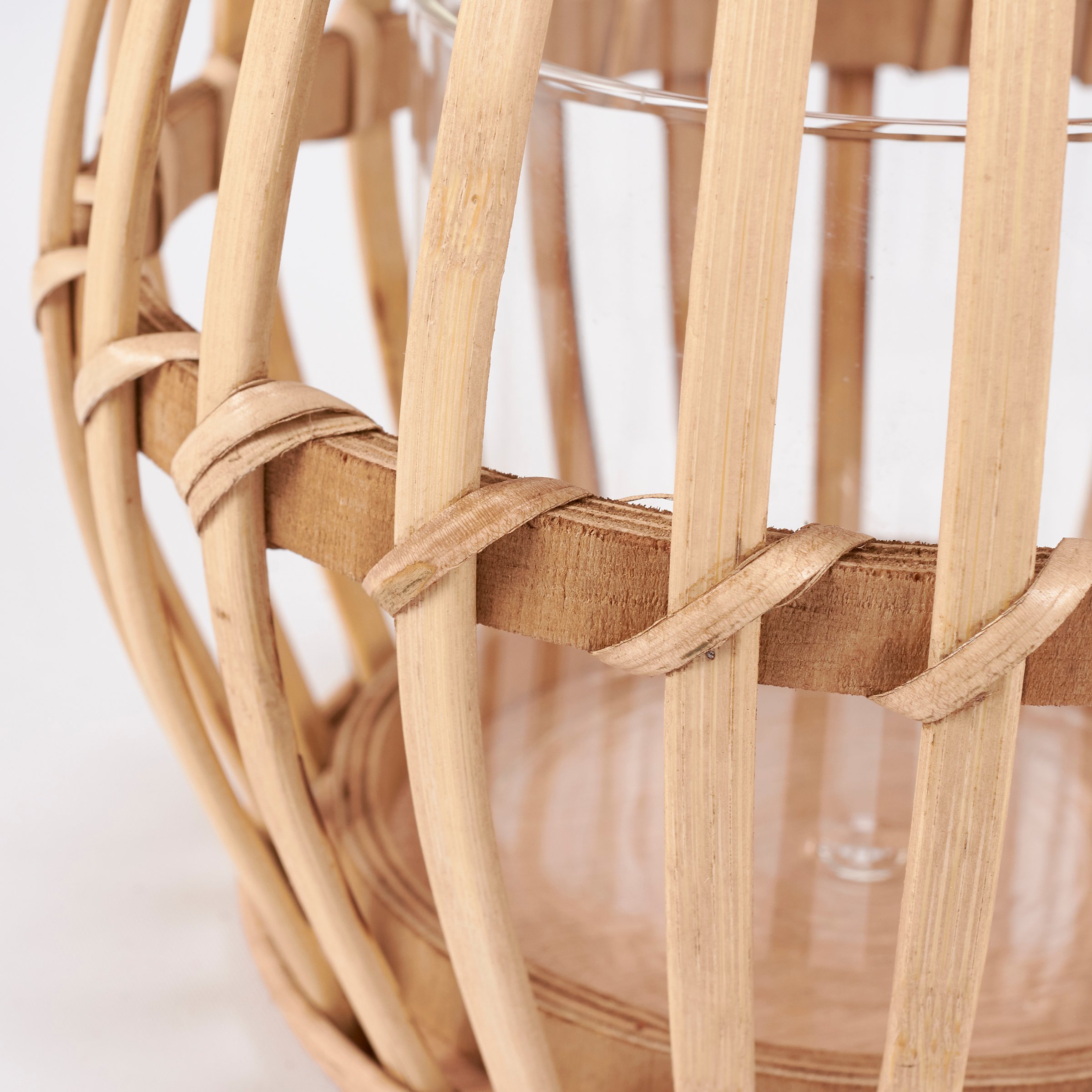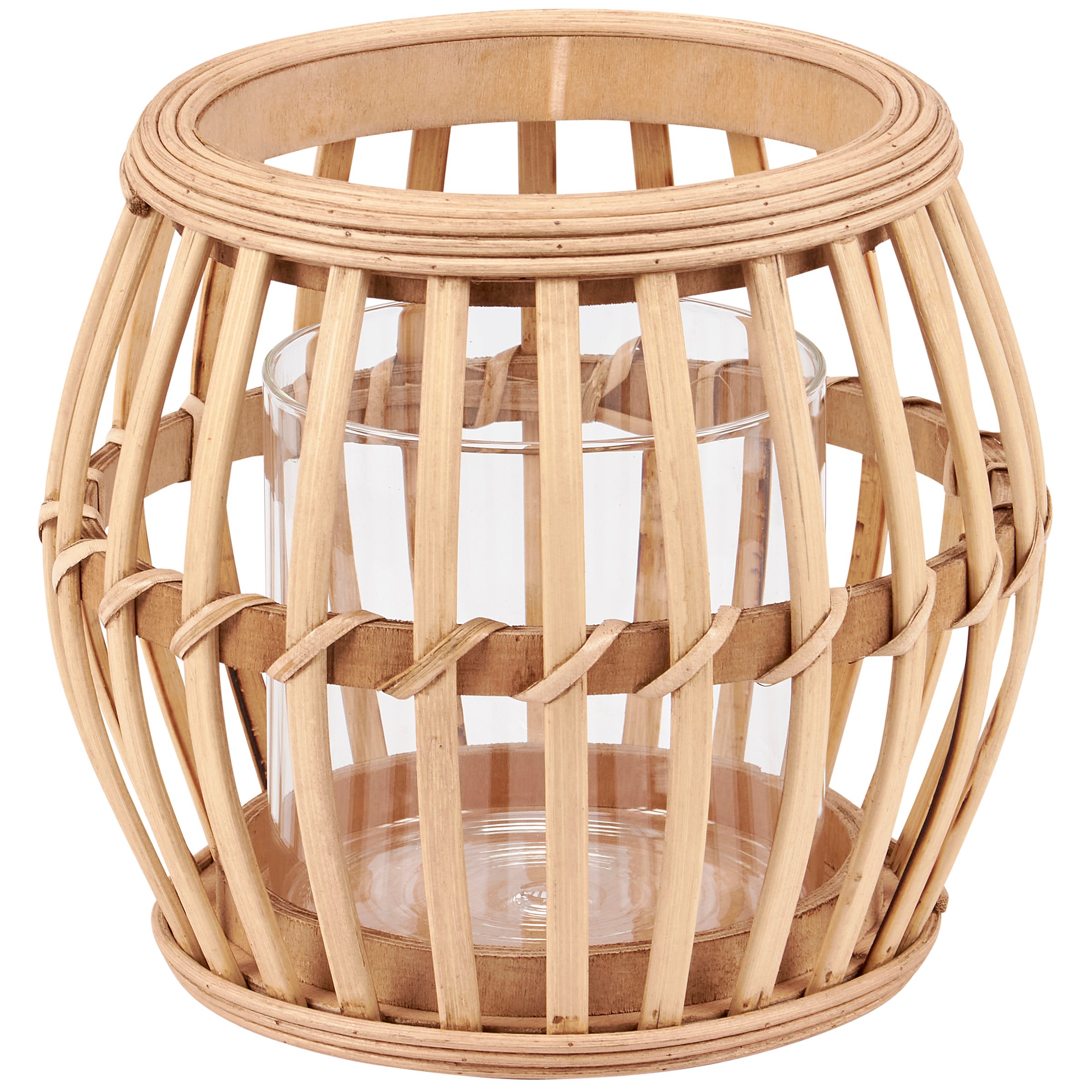 A small lantern from our Home Collection displaying a lattice bamboo design in a neutral color palette. Lantern includes a built-in space inside to hold the included removable glass holder to place various light sources through round opening in the top. Candle pictured not included. Our small Bamboo lantern is a beach-themed everyday home accent perfect for adding natural lighting to any space.