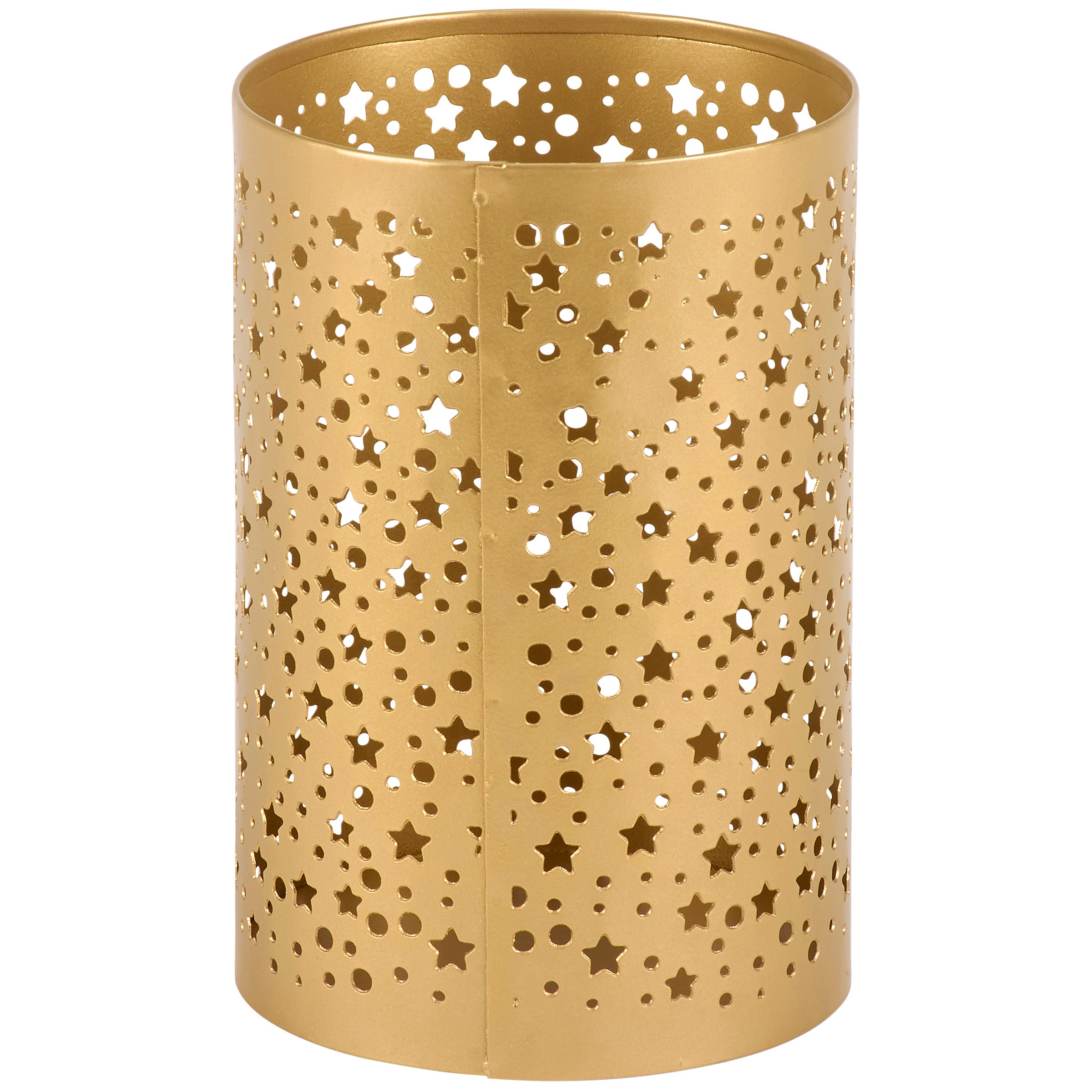 A metal lantern from our Starry Night Collection displaying a full wrap around design of star cutouts resembling a starry night sky. Lantern includes space inside to place various light sources and illuminate cutout designs. Candle pictured not included. Our Starry Night lantern is designed to free stand on flat surface for display. A stylish Christmas home accent perfect for adding natural lighting to any space.