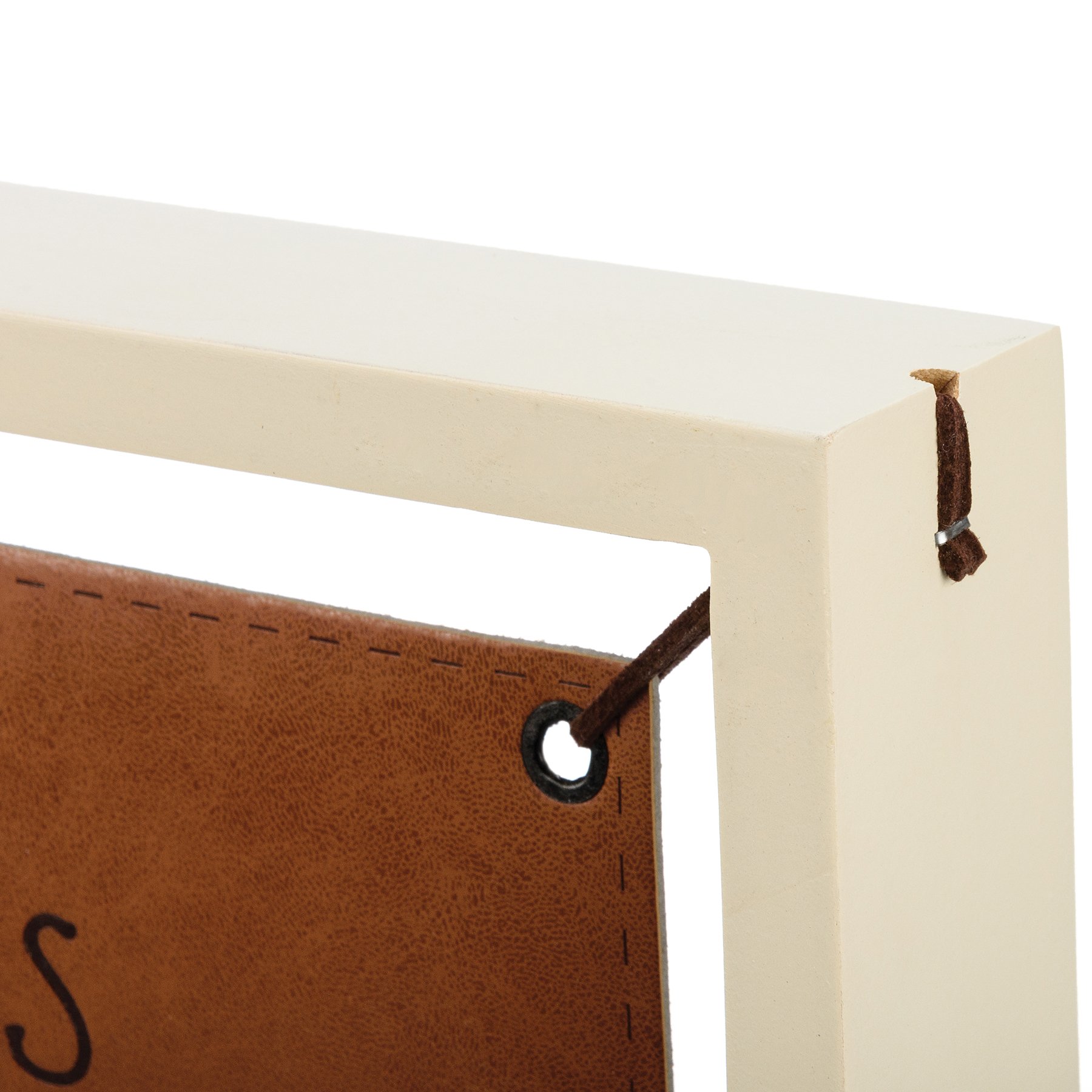 Add a sophisticated touch to your home office with this leather wall art featuring a hand lettered debossed "Work Is Where The Home Is" sentiment. Faux leather is suspended from corners of wood frame via straps looped through metal grommets. Wall art is easy to display using included sawtooth hanger or can free-stand alone.