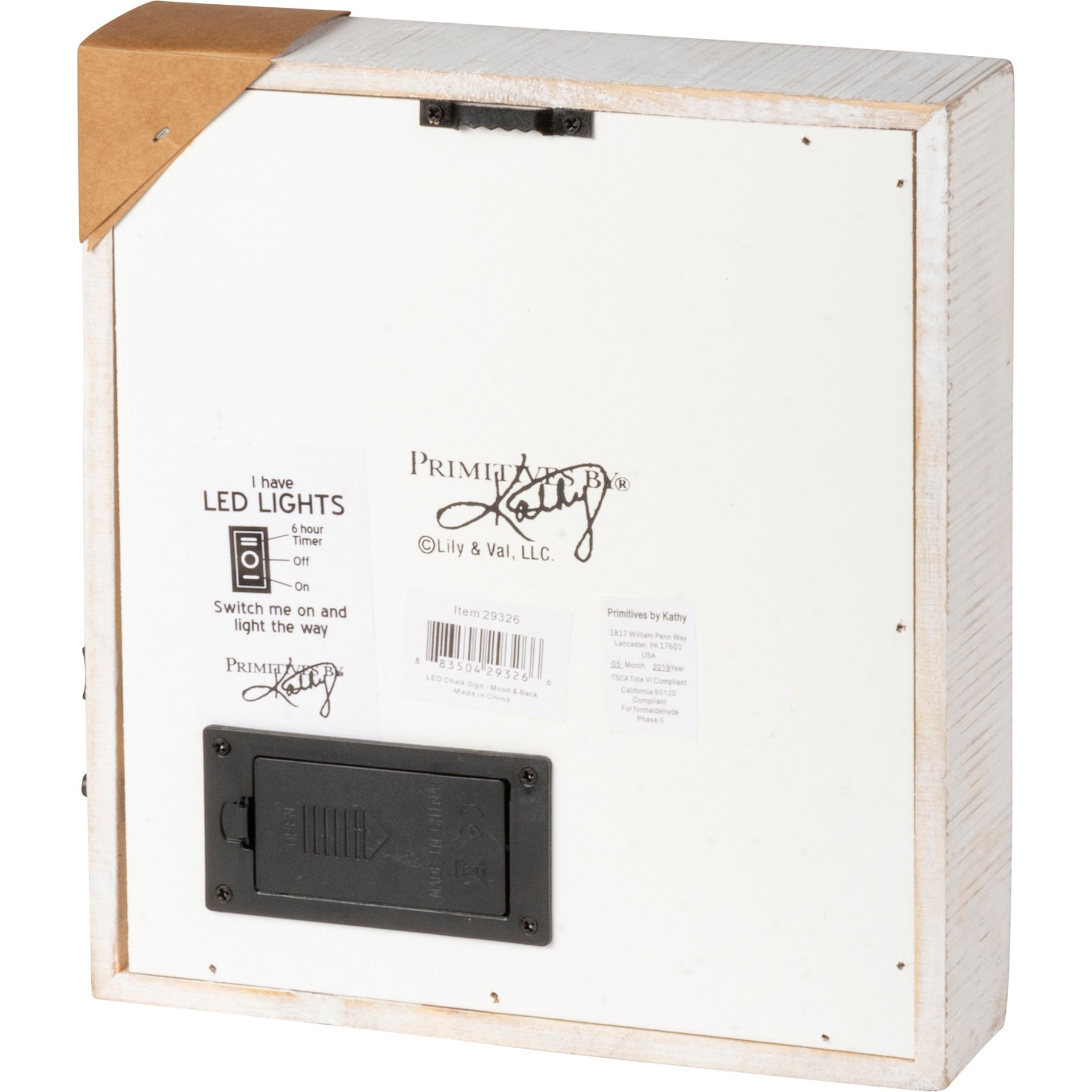 A wooden inset box sign lending a chalk art "Love You To The Moon & Back" sentiment with moon and star designs and light up details. Easy to hang or can free-stand alone. Contains a 6-hour timer; takes 2 AA batteries (not included).